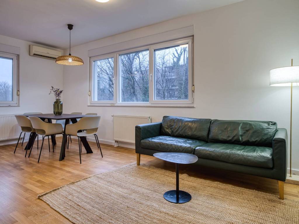 Daje se u dugoročan najam luksuzni novouređeni trosoban stan površine 82 m2, smješten na prvom katu moderne stambene zgrade u naselju Remete, ulica Črešnjevec.