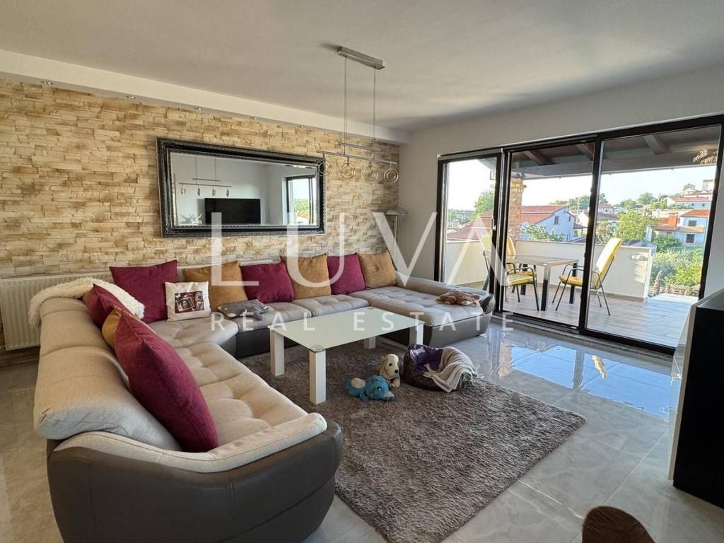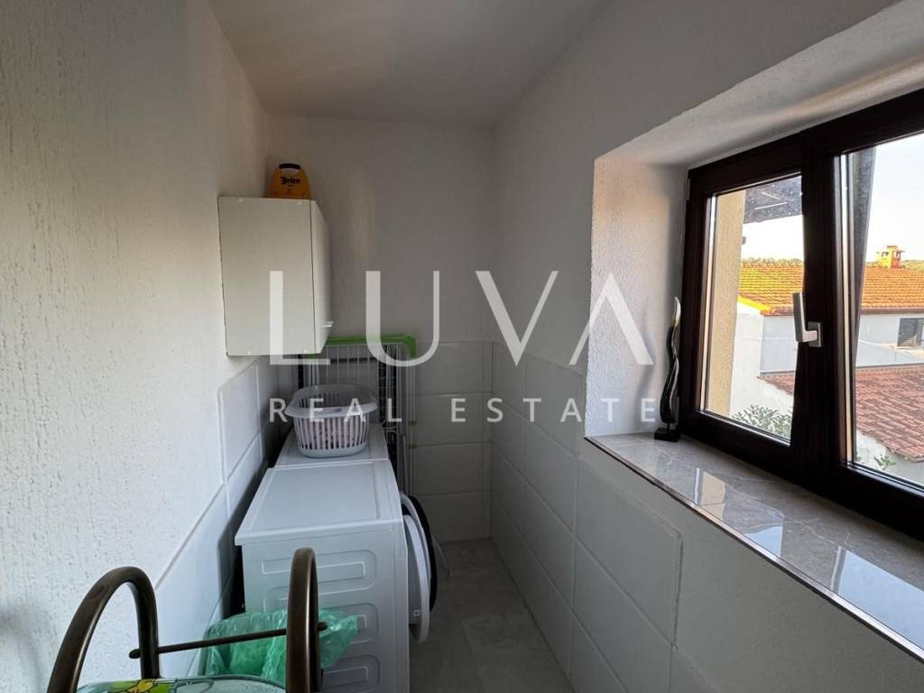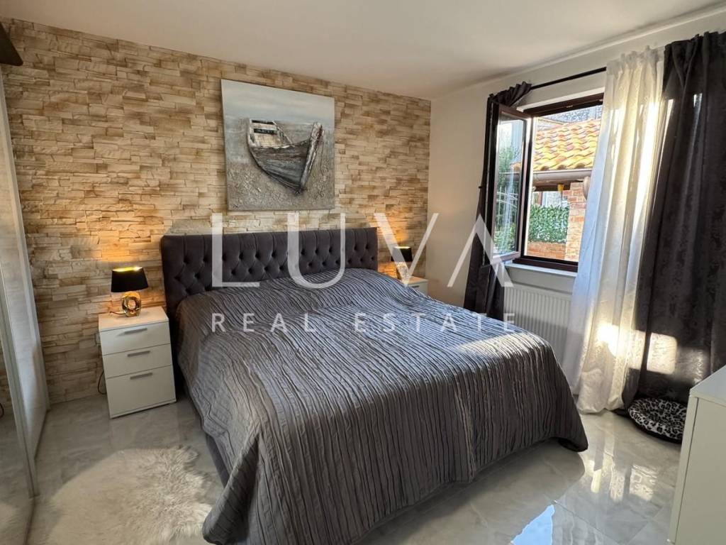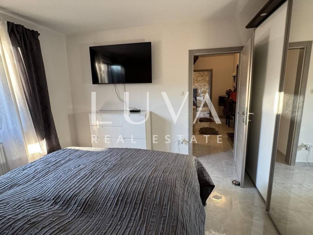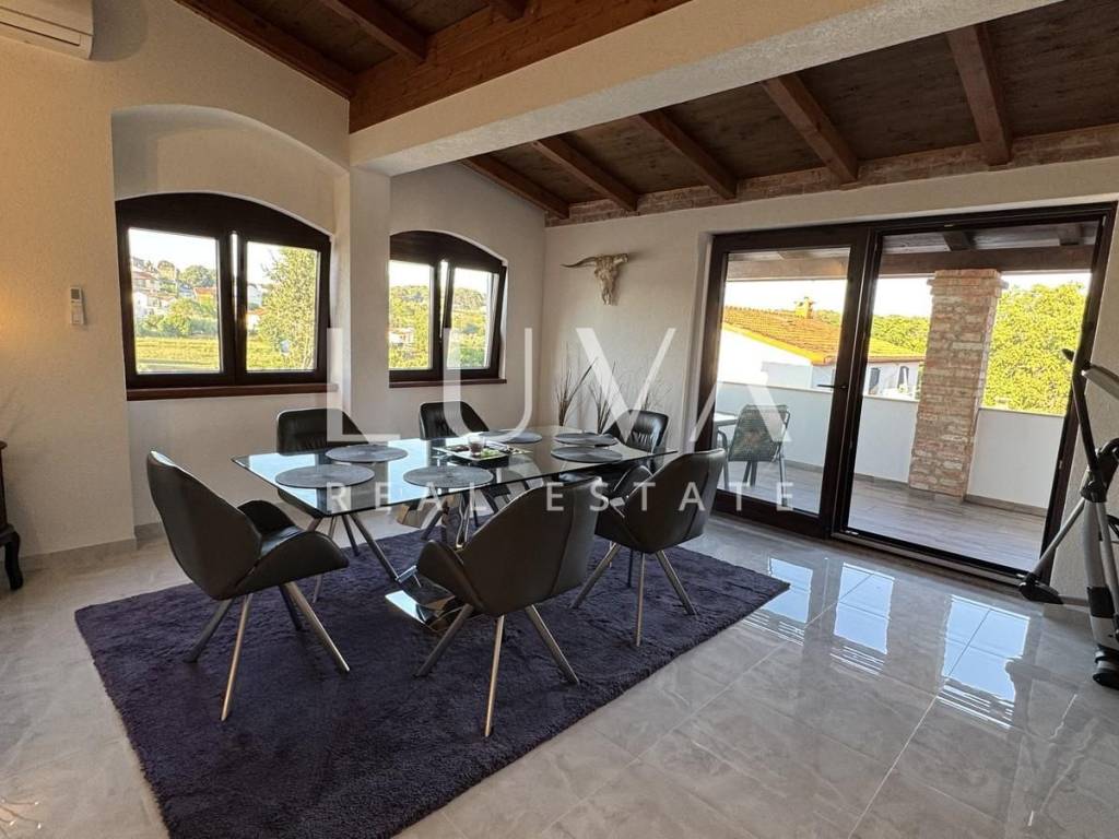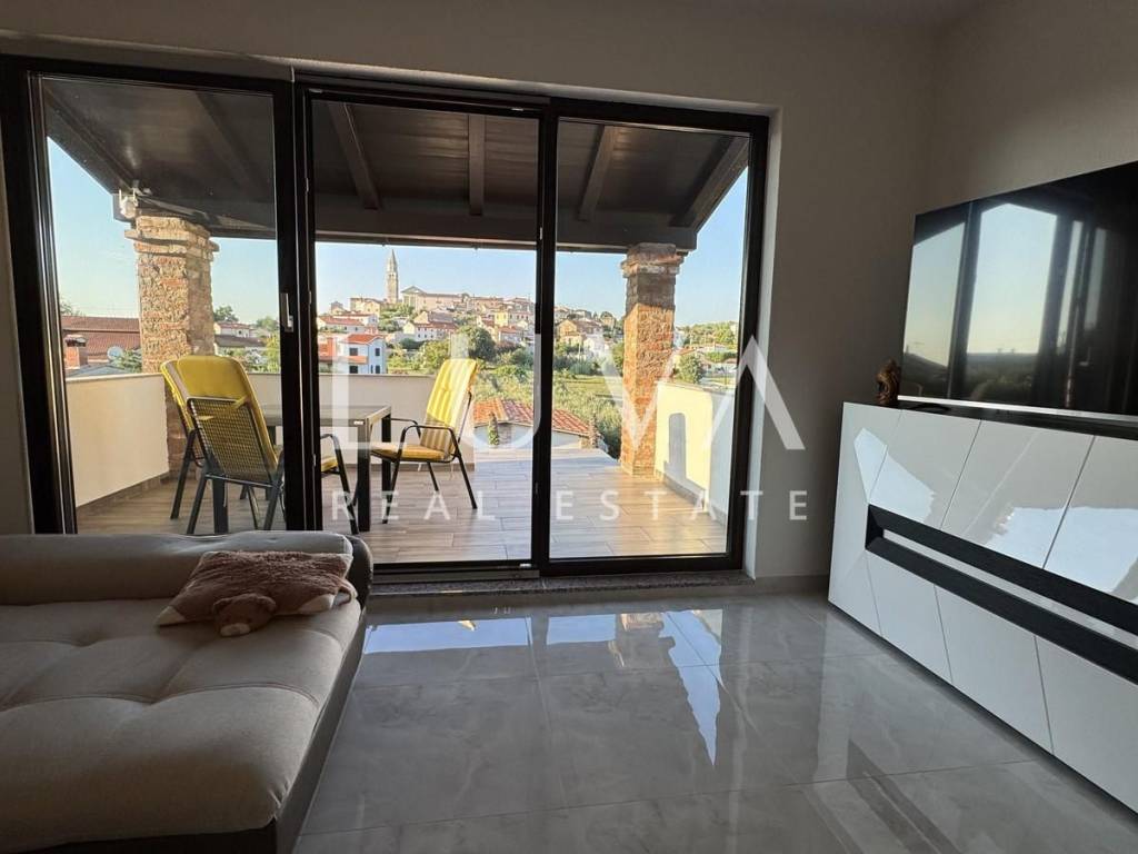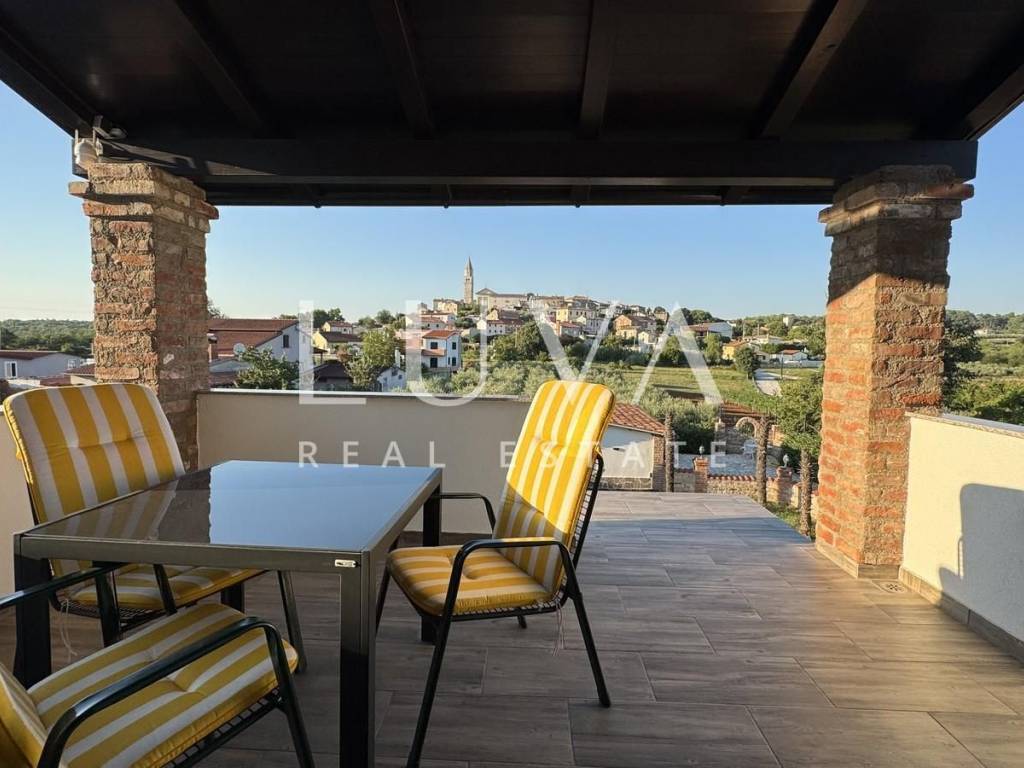 Das Hauptapartment verfügt über einen geräumigen Eingangsflur, zwei Schlafzimmer, ein Badezimmer, eine geräumige moderne Küche mit Stauraum, ein helles Wohnzimmer mit einem bezaubernden Blick auf Višnjan, zwei Terrassen zum Genießen des mediterranen Klimas und ein geräumiges Esszimmer für Familientreffen.