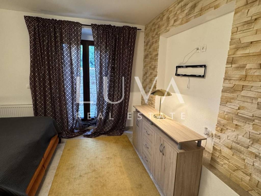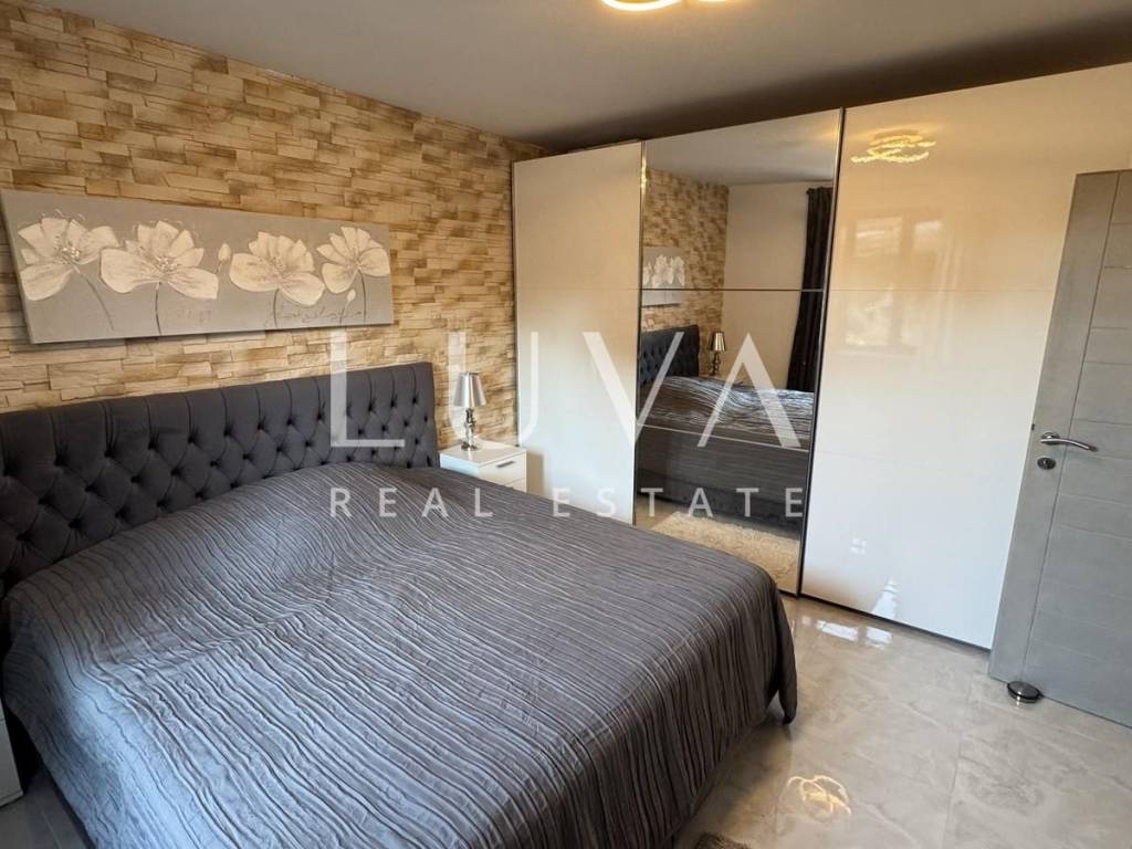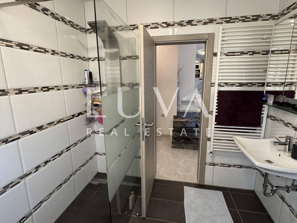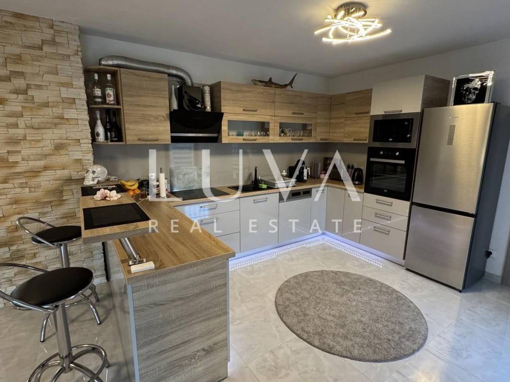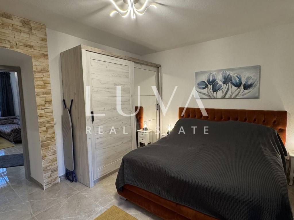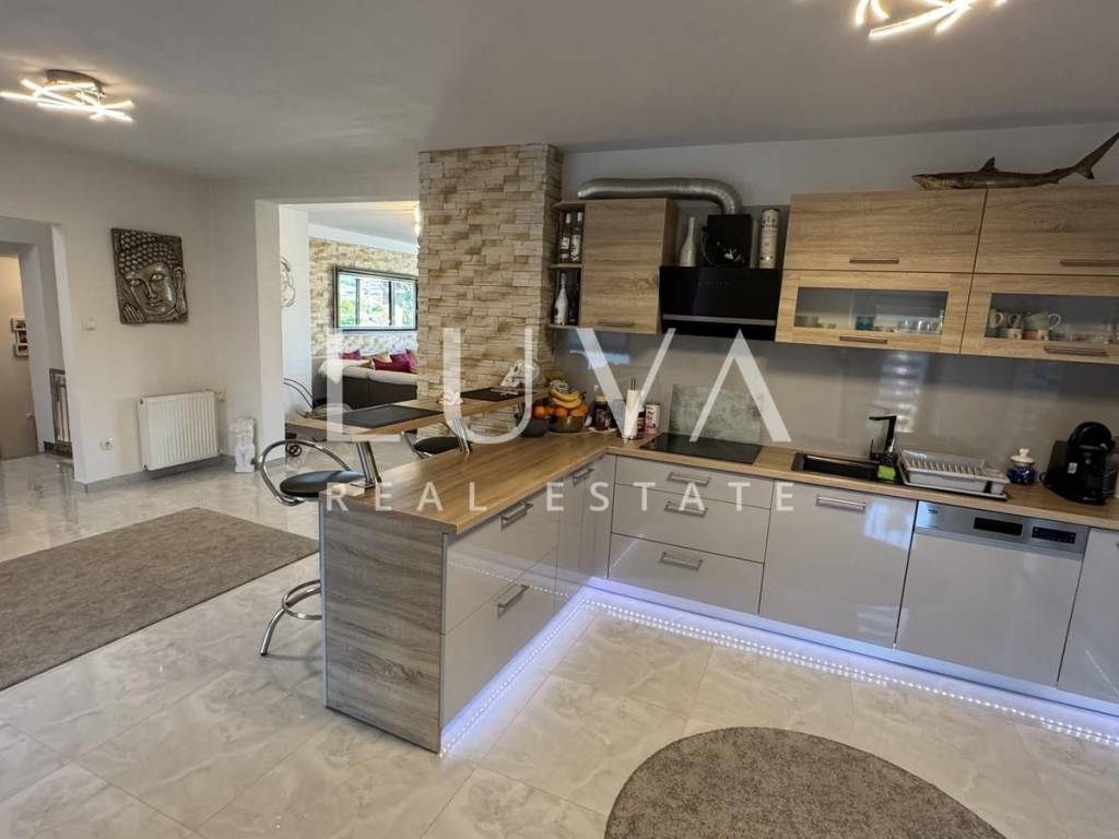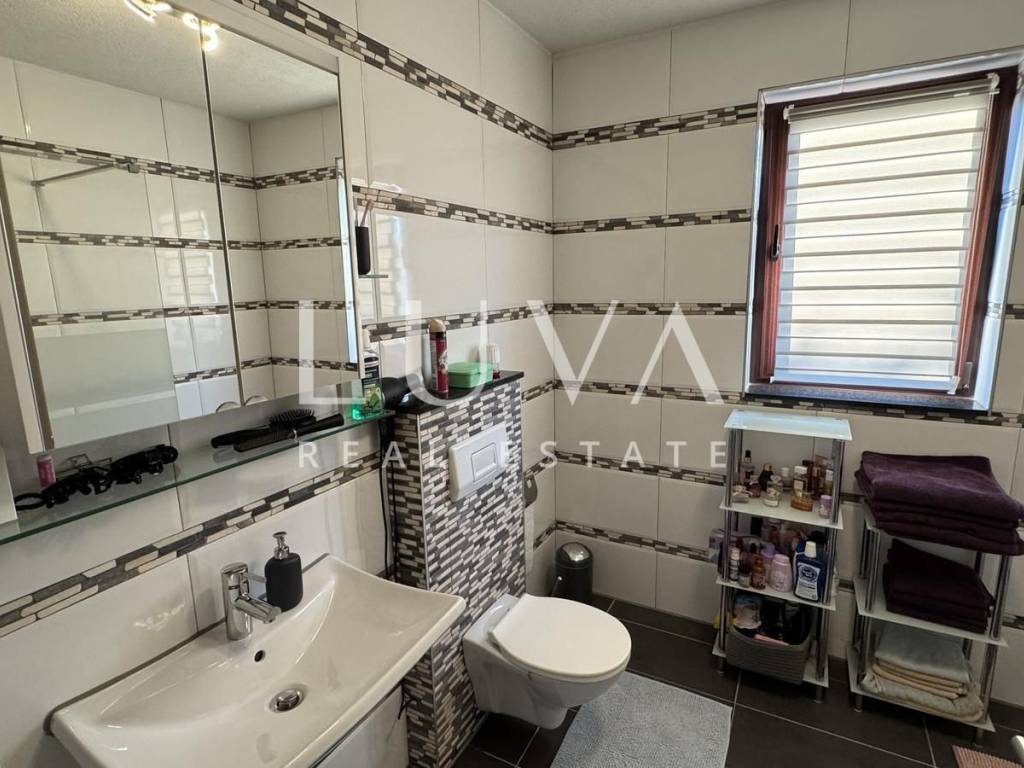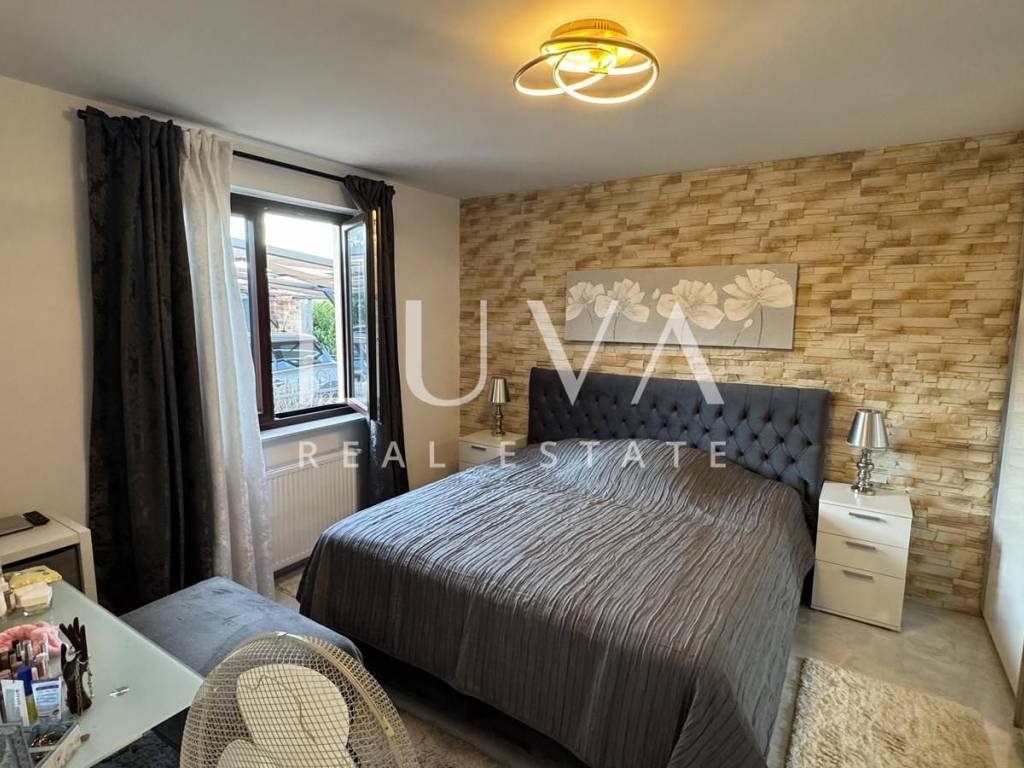 Das Hauptapartment verfügt über einen geräumigen Eingangsflur, zwei Schlafzimmer, ein Badezimmer, eine geräumige moderne Küche mit Stauraum, ein helles Wohnzimmer mit einem bezaubernden Blick auf Višnjan, zwei Terrassen zum Genießen des mediterranen Klimas und ein geräumiges Esszimmer für Familientreffen.