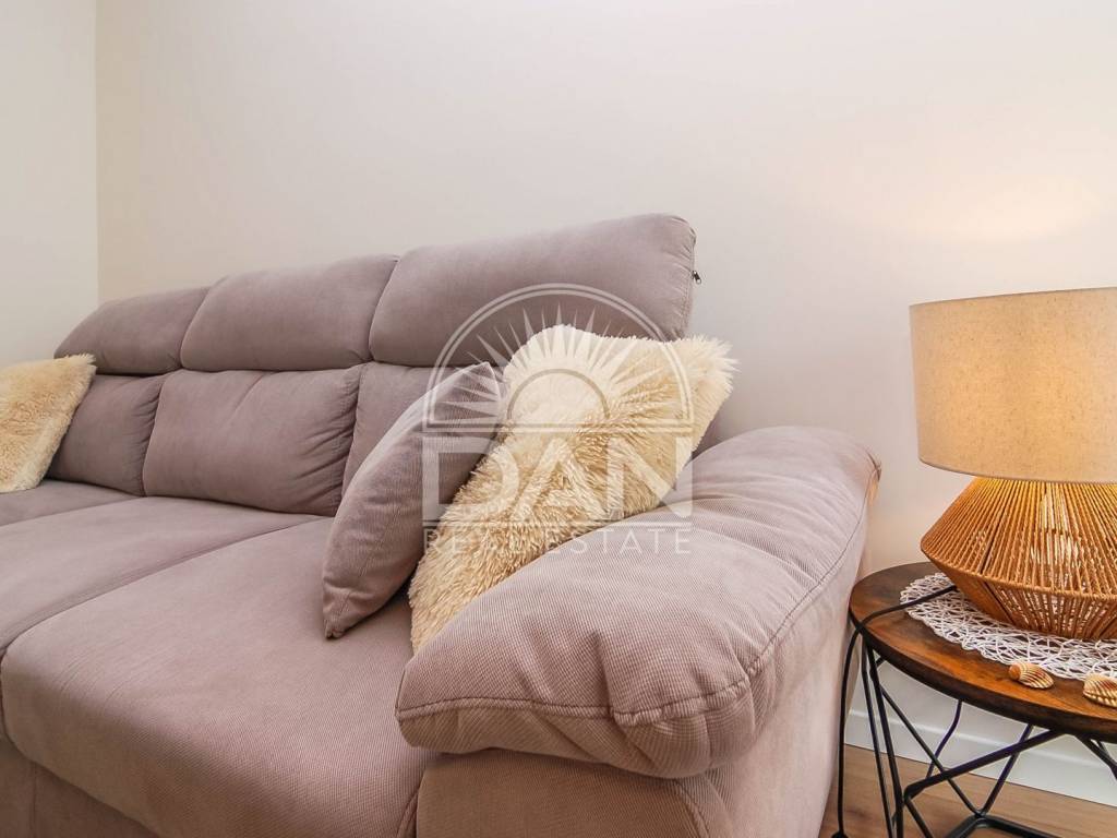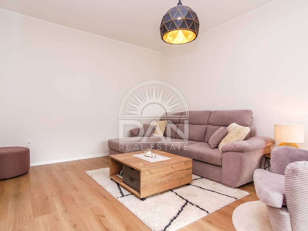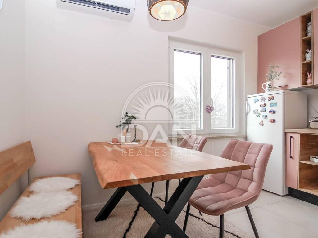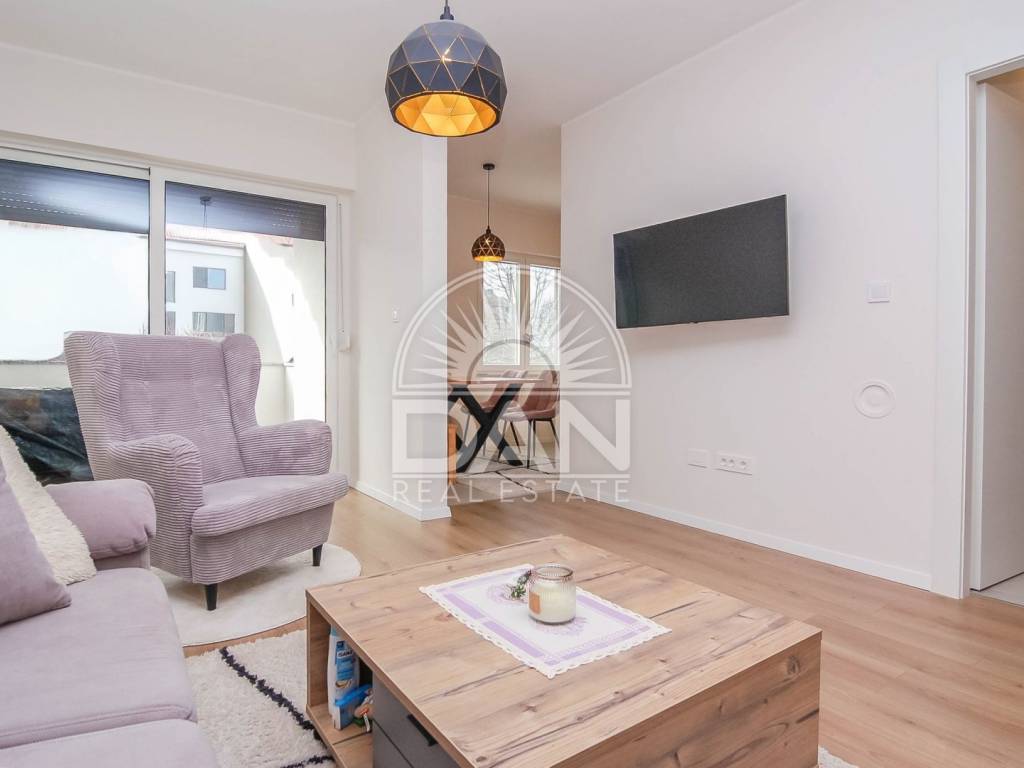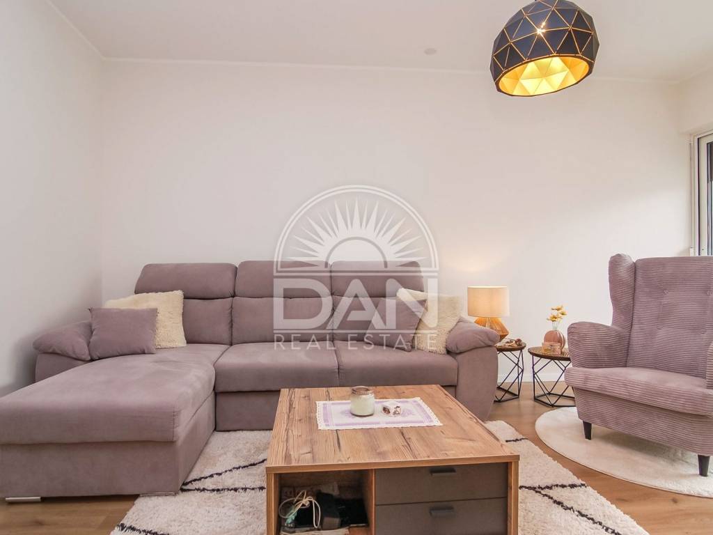Die Wohnung wurde im Jahr 2023 vollständig und hochwertig renoviert. Im Zuge der Renovierung wurden neue PVC-Fenster und Türen eingebaut, das Badezimmer erneuert und die gesamte Wohnung modern und funktional gestaltet, sodass zukünftige Eigentümer ohne zusätzliche Investitionen einziehen können. Die Raumaufteilung ist klassisch und sehr komfortabel für den Alltag. Der Eingangsbereich führt zu einem geräumigen Schlafzimmer und einem schön renovierten Badezimmer, während sich auf der anderen Seite der Wohnung eine Küche mit Essbereich, ein Abstellraum sowie das Wohnzimmer befinden, von dem aus große Balkontüren auf die Terrasse führen. Die Wohnung ist angenehm, hell und sehr funktional und dank der südlichen Ausrichtung erhält sie das ganze Jahr über viel natürliches Licht und Wärme. Die Beheizung und Kühlung erfolgt über zwei Klimaanlagen, im Schlafzimmer befindet sich zusätzlich eine Heizung und im Badezimmer ein Wandheizkörper.