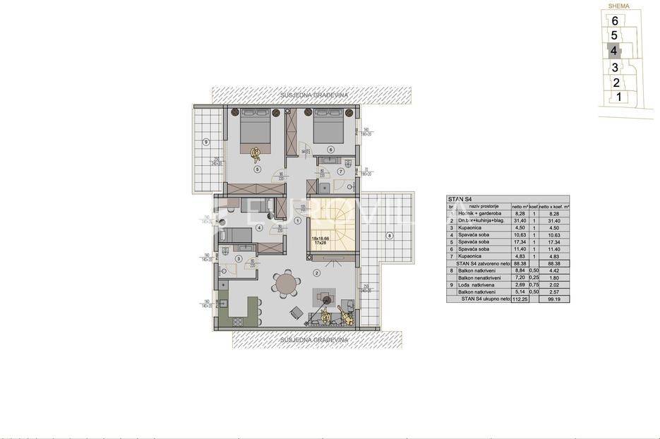Predstavljamo izniman višestambeni projekt u naselju Kaštanjer. Kompleks se sastoji od šest zgrada, svaka s četiri stambene jedinice, smještenih u privatnoj slijepoj ulici. Projekt nudi savršen spoj urbanog života i mirnog okruženja, idealnog za obiteljski život.Nudimo trosobni stan oznake S4, smješten na drugom katu Zgrade 4. Ovaj dom površine 106.76 m² osmišljen je za maksimalnu udobnost i funkcionalnost. Sastoji se od ulaza, tri spavaće sobe, open space dnevnog boravka integriranog s kuhinjom i blagovaonicom od 31,40 m2, dvije kupaonice. Poseban naglasak stavljen je na natkriveni balkon od te loggie, kao i dodatnog natkrivenog balkona iz master spavaće sobe, idealni za opuštanje.Uz stan dolaze vanjsko spremište SPR. 4 i dva osigurana vanjska parkirna mjesta. Stambeni prostor iznosi 109.04 m², dok ukupna kvadratura s pripadajućim dijelovima doseže 116.14 m². Postoji i mogućnost kupovine natkrivenog parkirnog mjesta uz dodatnu nadoplatu.Stan se prodaje po principu "ključ u ruke", spreman za useljenje. Kvaliteta gradnje i opreme je na najvišoj razini: kupaonica ima podno grijanje, a dnevni boravak inverter klima uređaj. Dimnjak omogućuje postavljanje peći na drva ili pelete (opcija nadoplate za podno grijanje u cijelom stanu). Ugrađena je PVC stolarija s električnim podizačima roleta na balkonu. Interijer je oplemenjen prvoklasnom keramikom i laminatom.Predviđeni završetak radova je proljeće 2027. godine.Kupac je oslobođen plaćanja poreza na promet nekretnina, što predstavlja značajnu uštedu. Ova nekretnina je izvanredna prilika za moderan, udoban i kvalitetan dom na prestižnoj lokaciji u Puli, s naglaskom na luksuzan životni stil.Za sve dodatne informacije ili dogovor oko razgleda, naš tim stoji Vam na raspolaganju.... Više na eurovilla.hr, ID: 159105