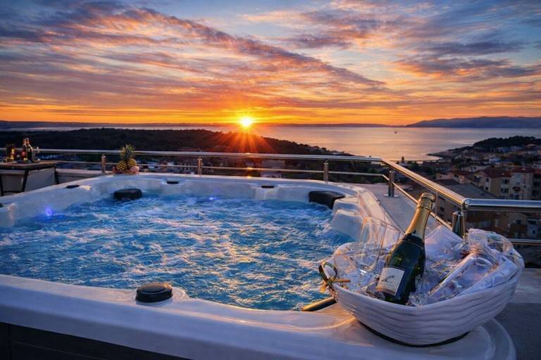Eine private Dachterrasse mit freiem Meerblick.