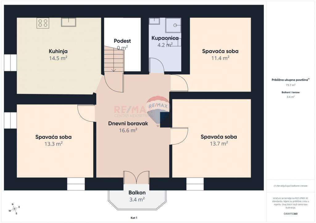 Über Außentreppen gelangt man in den Wohnbereich, der aus zwei Wohnungen, jeweils 75 m², im ersten und zweiten Stock besteht.