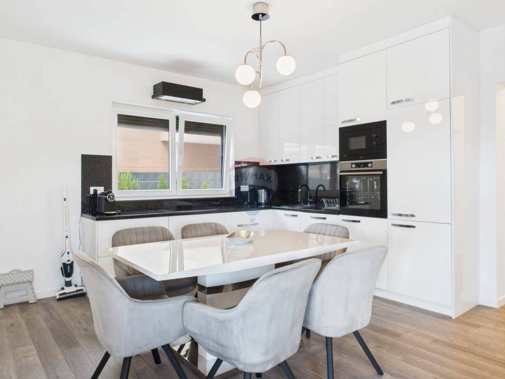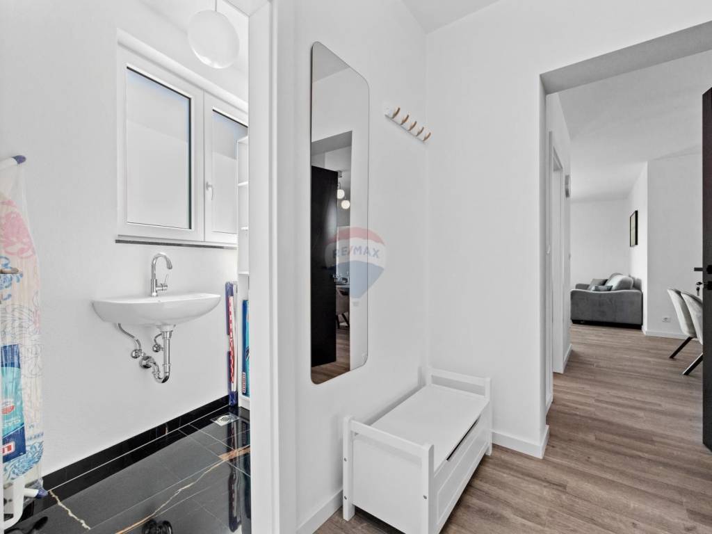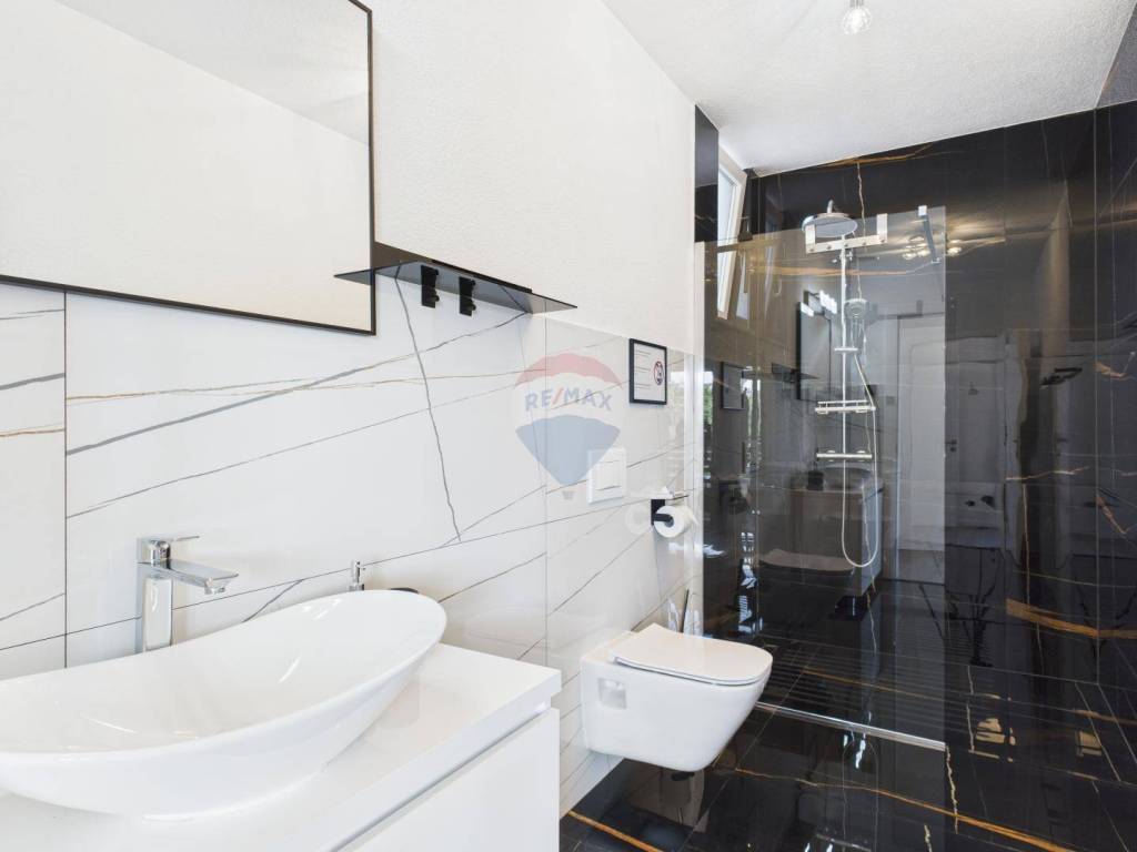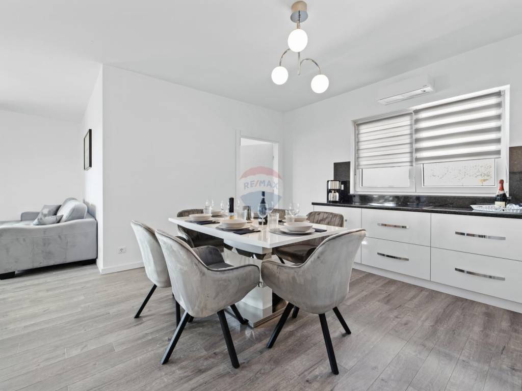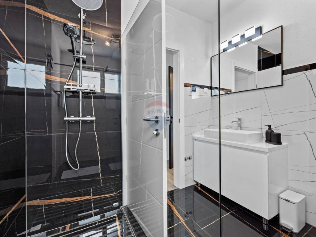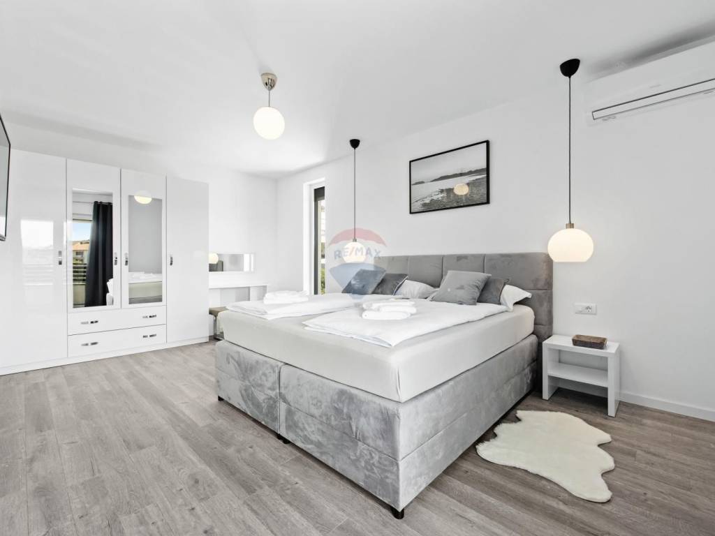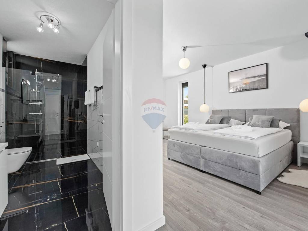 Hochwertige Baumaterialien und Verarbeitung: elegante neutrale Farbpalette, erstklassige Fassade, Keramik, Sanitärausstattung, elektrische Fußbodenheizung, Klimaanlage in allen Räumen. Solarpaneele sorgen für Warmwasser.