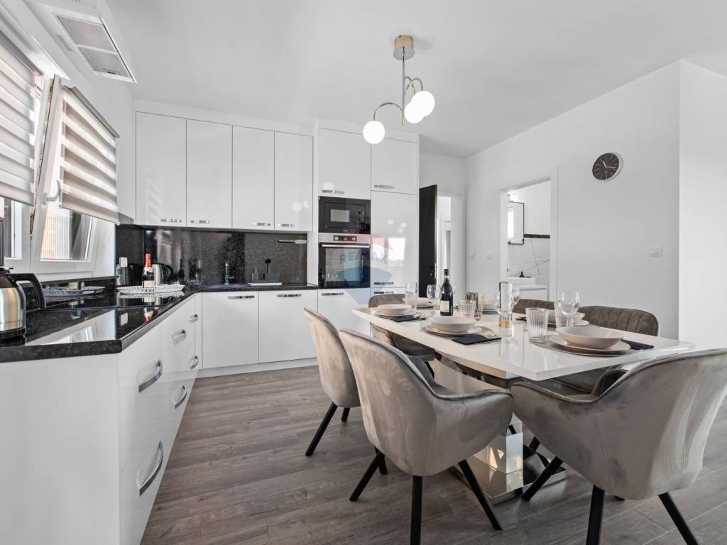 Im Erdgeschoss befindet sich ein luxuriöses Apartment (100 m²) mit Eingangsbereich, offener Küche mit Esszimmer, geräumigem Wohnzimmer mit Zugang zu einer großen überdachten Terrasse und Pool, zwei großen Schlafzimmern, zwei Bädern und einem WC/Waschraum.