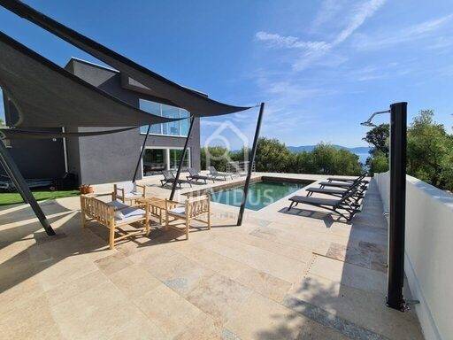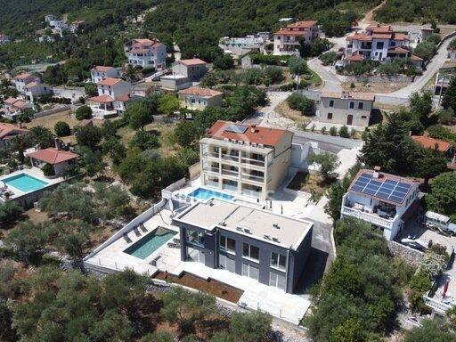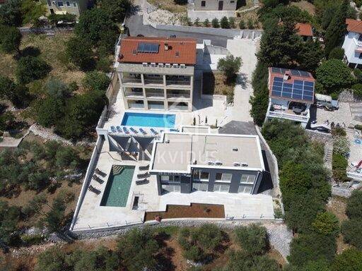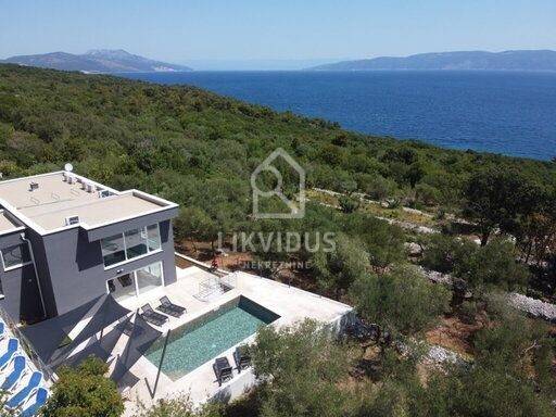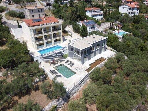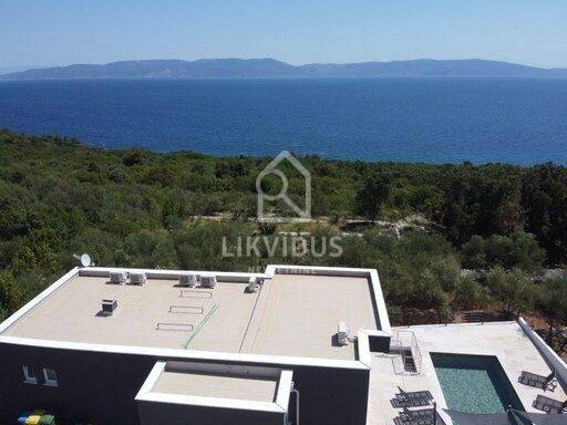 Na 800 m2 okućnice smještena je ova moderna vila sa grijanim bazenom u mjesu Ravni. Sastoji se od četiri spavaće sobe, četiri kupaonice, dva wc-a, kuhinje, blagovaonice i dnevnog boravka, te balkona s prekrasnim pogledom na bazen i more.