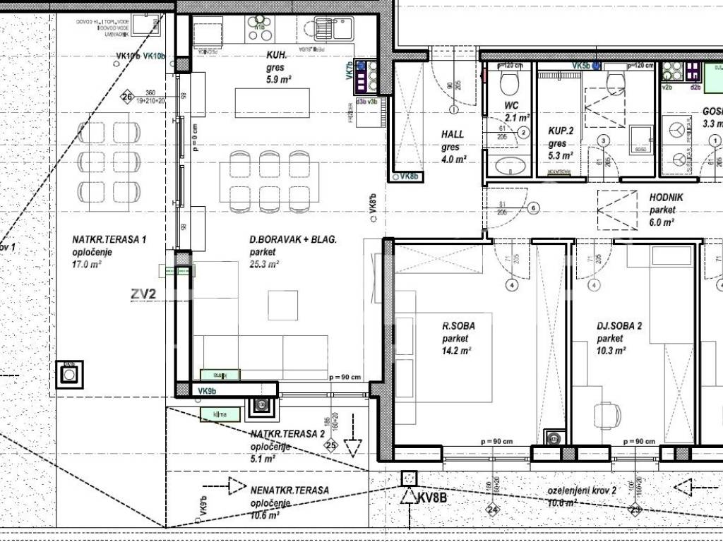 Prodaje se stan površine 92,30 m2 s terasama površine 32,70 m2 i ozelenjenim vrtom površine 44,30 m2 na trećem katu niskoenergetske stambeno - poslovne zgrade na odličnoj lokaciji. Zgrada se sastoji od podruma, prizemlja, prvog, drugog i trećeg kata te sadrži ukupno 108 stambenih jedinica i 2 poslovna prostora. Moguć je odabir podnih obloga (keramika, parket ili laminat) te odabir unutarnje stolarije. Uz stan moguća je kupovina vanjskog parkirnog mjesta, garažnog mjesta bez spremišta ili garažnog mjesta sa spremištem.
