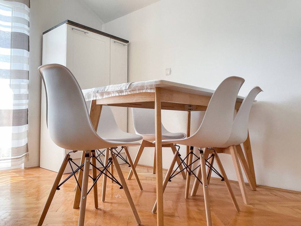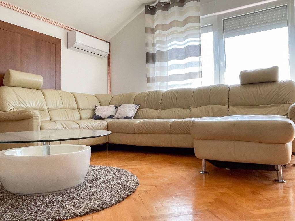 Stan je ugodan i svijetao, opremljen svim potrebnim namještajem za ugodan život.