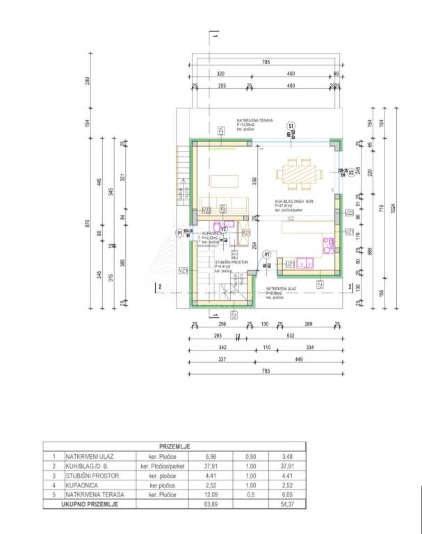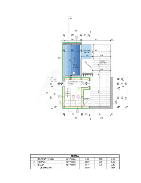 Erdgeschoss: Küche, Esszimmer, Wohnzimmer, Toilette, Treppe, überdachter Eingang, überdachte Terrasse, Swimmingpool (18 m2).