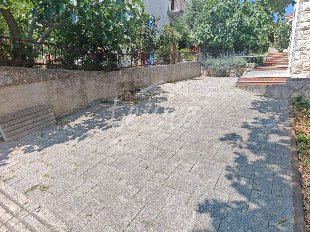 Zur Wohnung gehört außerdem ein 60 m² großer Garten, der teilweise als Parkplatz für zwei Autos genutzt werden kann (gepflasterter Teil), während der restliche Teil nach Belieben gestaltet werden kann (Grünfläche).