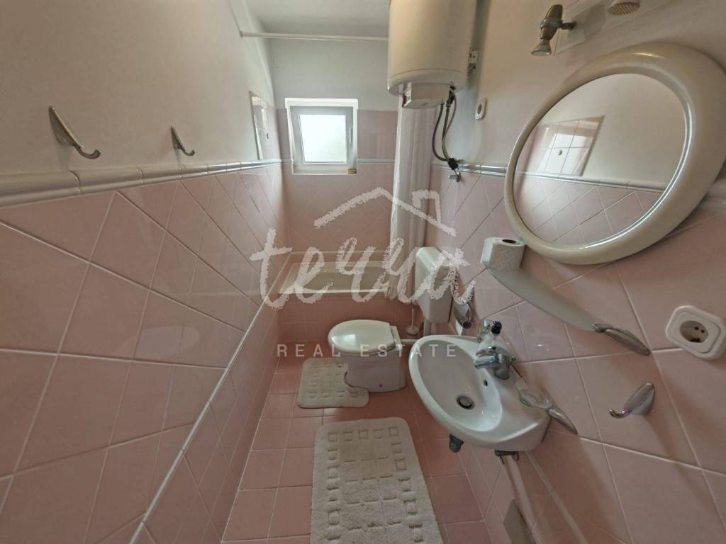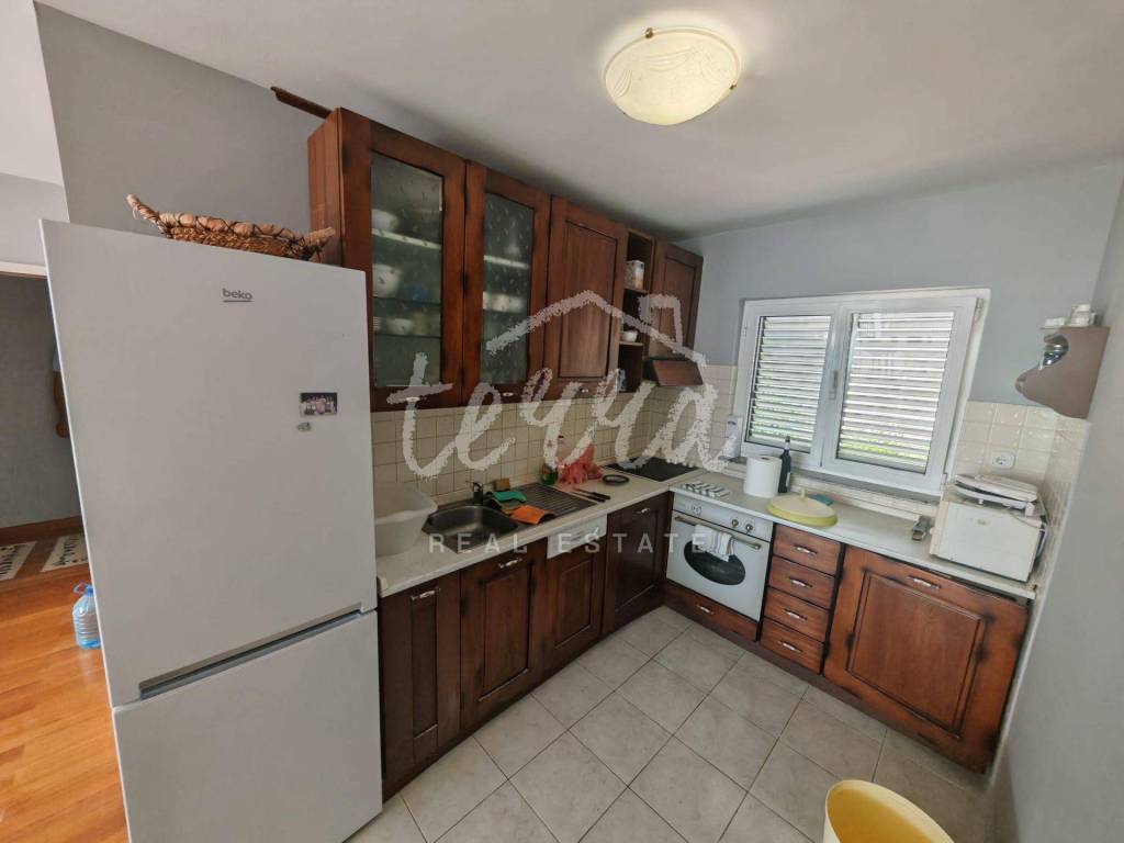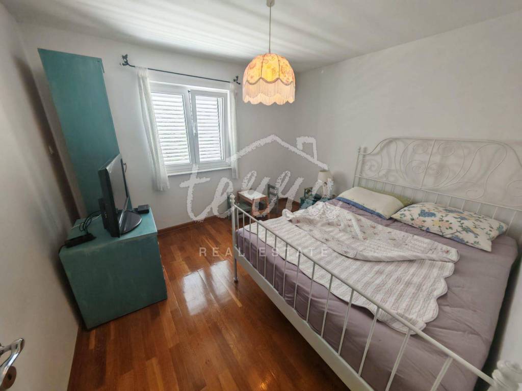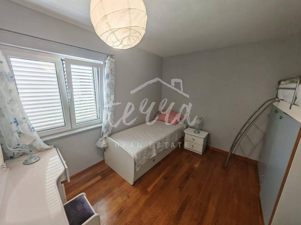 Die Wohnung ist äußerst gepflegt und geräumig und verfügt über drei Schlafzimmer, zwei Badezimmer, eine Küche mit Esszimmer und ein Wohnzimmer mit Zugang zu einer großzügigen, größtenteils überdachten Terrasse. Die Wohnung ist klimatisiert und alle Fenster sind aus Aluminium. Vom Flur aus gelangt man in den geräumigen Dachboden, der ausgebaut oder als Abstellraum genutzt werden kann.
