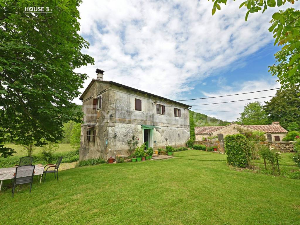 In unmittelbarer Nähe fließt ein kleiner Fluss, der nach Regenfällen durch die Landschaft plätschert und zum natürlichen Charme beiträgt. Das Anwesen besteht aus vier separaten Objekten: eines ist ein komplett eingerichtetes traditionelles istrisches Steinhaus, während die anderen drei baulich saniert wurden (neue Dächer und umfassende konstruktive Schutzmaßnahmen).