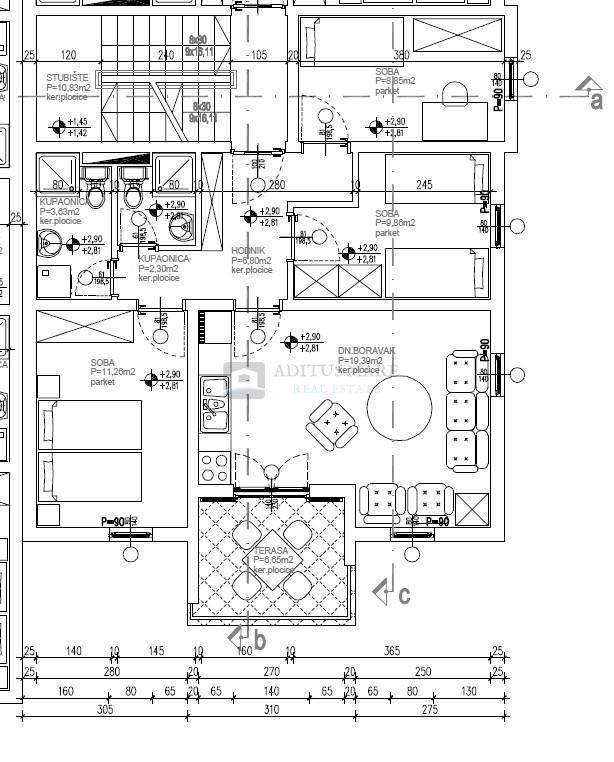Raspored: -dnevni boravak s kuhinjom i blagovaonicom (open space) -tri spavaće sobe -hodnik -dvije kupaonice -lođa