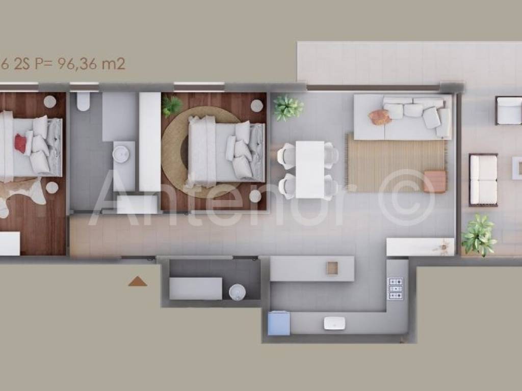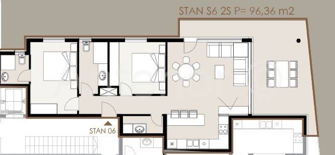 Stan se sastoji od hodnika, dvije spavaće sobe, dvije kupaonice, praonice, kuhinje s blagovaonicom i dnevnim boravkom površine 30,9m2, te natkrivene terase površine 18,86m2.