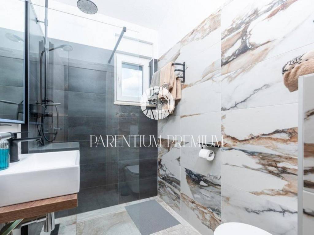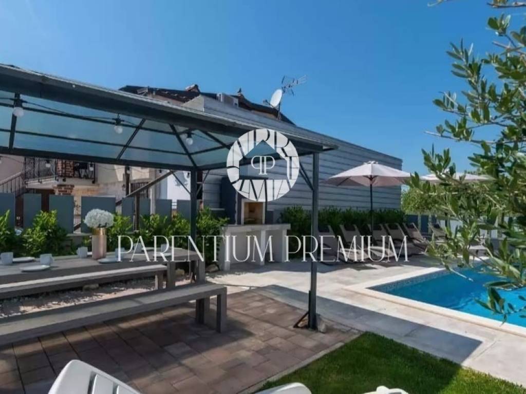 Das Haus ist in 2 Etagen aufgeteilt und im Erdgeschoss gibt es ein offenes Wohnzimmer mit Küche und Esszimmer, ein Schlafzimmer mit eigenem Bad und einen kleinen Abstellraum. Im ersten Stock befinden sich 3 Schlafzimmer, eines davon mit eigenem Bad und die anderen beiden mit einem Gemeinschaftsbad. Die Schlafzimmer im ersten Stock verfügen über eigene Terrassen mit Blick auf das Meer und die Stadt Poreč.