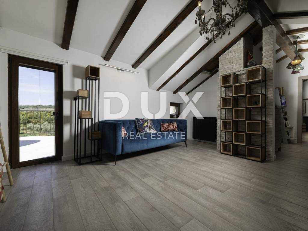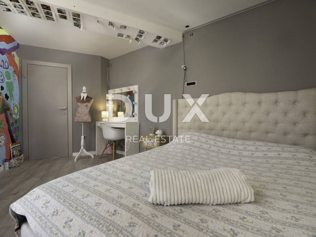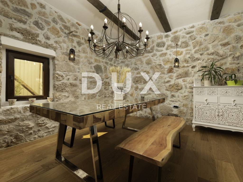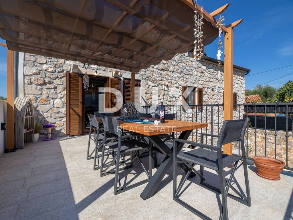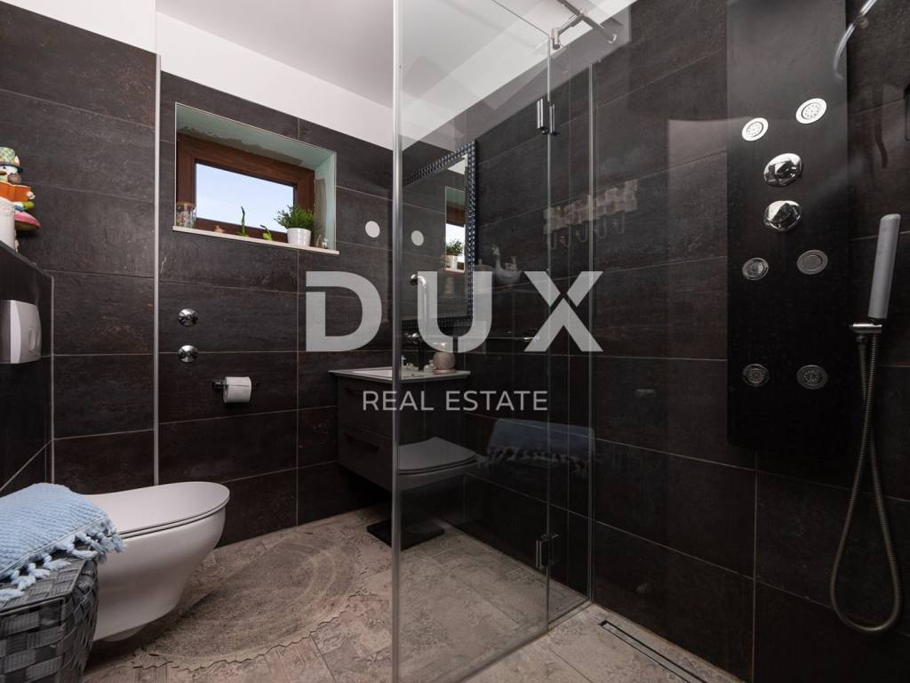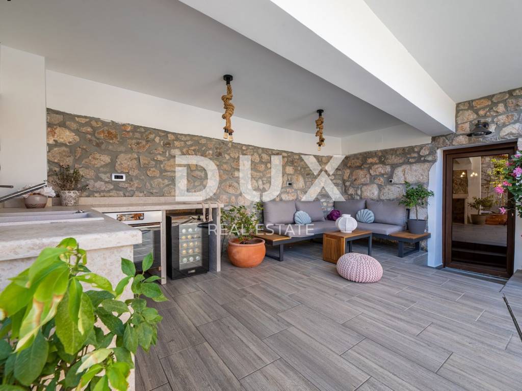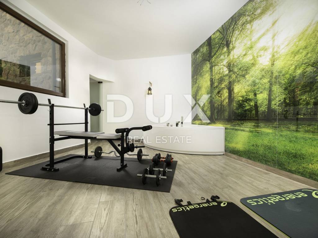 Im Erdgeschoss des Gebäudes befindet sich eine Taverne, in der Sie eine angenehme Zeit mit Freunden beim Billard oder Darts verbringen können, während sich im Nebenraum eine Sauna und ein Fitnessstudio befinden. Von der großen Terrasse im ersten Stock gelangen Sie in das Wohnzimmer, die Küche mit Esszimmer, das Badezimmer und das Schlafzimmer. Die Innentreppe führt in die zweite Etage, wo sich neben der Galerie ein Wohnzimmer, zwei Schlafzimmer, ein Badezimmer und eine schöne Terrasse befinden. Im umzäunten Hof gibt es einen Swimmingpool, eine Liegewiese mit Dusche und einen Grill. Dieses schöne Gebäude verfügt über vier Parkplätze. Wenn Sie Ruhe und echte Erholung suchen, ist dies die richtige Anlage für Sie. Auf der Ostseite der Insel Krk liegt die Gemeinde Dobrinj mit dem gleichnamigen Zentrum. Dobrinj liegt auf einem etwa 200 Meter hohen Hügel und ist eine der mittelalterlichen Burgen, die in der Vergangenheit Zentren der Alphabetisierung waren. Dobrinjština war jahrhundertelang eine äußerst landwirtschaftlich geprägte Region. Auch Tierhaltung und Olivenanbau sowie die Ausbeutung der Waldressourcen waren vertreten. Der Ort ist auch für seine farbenfrohen Trachten, Folkloreveranstaltungen, die Sopela-Schule (Krks Blasinstrument) und die traditionelle lokale Küche bekannt. In diesem Inselzentrum dominieren autochthone Steinhäuser und enge Steingassen, die an die Vergangenheit erinnern. Nicht weit von Dobrinje entfernt befindet sich die Höhle Biserujka, die durch ihre Schönheit und interessante Felsformen begeistert. Es ist die einzige Höhle auf der Insel, von der es mehr als 50 gibt, die für den Empfang von Besuchern konzipiert ist. Der Legende nach wurde die Höhle nach dem darin gefundenen Schatz, der einheimischen Piraten gehörte, Biserujka (Perle) genannt.
