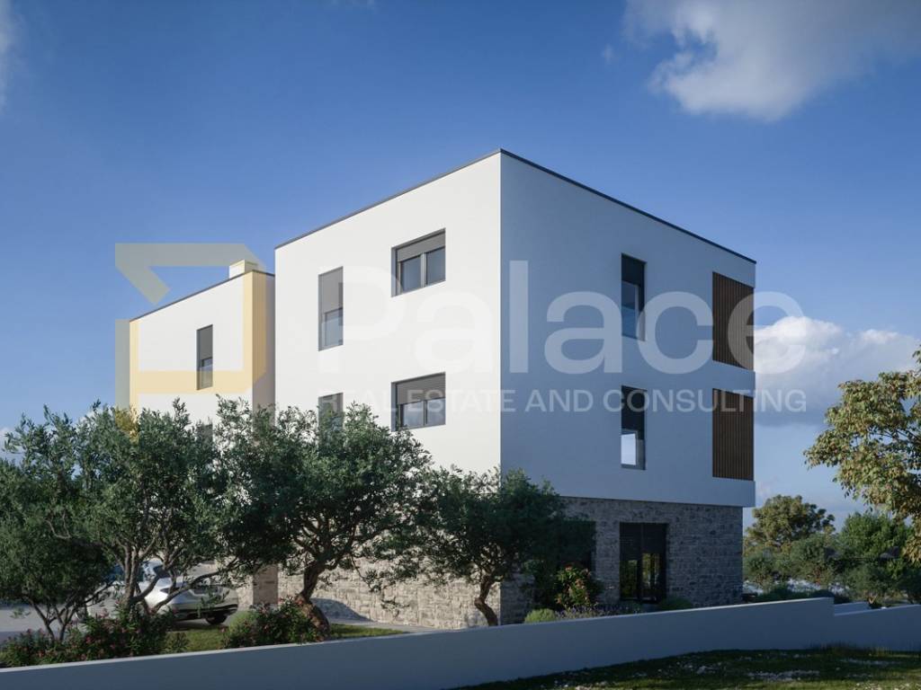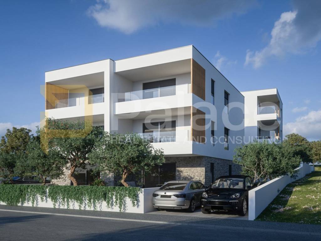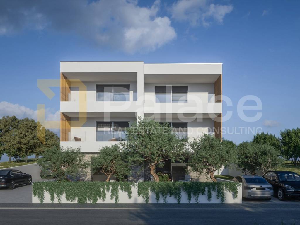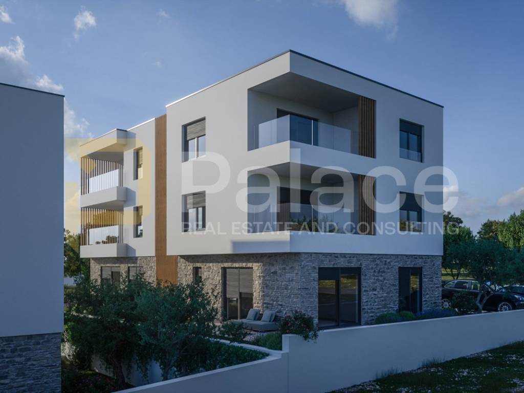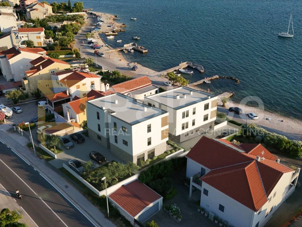 Zum Verkauf steht eine Wohnung in einem Neubau an exklusiver Lage, erste Reihe zum Meer in Brodarica neben Šibenik, mit einer Wohnfläche von 66,88 m2 mit Terrasse, Garten und Abstellraum, insgesamt nutzbarer Fläche von 94,18 m2.