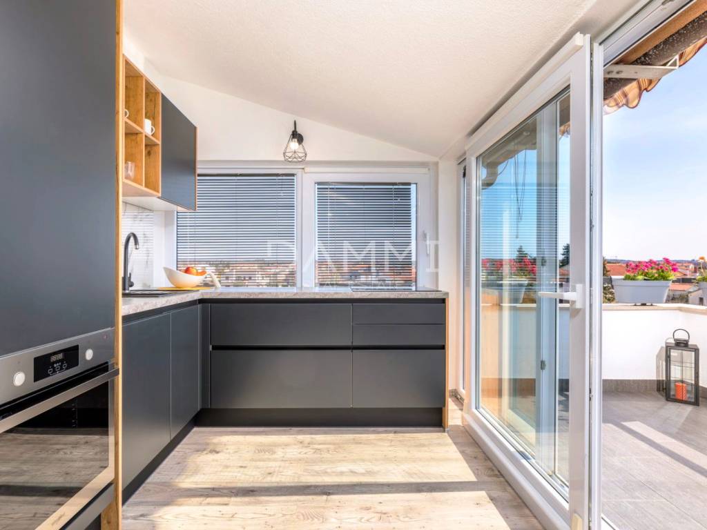 Im zweiten Stock (zweites Obergeschoss) befinden sich die Küche mit Essbereich, eine große Terrasse, ein Schlafzimmer sowie eine Toilette mit Waschmaschine.