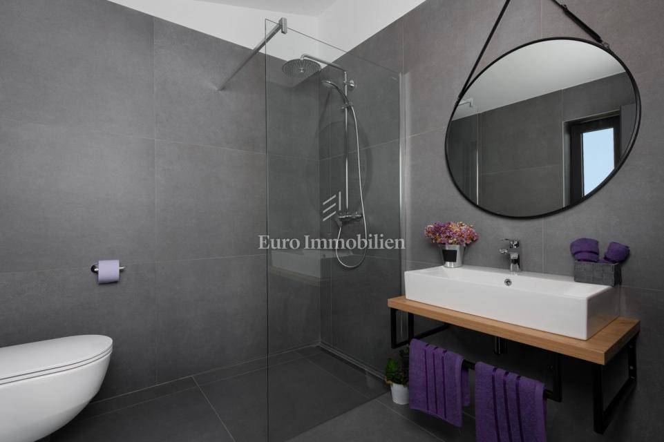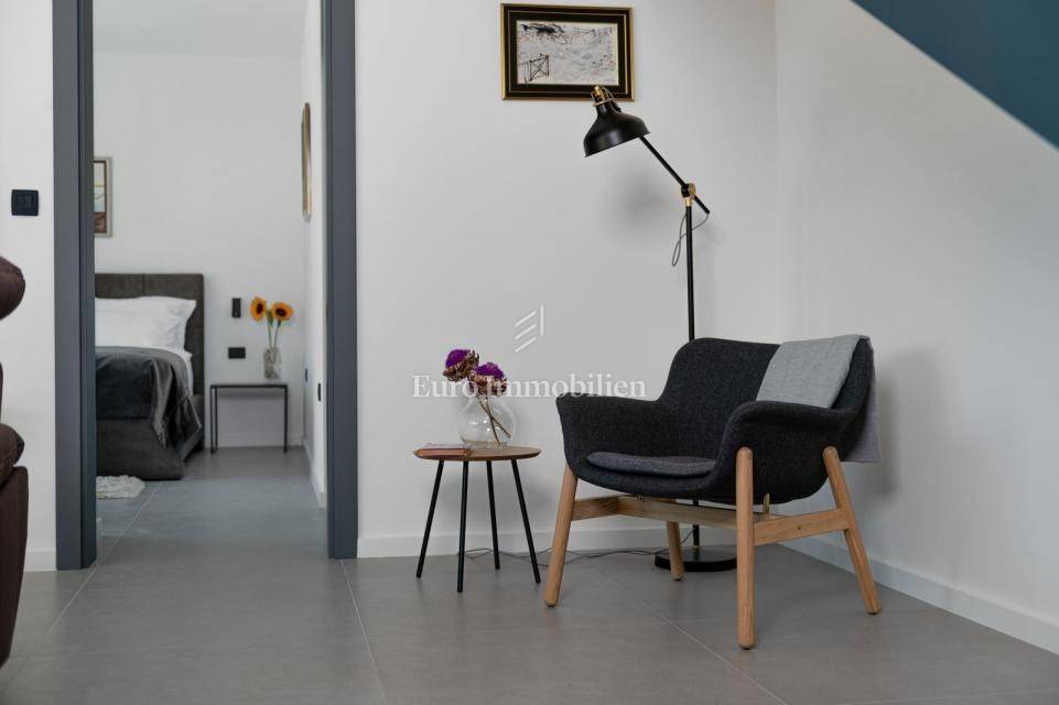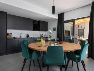 Dieses schöne zweistöckige Haus bietet eine hervorragende Kombination aus moderner Architektur, hochwertigen Materialien und einer angenehmen Atmosphäre und befindet sich auf einem Grundstück mit einer Gesamtfläche von 1.050 m2. Das Haus besteht aus einem Erdgeschoss und einem ersten Stock mit einer Gesamtnettowohnfläche von 190 m2. Im Erdgeschoss befinden sich eine Küche, ein Esszimmer und ein Wohnzimmer sowie ein Badezimmer, ein Schlafzimmer, ein Technikraum, zwei Toiletten, eine Sauna, ein Abstellraum und ein Maschinenraum. Die großen Glaswände des Wohnzimmers geben den Blick auf den wunderschön angelegten Garten frei, in dem sich eine überdachte Sommerküche und ein Swimmingpool mit einer Liegefläche von 39 m2 befinden. Das Erdgeschoss und der erste Stock sind durch eine Innentreppe verbunden. Im Obergeschoss befinden sich drei Schlafzimmer mit jeweils eigenem Bad. Das Haus wird komplett dekoriert und möbliert verkauft. Im Preis inbegriffen ist ein Baugrundstück von 670 m2 neben dem Haus.