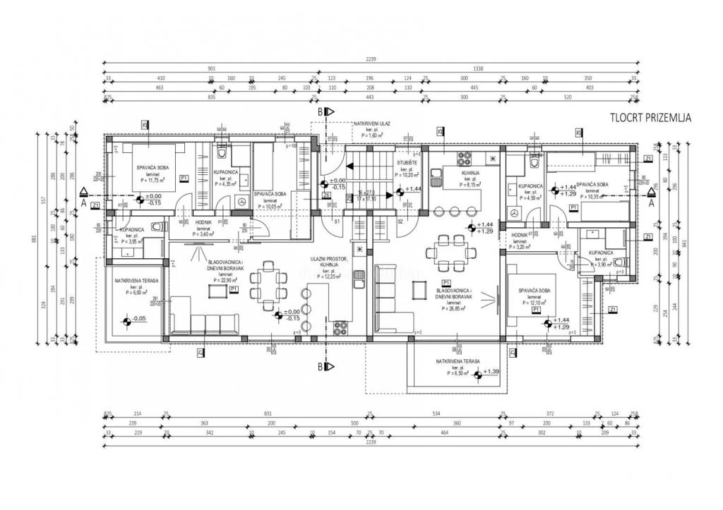 ERDGESCHOSS - S1 (Küche, Esszimmer + Wohnzimmer, Flur, zwei Schlafzimmer, zwei Badezimmer, überdachte Terrasse, zwei Parkplätze, Garten) - 86,65 m² - 346.600,00 € - VERKAUFT
