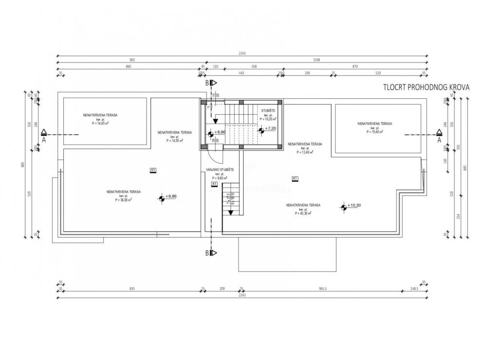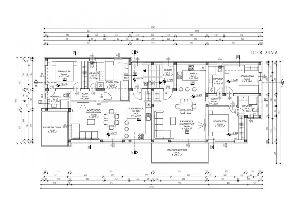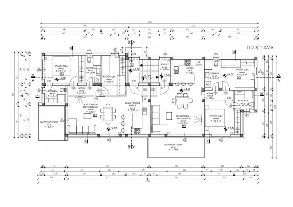 OBERGESCHOSS - S5 (Küche, Esszimmer + Wohnzimmer, Flur, zwei Schlafzimmer, zwei Badezimmer, überdachte Terrasse, zwei Parkplätze, Garten, offene Dachterrasse) – 94,71 m² – 520.000,00 €