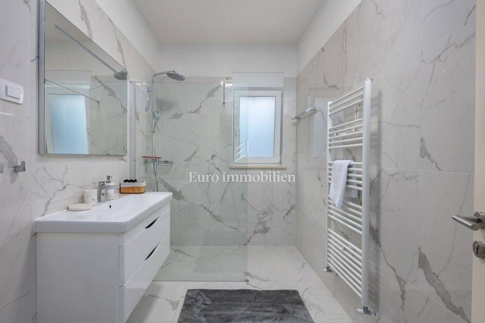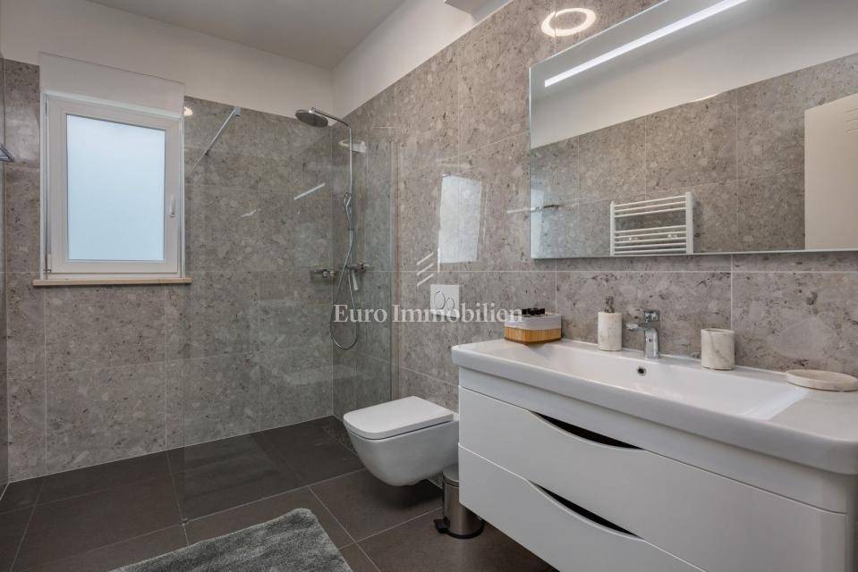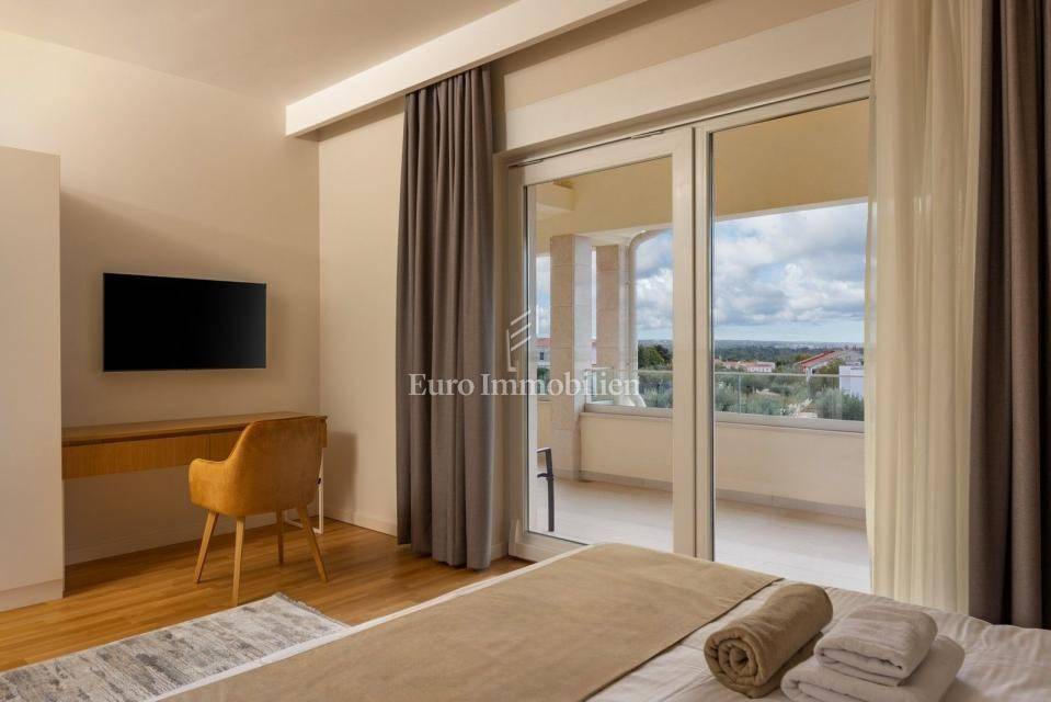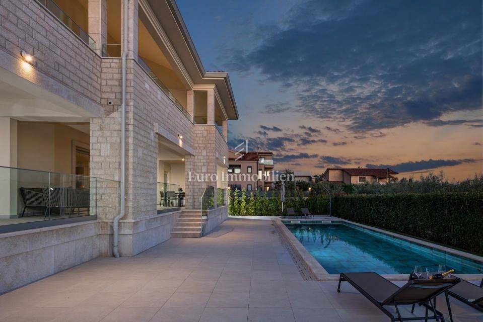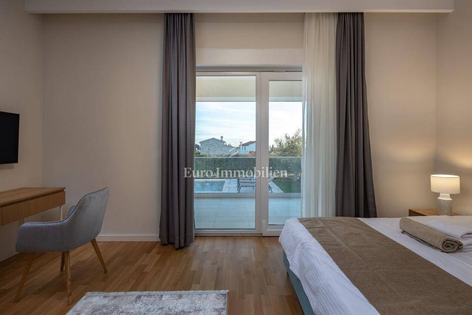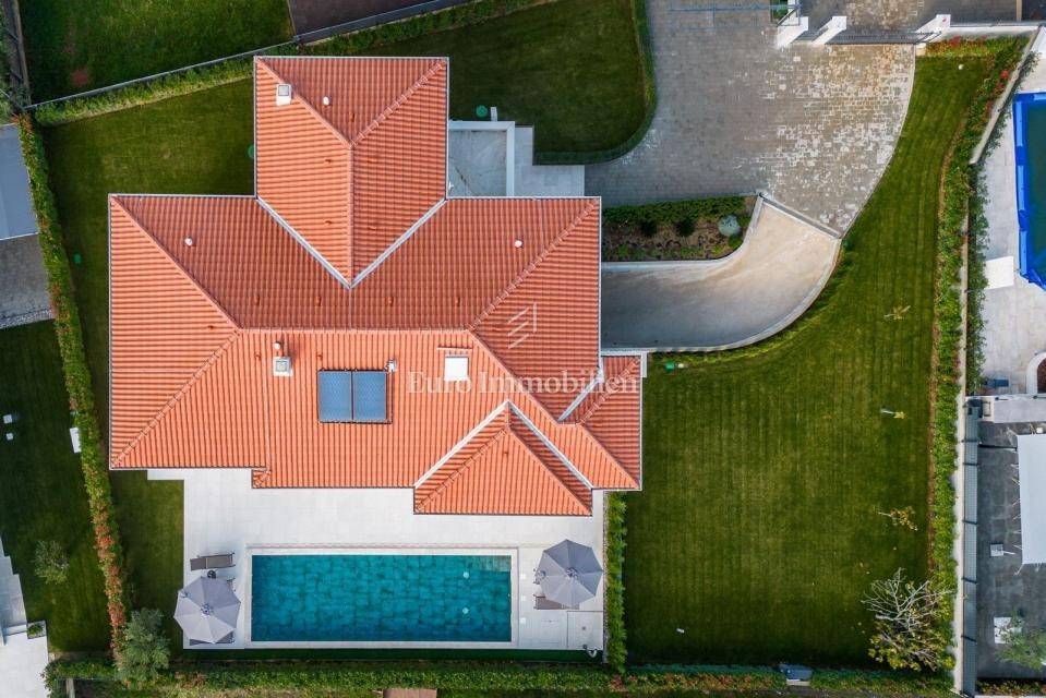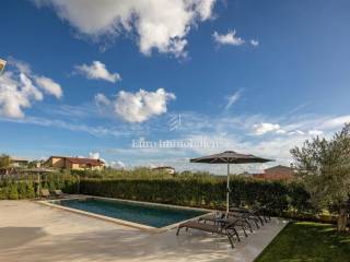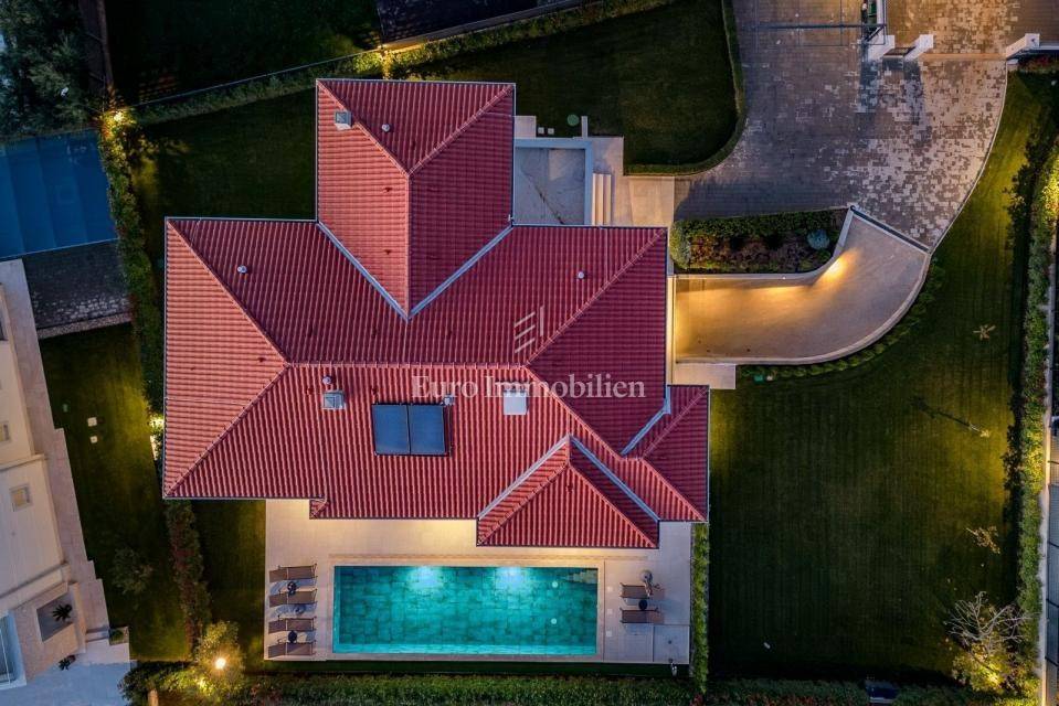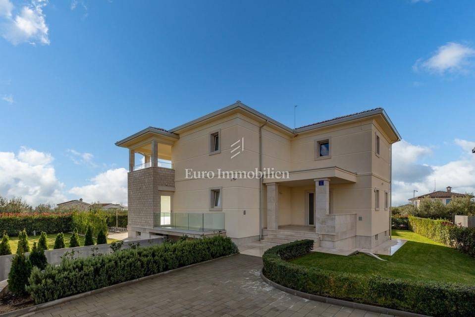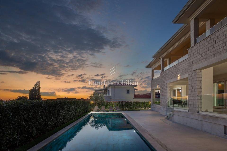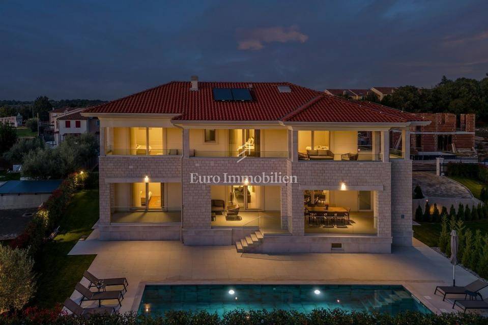 Eine wunderschöne Villa mit authentischem Aussehen, gelegen in ruhiger Lage in einer kleinen istrischen Stadt, nicht weit vom Meer (1 km). Mit seiner Eleganz und Architektur verströmt es ein wenig venezianischen Stil. Es wurde im Jahr 2022 gebaut. Es besteht aus drei Etagen: Keller, Erdgeschoss und erster Stock. Im Untergeschoss befinden sich eine Garage für zwei Autos, der Maschinenraum des Hauses, eine Waschküche und ein Weinkeller. Eine Innentreppe führt in den ersten Stock, wo sich ein geräumiger Wohnbereich (Esszimmer, Küche und Wohnzimmer), Flur, Toilette und ein Schlafzimmer mit eigenem Bad befinden. Der Wohnbereich führt zu einer großen überdachten Terrasse, dem Swimmingpool und dem Garten. Im Obergeschoss befinden sich drei weitere Schlafzimmer, jeweils mit eigenem Bad und einem Balkon mit Panoramablick auf das Meer. Die Heizung erfolgt über Fußbodenheizung, die Heizung/Kühlung wird über Klimaanlagen geregelt. Der Hof ist eingezäunt, ein Teil des Gartens ist mit mediterranen Pflanzen und Rasen geschmückt und der andere Teil ist für drei Parkplätze vorgesehen. Im Garten befindet sich außerdem ein großer Swimmingpool (45 m2). Die Villa vermittelt mit ihren hohen Decken und der Einrichtung sowie weiteren Innen- und Außendetails einen Hauch von Luxus. Daher ist es eine ausgezeichnete Wahl für alle, die eine authentische Immobilie in Meeresnähe für den Eigenbedarf oder als Investition für die touristische Vermietung suchen.