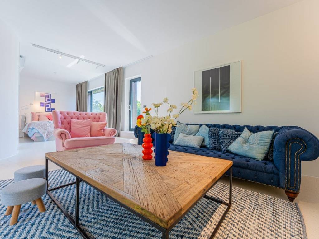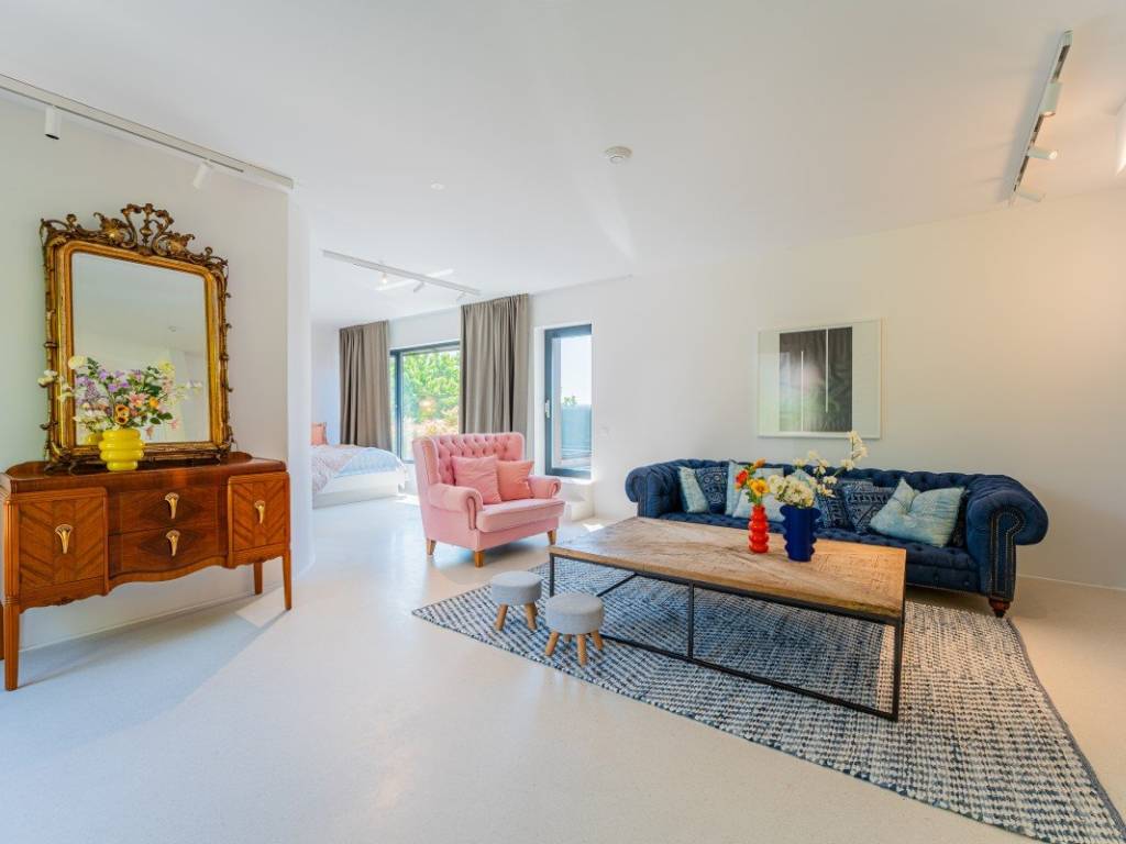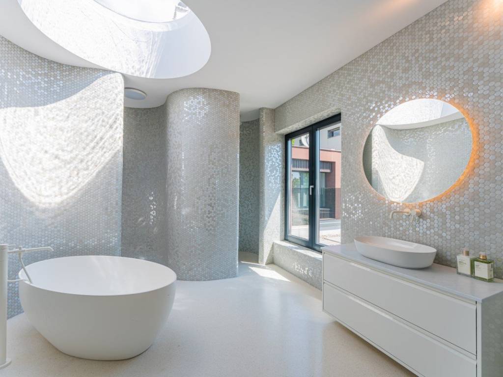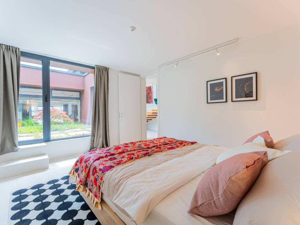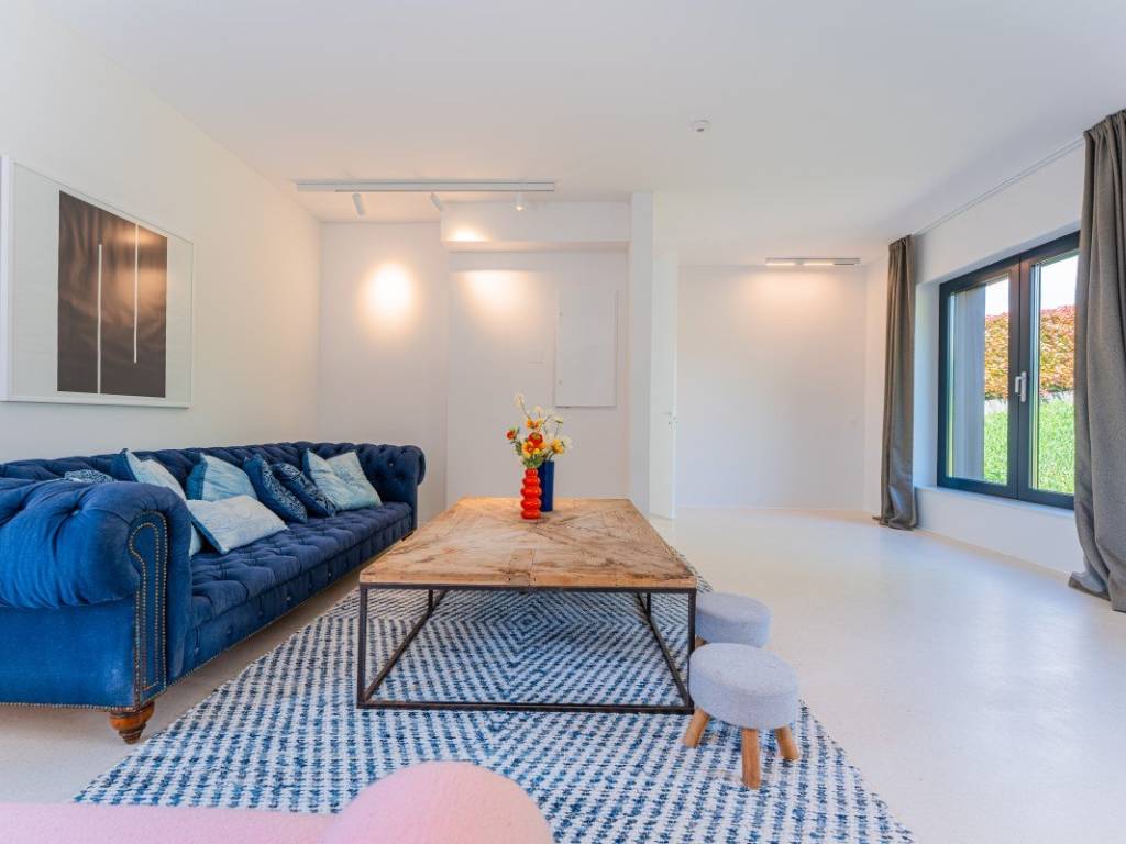 Die Villa bietet ca. 400 m Wohnfläche auf einem ca. 1.530 m großen Grundstück. Sie ist von Grün umgeben und so gestaltet, dass sie viel Tageslicht hereinlässt und einen fließenden Übergang zwischen Innen- und Außenbereich schafft.