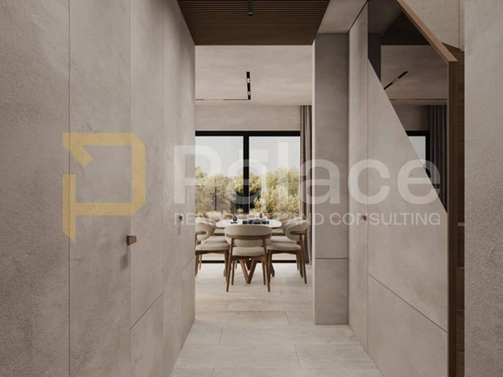Ein Aufzug und eine Treppe erstrecken sich über alle drei Etagen und verbinden sie. Im Erdgeschoss befindet sich der anspruchsvolle Wohnbereich, eine geräumige offene Küche mit Essbereich und Wohnzimmer mit direktem Zugang zum Garten. Dort befindet sich auch ein Schlafzimmer und ein Badezimmer. Im ersten Stock befinden sich zwei Schlafzimmer, jedes mit eigenem Bad, und eines mit Zugang zu einer Terrasse. Auf der zweiten Etage gibt es einen Bereich für Entspannung, eine "Esszimmer" Küche und Zugang zu einer geräumigen Terrasse mit Infinity-Pool und Sonnendeck.
