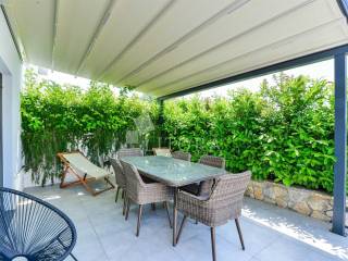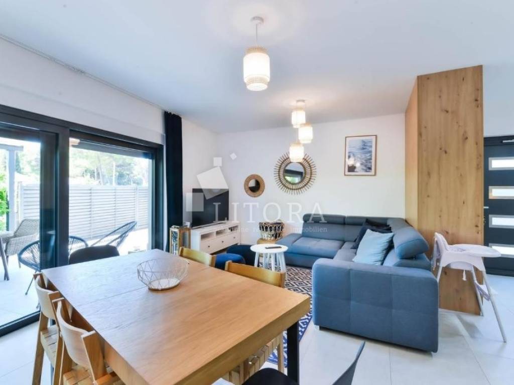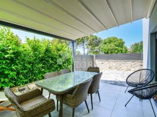 Modern eingerichtetes und möbliertes Einfamilienhaus mit Garten, nur 80 m vom Strand entfernt, mit Meerblick. Das Haus ist Teil eines Doppelhauses und erstreckt sich über zwei Etagen (Erdgeschoss + Obergeschoss) mit insgesamt 97,18 m² Wohnfläche sowie einem gepflegten, gepflasterten Garten von 133,10 m², in dem sich ein Parkplatz befindet. Im Erdgeschoss befinden sich ein Flur, ein Badezimmer, ein Schlafzimmer sowie ein Wohnzimmer mit Küche und Essbereich, die Zugang zu einer überdachten Terrasse haben. Im Obergeschoss befinden sich drei Schlafzimmer und zwei Badezimmer. Vom Obergeschoss aus bietet sich ein Blick auf das Meer und den Strand. Der Hof ist vollständig eingezäunt. Das Haus ist mit Klimaanlagen in jedem Zimmer, Fußbodenheizung im Wohnzimmer und in den Badezimmern, Wärmedämmfassade sowie Aluminiumfenstern mit Moskitonetzen und Rollläden ausgestattet.