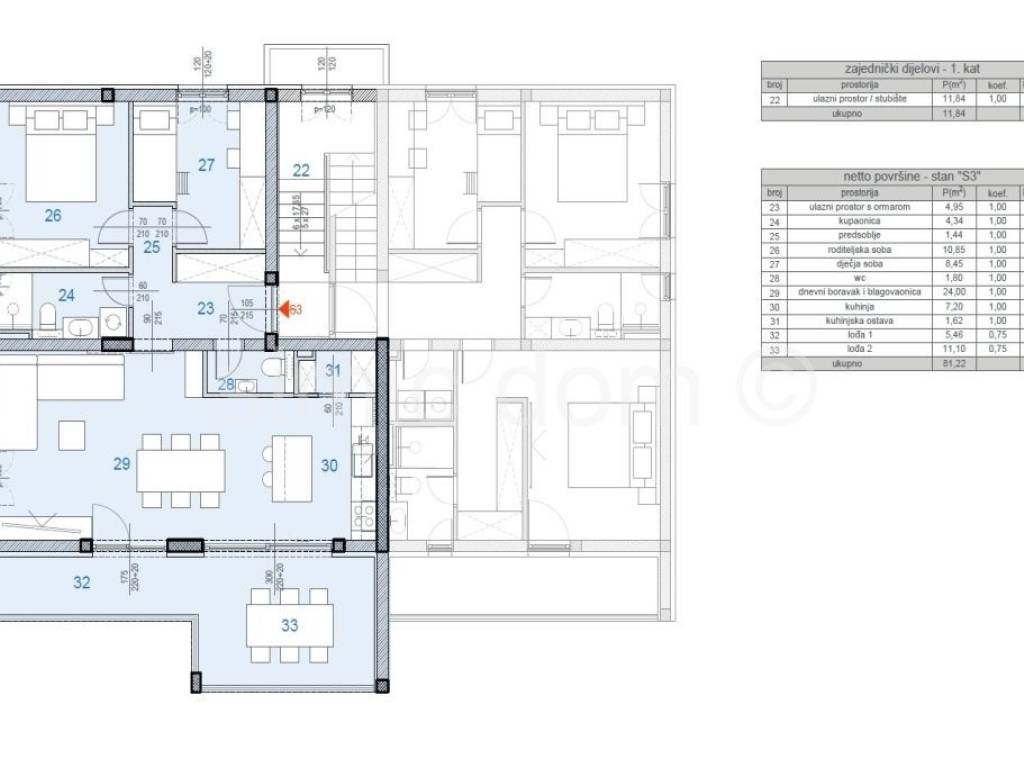 Zum Verkauf stehen Wohnungen in einem Neubauprojekt in Kastel Sucurac. Das Gebäude liegt in einer ruhigen Straße oberhalb der Schnellstraße. Alle Wohnungen sind nach Süden ausgerichtet und bieten einen herrlichen Blick auf die Bucht von Kaštela. Das Gebäude umfasst insgesamt drei komfortable Zwei-Zimmer-Wohnungen und eine luxuriöse, zweistöckige Drei-Zimmer-Wohnung mit Garage. Wohnung S3 befindet sich im ersten Obergeschoss und verfügt über 64,66 m Wohnfläche und eine 16,76 m große Loggia. Mit allen Ausstattungsmerkmalen beträgt die Nettofläche der Wohnung 77,08 m. Sie besteht aus Flur, Hauswirtschaftsraum, Bad, WC, zwei Schlafzimmern, einem weiteren Badezimmer sowie einer offenen Küche mit Ess- und Wohnbereich, die sich zu einer geräumigen Loggia und einem Garten öffnet. Bis zu zwei Parkplätze können zur Wohnung hinzugebucht werden. Jeder Parkplatz kostet zusätzlich 10.000 . In Absprache mit dem Investor besteht die Möglichkeit, die Materialien für die Wohnungen selbst auszuwählen. Der Investor bietet die Option einer Finanzierung über einen Wohnkredit an. Die Fertigstellung und der Bezug der Wohnungen sind für Ende 2027 geplant.