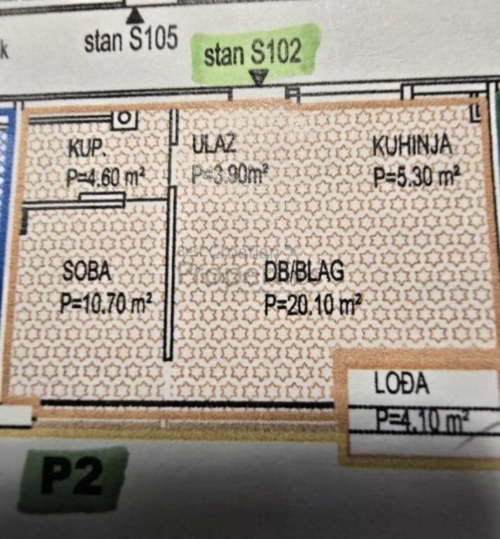 Sastoji se od ulaznog prostora, dnevnog boravka s kuhinjom i blagovaonicom, spavaće sobe, kupaonice s tuš kabinom i loggie.