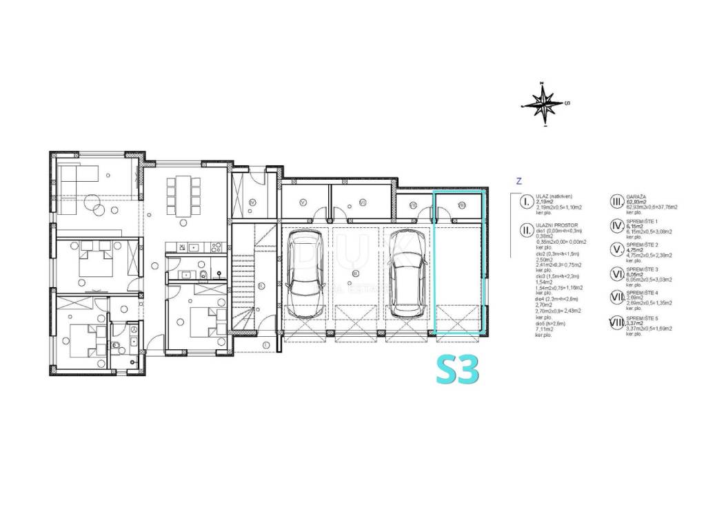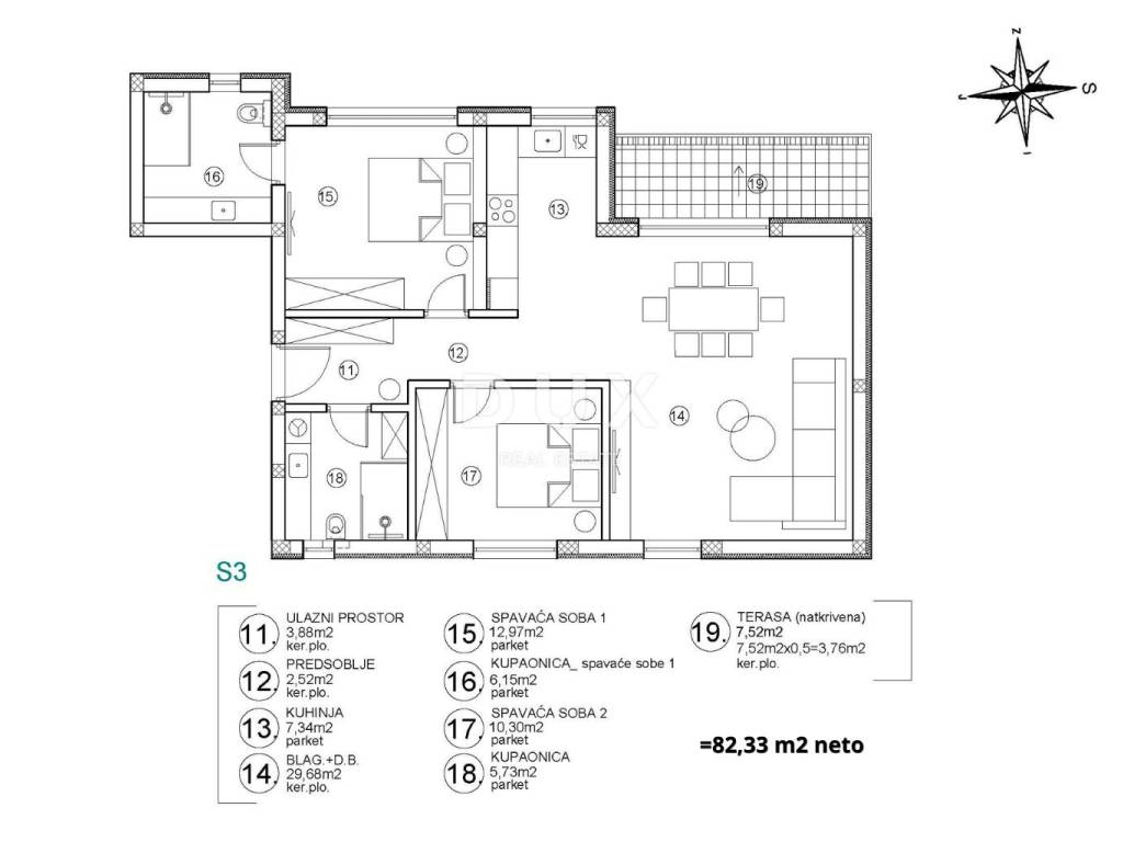 Wohnung S3 liegt im 1. Obergeschoss eines kleinen Wohnhauses mit insgesamt 5 Wohnungen, bietet 78,57 m Wohnfläche (105,69 m Gesamtfläche) und ist nach Osten und Westen ausgerichtet. Vom Eingangsbereich aus erreichen Sie die Schlafzimmer auf beiden Seiten (das Hauptschlafzimmer verfügt über ein eigenes Badezimmer) sowie ein weiteres Badezimmer. Angrenzend befindet sich der Wohnbereich mit Wohnzimmer, Küche und Essbereich, der auf eine überdachte Terrasse führt.