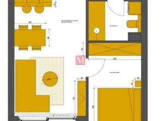 The apartment consists of an entrance hall, an open-plan kitchen with dining area and living room, a bedroom, a bathroom, and a terrace.