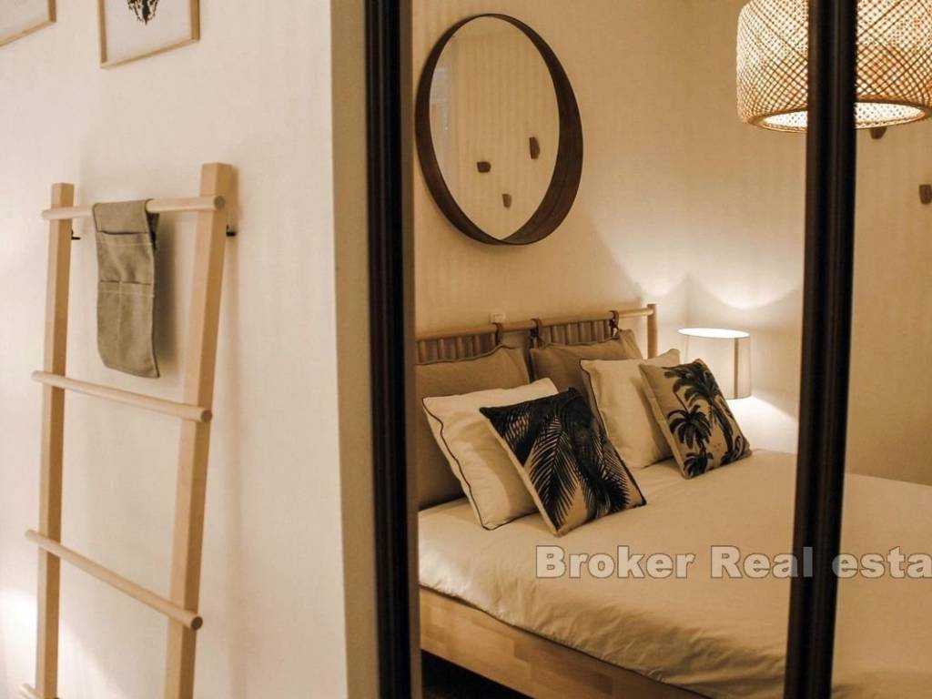 Angeboten wird ein modern gestaltetes Haus mit zwei Wohneinheiten, einem Gemeinschaftspool und einem Pavillon, das eine einzigartige Gelegenheit auf dem Markt mit atemberaubendem, unverbaubarem Meerblick bietet. Die sanfte Hanglage mit unglaublich attraktivem Panoramablick auf das Meer eröffnet außergewöhnliche Geschäftsmöglichkeiten. Die erste Wohneinheit erstreckt sich über eine Fläche von 55 m2 und umfasst eine mit einem Wohnbereich verbundene Küche, zwei Schlafzimmer, ein Badezimmer und eine große Terrasse. Die zweite Wohneinheit mit einer Fläche von 75 m2 besteht aus einer Küche, einem Wohnzimmer, zwei Schlafzimmern und einer Terrasse. Beide Bauwerke wurden im Jahr 2019 erbaut und sind mit hochwertigen Geräten und Materialien ausgestattet. Einen hervorragenden Entspannungsbereich bietet ein privater Pavillon, der vor neugierigen Passanten verborgen bleibt und über einen Whirlpool und einen Erholungsbereich verfügt. Diese Immobilie bietet zahlreiche Möglichkeiten als prestigeträchtige Touristenunterkunft in der Nähe aller wichtigen städtischen Annehmlichkeiten. Zusätzlich sind vier Parkplätze inklusive. Die Entfernung von der Stadt Trogir beträgt etwa 15 Kilometer und vom Flughafen etwa 20 Kilometer.