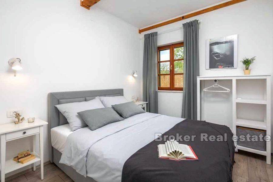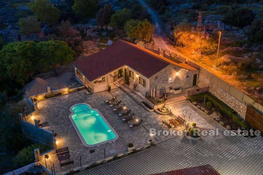 Neu erbaute Steinvilla mit Pool in ruhiger Umgebung unberührter mediterraner Natur. Die Villa als Kombination aus dalmatinischer Tradition und modernem Design auf einer Fläche von 100 m² erstreckt sich über ein Grundstück von 1000 m². Das Innere besteht aus 4 Schlafzimmern, 3 Bädern, Küche, Esszimmer und einem geräumigen Wohnzimmer, das direkt zu führt Eine große überdachte Terrasse, die als Ort für Familienfeiern und Geselligkeit gedacht ist. Das mit Steinen gepflasterte Äußere ist als Ort der Entspannung und des gastronomischen Genusses konzipiert. Es verfügt über eine große Außenküche mit zwei Grills, einen großen Hydromassage-Pool von 34 m² und eine geräumige Sonnendusche sowie eine zusätzliche Toilette. Von jedem Teil dieses harmonisch gestalteten Anwesens haben Sie einen Panoramablick auf das Meer und die unberührte Natur. Entfernung zum Strand, Meer, Restaurants und Geschäften ca. 1000m, und der nächste Flughafen Split ist nur 30 Autominuten entfernt.