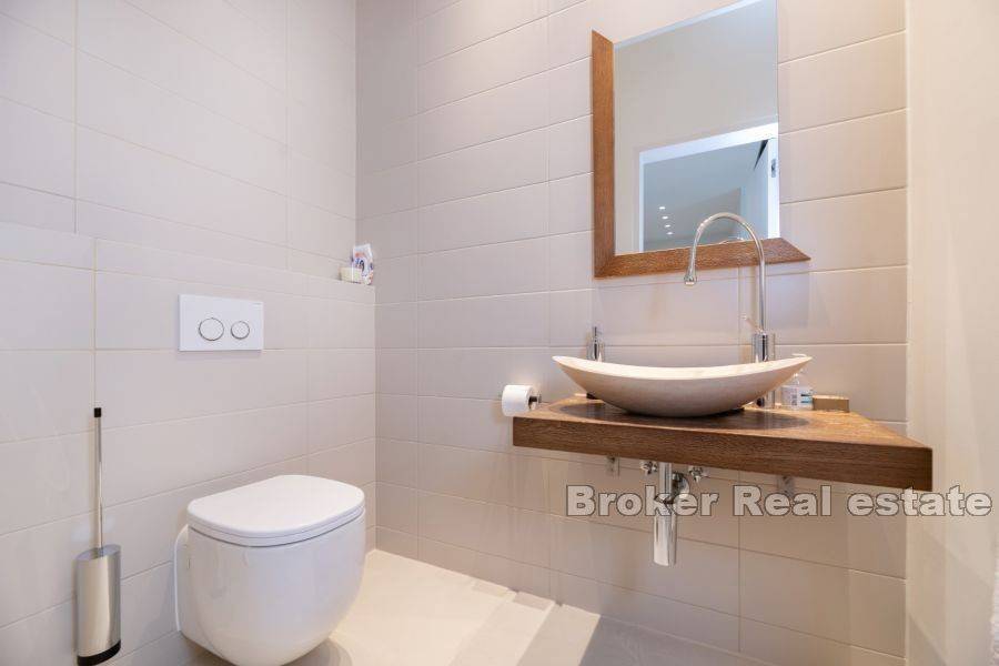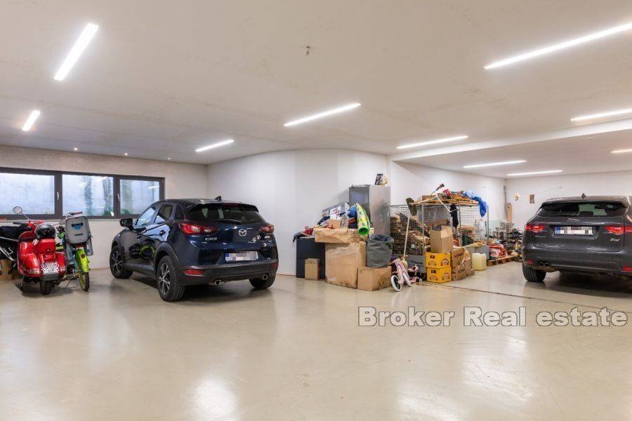 Eine modern gestaltete Luxusvilla mit Swimmingpool und Meerblick in einem ruhigen Teil von Umag. Die Gesamtwohnfläche beträgt 316 m2 und erstreckt sich über drei Etagen. Der Keller besteht aus einer großen Garage für mehrere Autos, einem Raum mit Heimkino, einer Bar und einer Weinecke. Im Keller befinden sich außerdem Technikräume zur Steuerung der Fußbodenheizung, des Schwimmbades und des Smart Home-Systems. Im Erdgeschoss befinden sich eine große moderne Küche mit Essbereich, ein Schlafzimmer mit eigenem Bad, eine Toilette, ein Wohnzimmer, das zu einer überdachten Terrasse mit Swimmingpool und einem Raum zum geselligen Beisammensein führt. Im Obergeschoss befinden sich drei Schlafzimmer, zwei Badezimmer und Flure mit Einbauschränken. Jedes Zimmer verfügt über große Fenster mit herrlichem Blick auf das Meer oder die Umgebung mit Olivenbäumen. Der Hof ist komplett angelegt mit Wegen zwischen Rasenflächen und Pflanzen, einem automatischen Bewässerungssystem und einem Zen-Garten mit sorgfältig ausgewähltem Sand und Pflanzen. Die Villa hat eine erhöhte Lage, wodurch sie einen herrlichen Blick in alle Richtungen auf das Meer, die Umgebung, Olivenhaine und das Grundstück von 4950 m2 bietet.