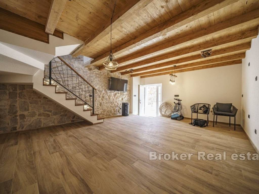 Dieses komplett renovierte und gut ausgestattete Anwesen bietet Luxus und Komfort direkt im Zentrum des Dorfes. Dieses Haus liegt nur 50 Meter vom Meer, der Promenade, Restaurants und Cafés entfernt und ist stilvoll gestaltet und sorgfältig geplant, um maximalen Komfort zu bieten. Das Haus besteht aus einem Erdgeschoss und zwei Obergeschossen. Im Erdgeschoss gibt es eine Küche mit Essbereich, ein Wohnzimmer und ein Außenbadezimmer. Diese Ebene ist mit einem als Taverne bezeichneten Raum verbunden, der über einen Innenkamin und einen schönen Weinkeller verfügt. Im ersten Stock befinden sich zwei Schlafzimmer, jedes mit eigener Terrasse und einem geräumigen Badezimmer. Im zweiten Stock gibt es ein Schlafzimmer mit einer Badewanne neben einem Bett und Zugang zu einem voll ausgestatteten Badezimmer. Von diesem Schlafzimmer aus haben Sie Ausgang zu einer geräumigen Terrasse mit schöner Aussicht. Der Innenhof ist gepflastert und landschaftlich gestaltet und verfügt über einen Außenkamin, einen Essbereich, einen Platz zum Sonnenbaden und einen Pool und bietet alles, was Sie sich wünschen können. Diese Immobilie ist eine echte Rarität auf dem Markt und verbindet alten dalmatinischen Charme mit modernem Design. Es ist ein ideales Ferienhaus für Sommertage oder eine ausgezeichnete Investitionsmöglichkeit. Die Immobilie liegt 50 Meter vom Meer, 2,5 km von Vodice und 15 km von Šibenik entfernt. Die Eigentumsverhältnisse sind klar und unbelastet.