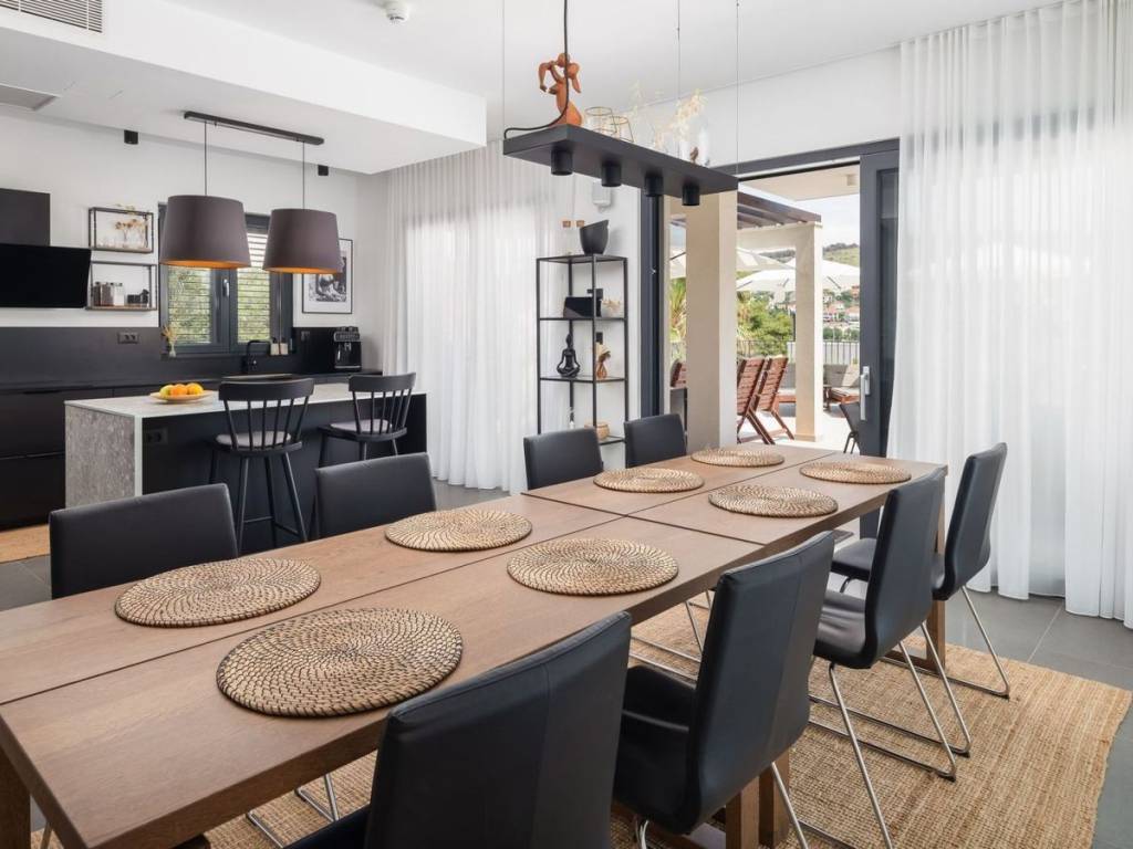 Neue moderne Villa mit Pool in zweiter Reihe zum Meer in Čiovo. Villa mit einem angelegten Garten von 500 m², nur 50 m vom Meer entfernt in einer wunderschönen Kieselbucht. Die Villa verfügt über 280 m² und ist mit hochwertigen Geräten, Installationen und Luxusmöbeln ausgestattet. Im Erdgeschoss: ein Schlafzimmer mit Bad und eine Eingangshalle (kleines Wohnzimmer), eine Garage für zwei Autos und ein Maschinenraum für den Swimmingpool. Im ersten Stock: ein großes Wohnzimmer mit moderner Küche und einem geräumigen Esszimmer sowie Ausgang zu einer großen Terrasse und einem überdachten Loungebereich mit beheiztem Pool und Sonnendeck. Im zweiten Stock: drei Schlafzimmer mit Einbauschränken und eigenem Bad sowie ein Balkon mit freiem Blick auf das Meer. Die Villa wird komplett möbliert verkauft. Ausgestattet mit Alarmanlage und Kameras, automatischem Gartenbewässerungssystem, Feueralarm, WLAN-Internet, Fußbodenheizung in allen Badezimmern, voll klimatisiert.