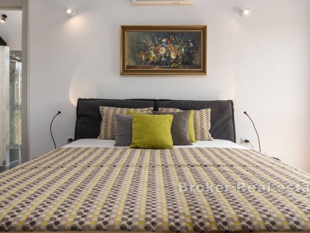 Zum Verkauf steht eine modern eingerichtete und ausgestattete Villa in äußerst ruhiger Lage, unweit von Poreč. Auf einem großzügigen Grundstück von 6271 m2 befindet sich eine zweistöckige Villa mit einer Wohnfläche von 454 m2. Das offene Erdgeschoss ist dank großer Glaswände den ganzen Tag der Sonne ausgesetzt und bietet auch Zugang zum Garten, in dem sich ein Swimmingpool befindet. Im Erdgeschoss befinden sich ein modernes Wohnzimmer, gefolgt von einem Esszimmer und einer voll ausgestatteten Küche sowie zwei Schlafzimmer mit eigenen Bädern. Das Erdgeschoss und der erste Stock sind durch eine Innentreppe verbunden. Im Obergeschoss befinden sich vier Schlafzimmer mit eigenen Bädern und eigenem Ausgang zu einer geräumigen Sonnenterrasse. Neben dem Swimmingpool ist der Hof mit einer funktionalen Sommerküche und einem Sonnendeck mit Liegestühlen ausgestattet. Da die Villa auf einem großzügigen Grundstück liegt, verfügt sie über einen gesicherten Parkplatz für mindestens sechs Autos. Die Sicherheit der Villa wird durch ein erstklassiges Einbruchschutzsystem gewährleistet, das Alarme, einbruchsichere Türen und Überwachungskameras umfasst. Dank ihrer Funktionalität und Unterbringung kann die Villa sowohl zur Vermietung als auch für ein angenehmes und ruhiges Familienalltag genutzt werden.