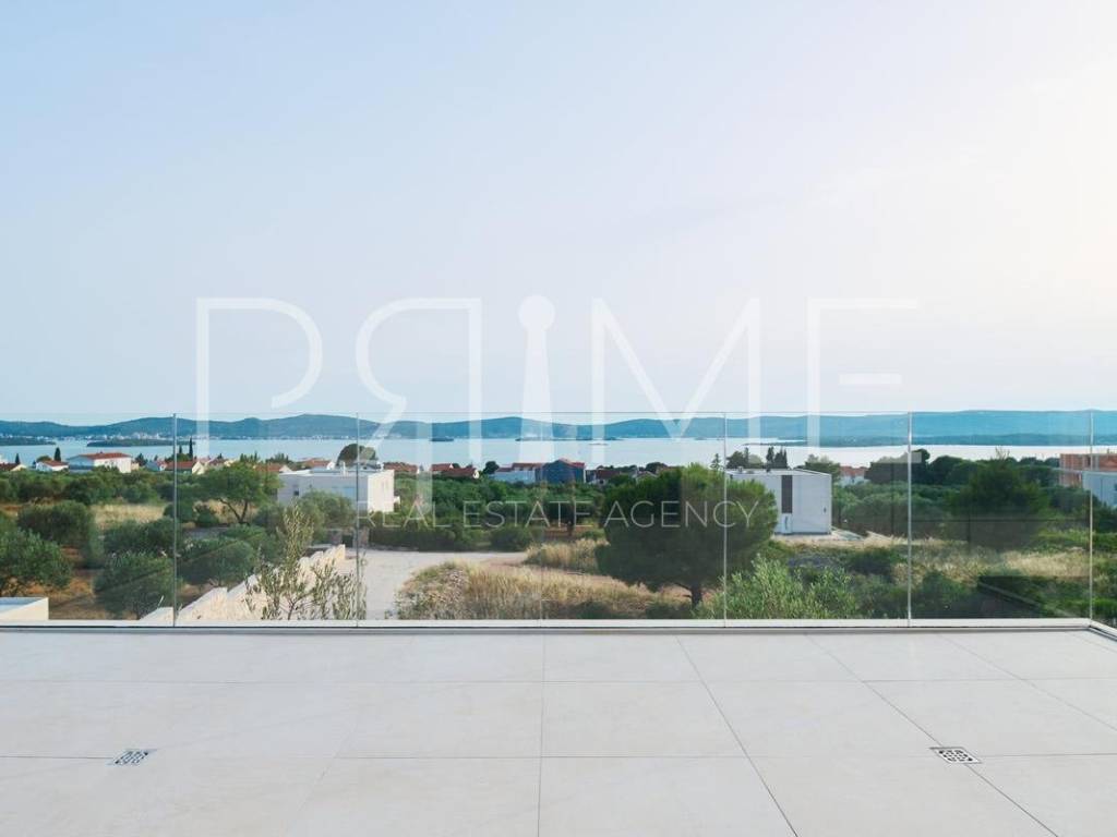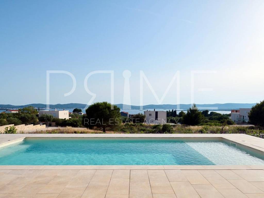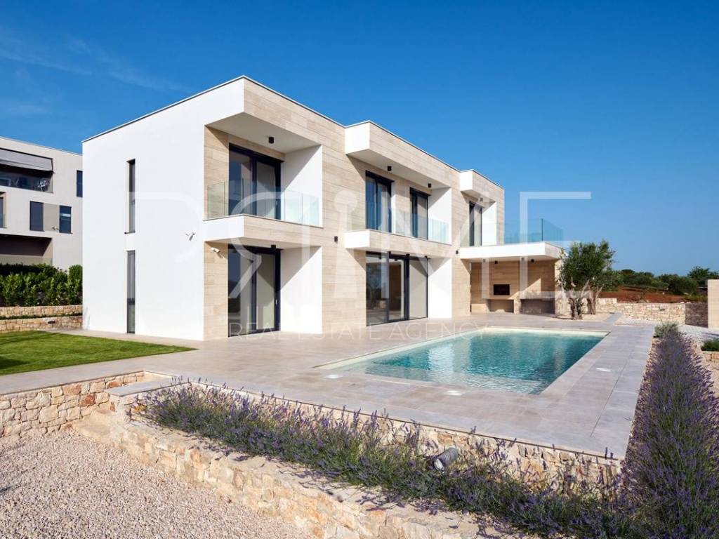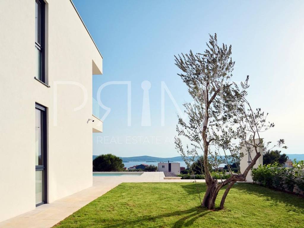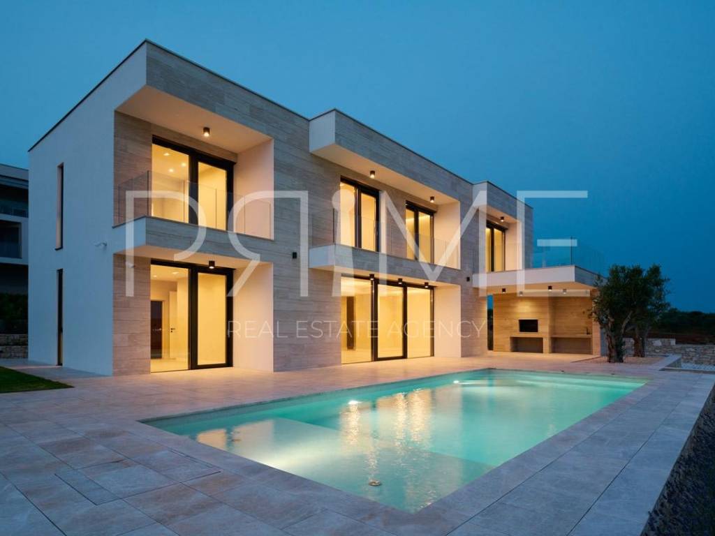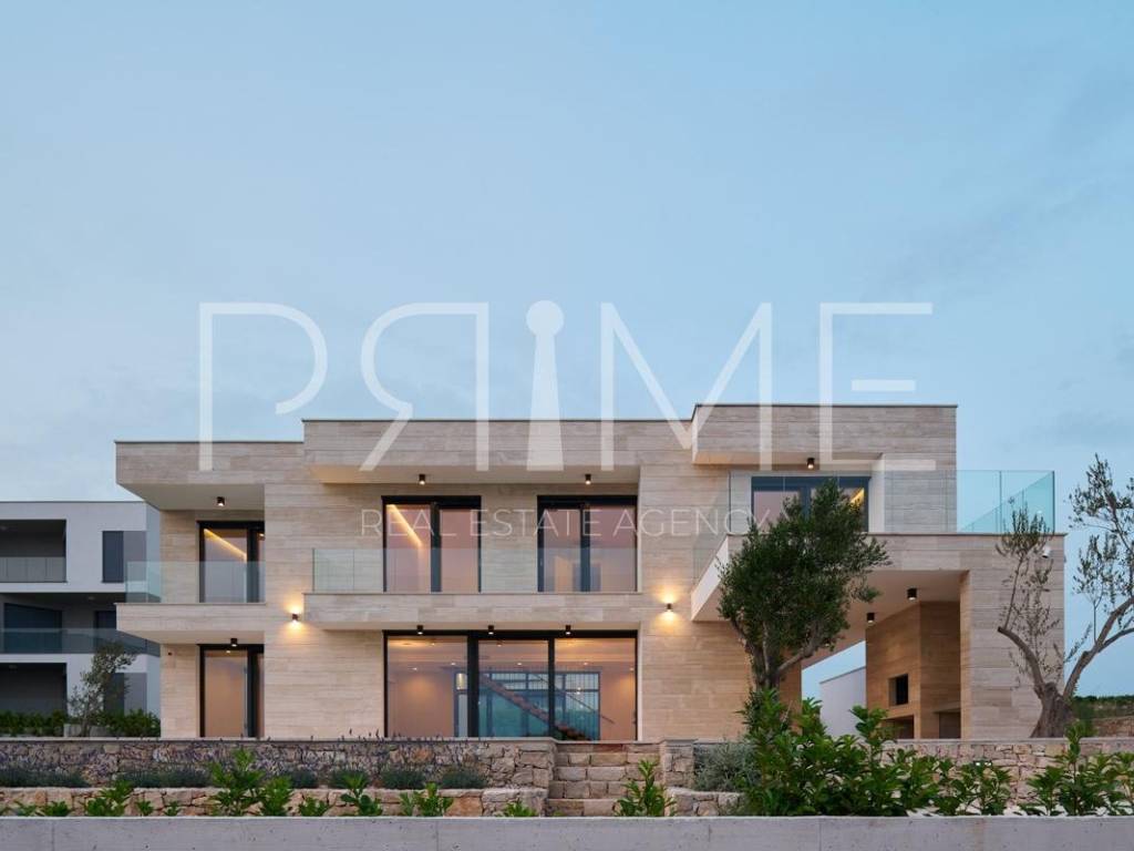 Moderna vila površine 263 m2 nalazi se na parceli površine 786 m2. Udaljenost od mora  je 550 metara. Sastoji se od dvije etaže: prizemlja i prvog kata. U prizemlju se nalaze kuhinja, blagovaona,dnevni boravak, wc, sauna, fitness, strojarnica, spremište i garaža dok se na prvome katu se nalaze 4 spavaće sobe, tri kupaonice, walk in ormar, praonica, terasa i tri balkona. U izgradnji i opremanju su korišteni isključivo najkvalitetniji materijali od renomiranih proizvođača. Vila je građena da zadovolji standarde 5* (u slučaju da se budući vlasnik želi baviti turizmom). Potpuno je klimatizirana. Ima vanjski grijani bazen površine 52 m2.  Iz vile se pruža prekrasan pogled na more . Vlasnik je pravna osoba u sustavu PDV-a tako da je kupac oslobođen poreza. Više informacija na upit!!