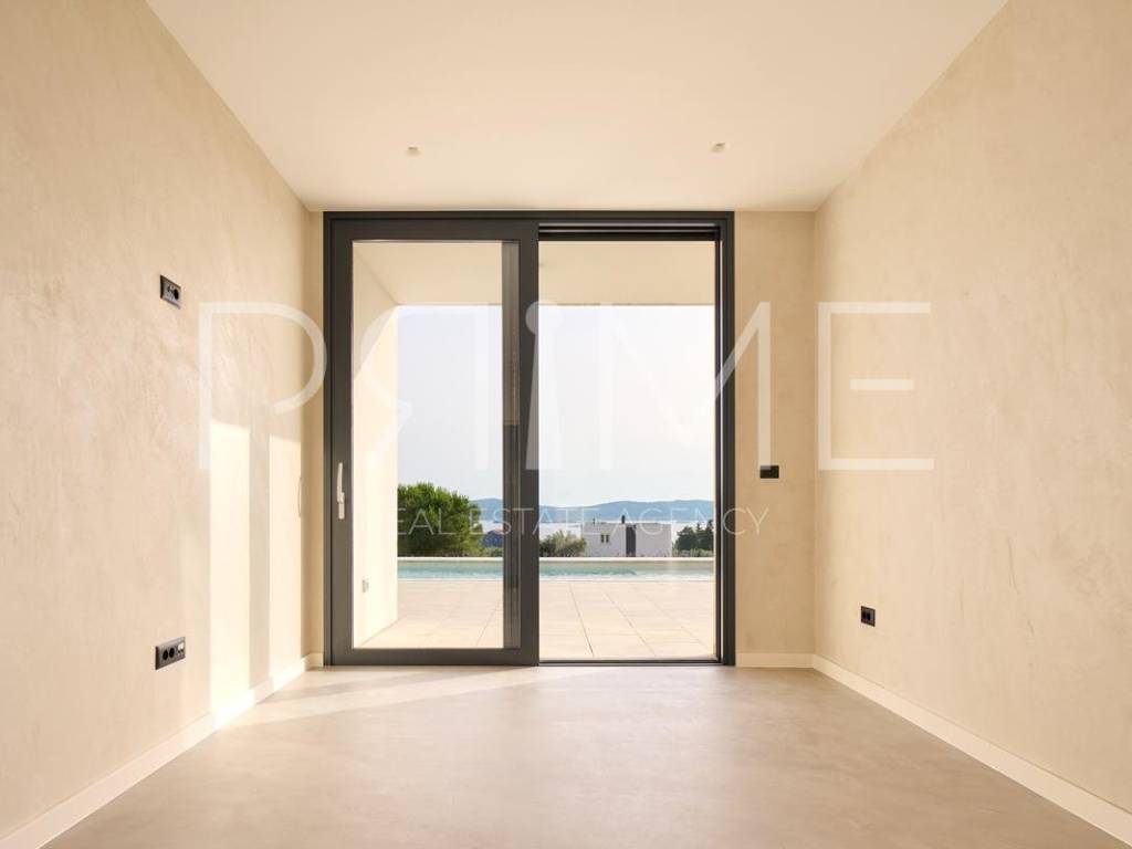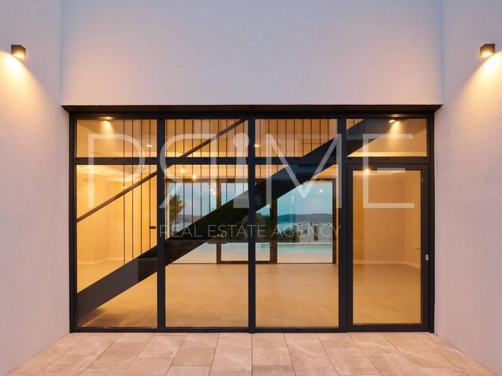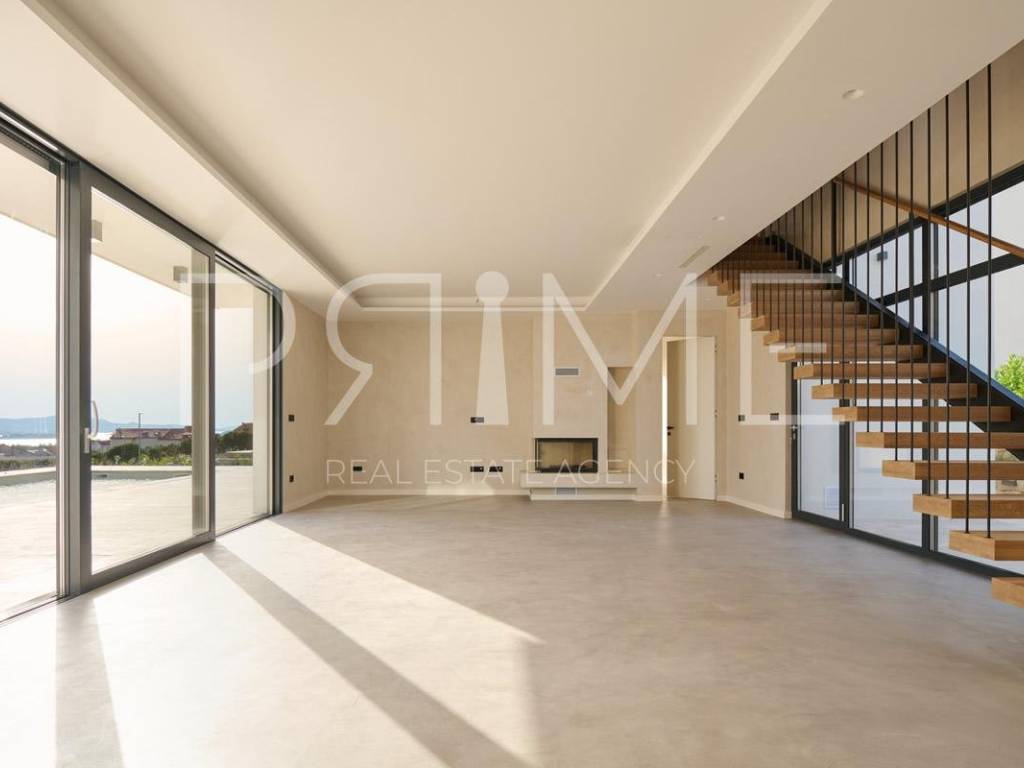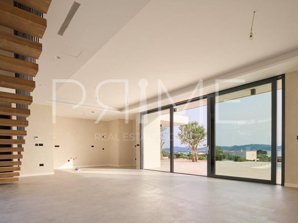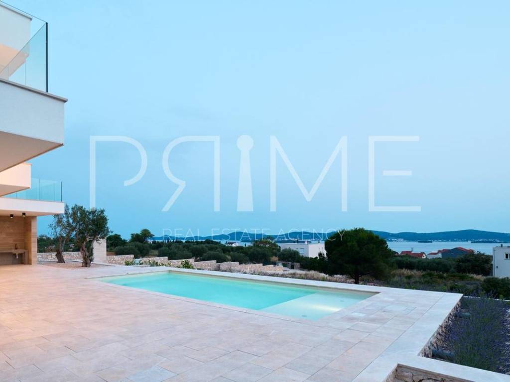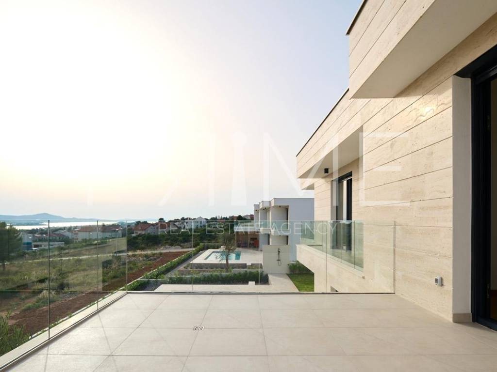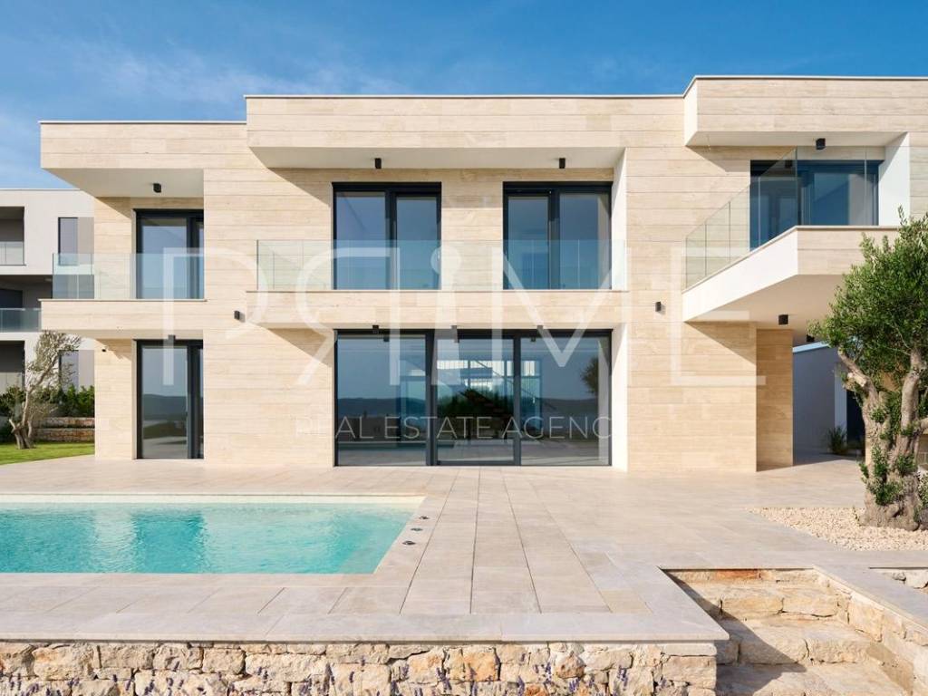 Moderna vila površine 263 m2 nalazi se na parceli površine 786 m2. Udaljenost od mora  je 550 metara. Sastoji se od dvije etaže: prizemlja i prvog kata. U prizemlju se nalaze kuhinja, blagovaona,dnevni boravak, wc, sauna, fitness, strojarnica, spremište i garaža dok se na prvome katu se nalaze 4 spavaće sobe, tri kupaonice, walk in ormar, praonica, terasa i tri balkona. U izgradnji i opremanju su korišteni isključivo najkvalitetniji materijali od renomiranih proizvođača. Vila je građena da zadovolji standarde 5* (u slučaju da se budući vlasnik želi baviti turizmom). Potpuno je klimatizirana. Ima vanjski grijani bazen površine 52 m2.  Iz vile se pruža prekrasan pogled na more . Vlasnik je pravna osoba u sustavu PDV-a tako da je kupac oslobođen poreza. Više informacija na upit!!