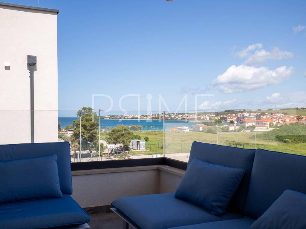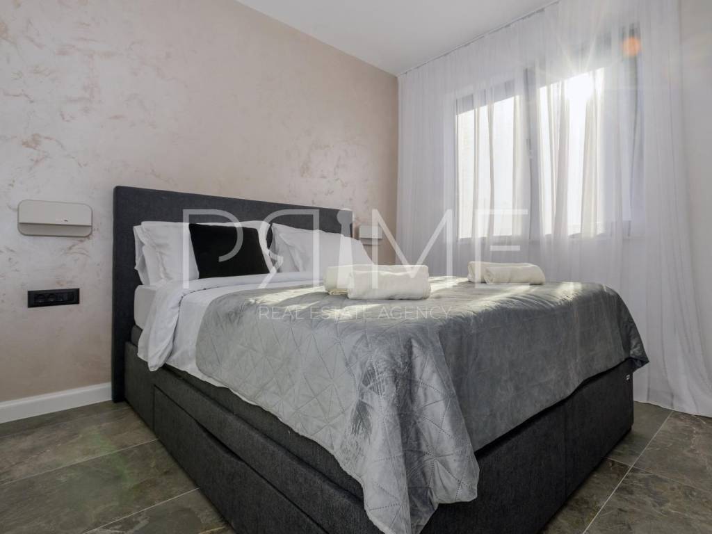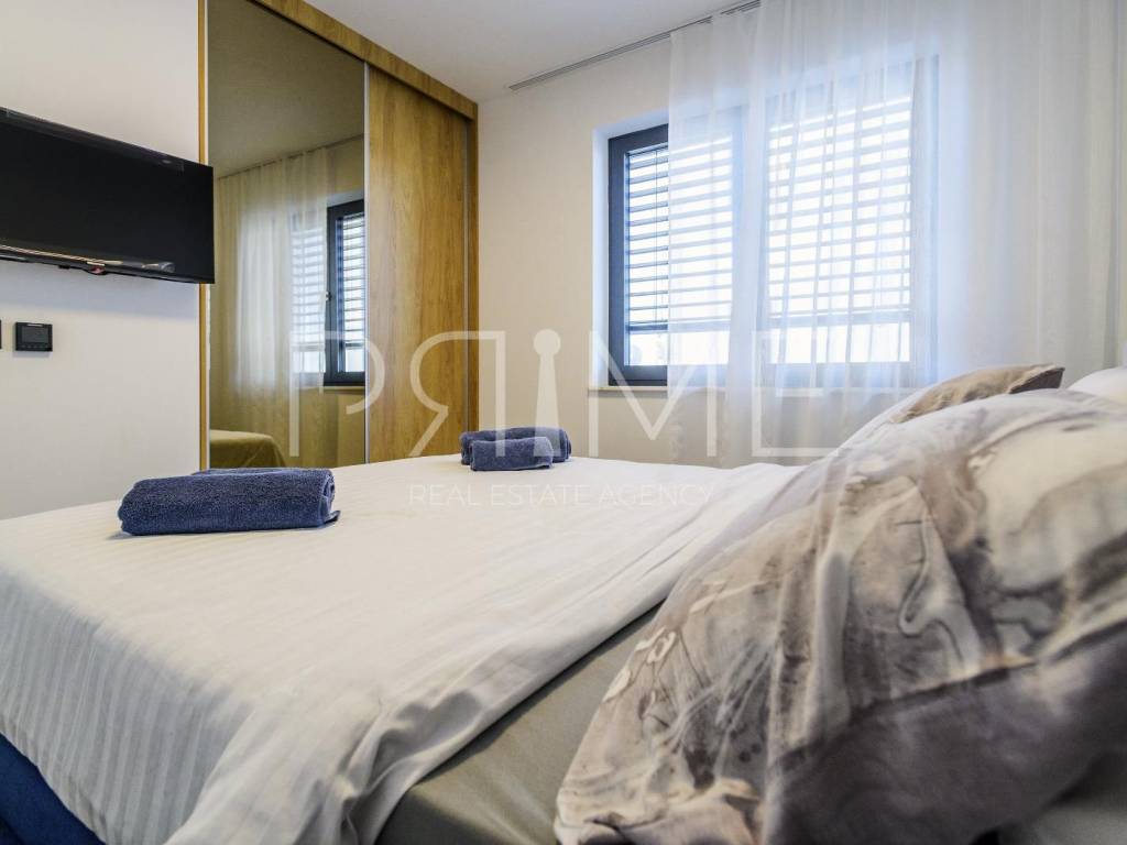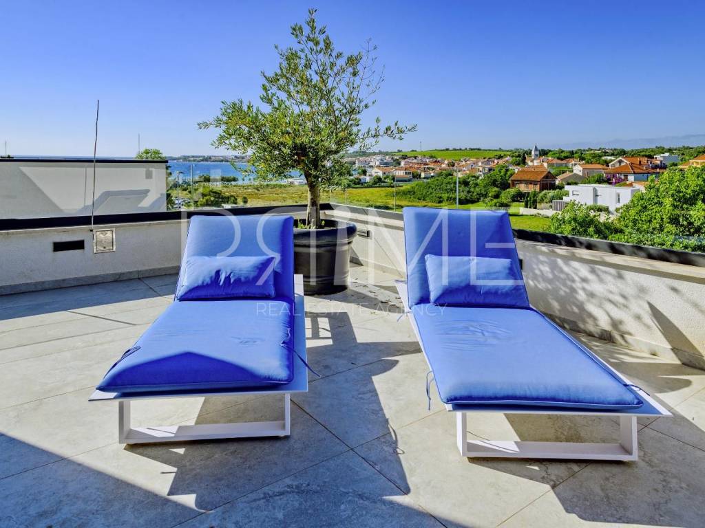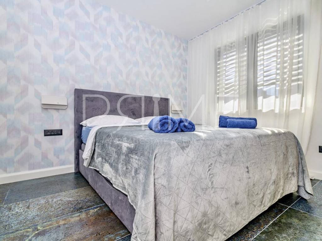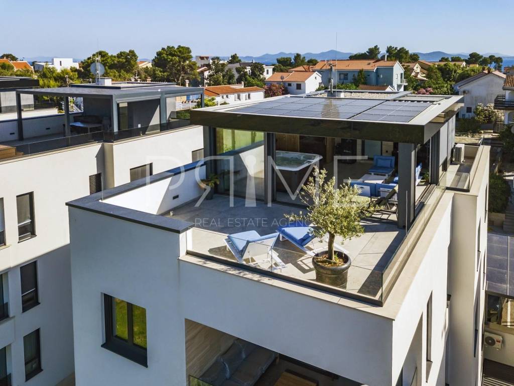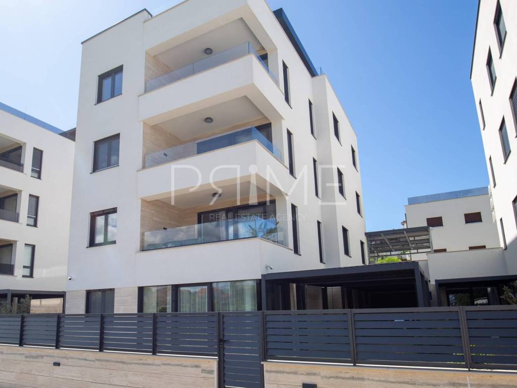 Novoizgrađena zgrada površine 414 m2 sastoji se od 7 stambenih jedinica. Nalazi se na odličnoj lokaciji udaljenoj od mora i prekrasne plaže 150 metara. U prizemlju se nalaze četiri stambene jedinice odnosno jedan dvosoban stan i tri jednosobna stana (garsonijere). Svi stanovi u prizemlju imaju izlaz na dvorište koje je potpuno uređeno i djelomično natkriveno pergolama. Na prvome, drugom i trećem katu se nalaze trosobni stanovi svaki korisne površine 90 m2 ( tlocrtne površine 114 m2). U izgradnji i opremanju su korišteni isključivo najkvalitetniji materijali od renomiranih proizvođača. Zgrada se prodaje se kompletno namještena i opremljena. Svi stanovi su dizajnerski namješteni i opremljeni i nisu korišteni. U potpunosti je klimatizirana (svaka soba ima svoju jedinicu), podno grijanje kroz cijelu zgradu...Na krovnoj terasi se nalazi wellness s saunom jacuzzijem, kupaonicom, prostorom za druženje....