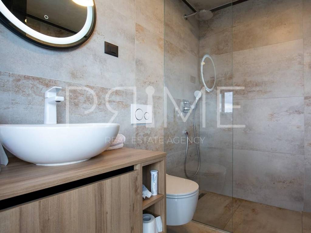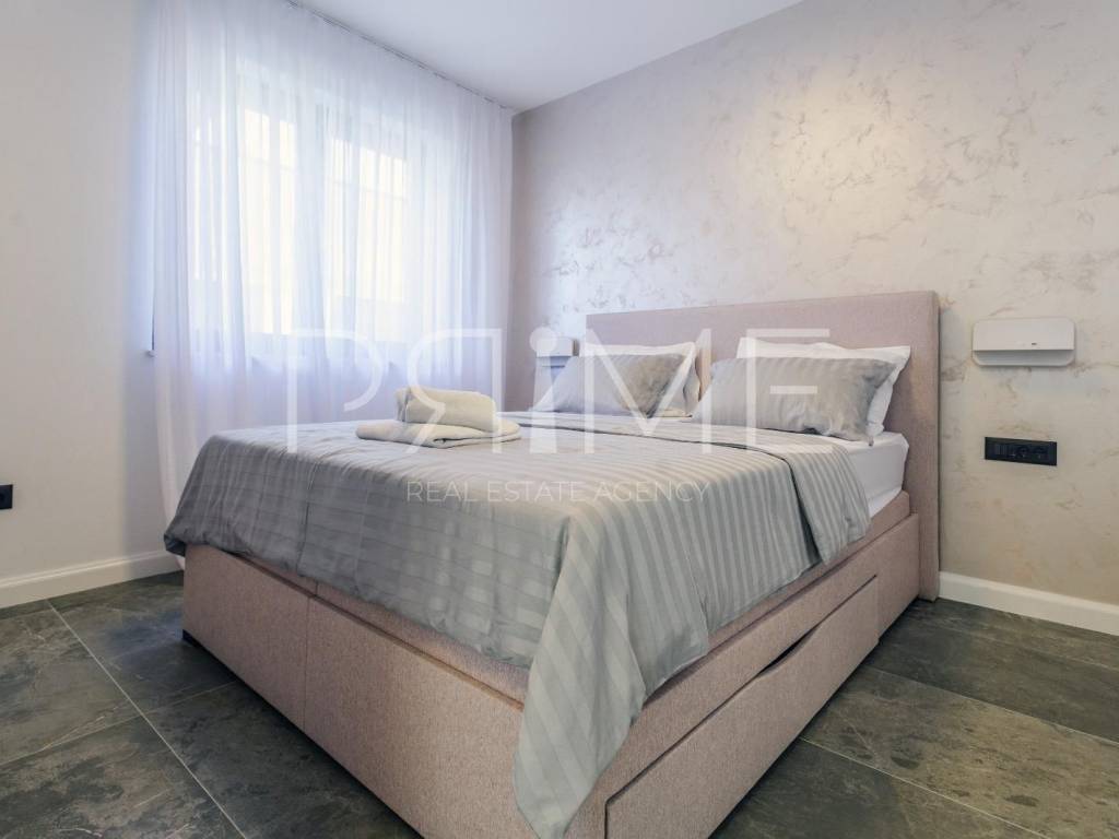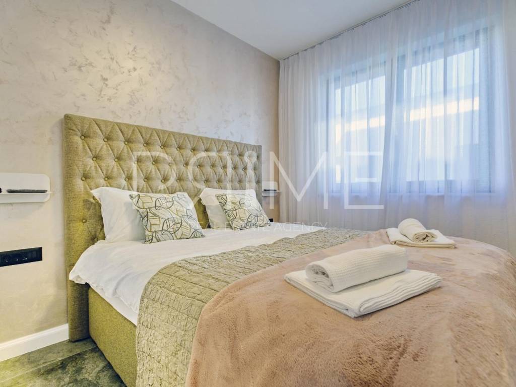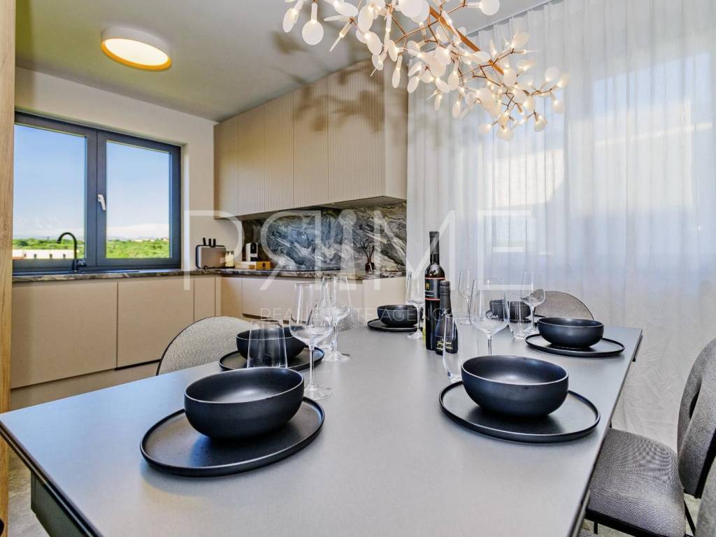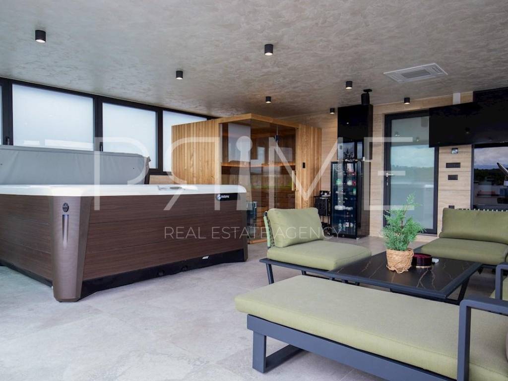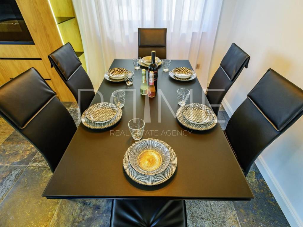 Novoizgrađena zgrada površine 414 m2 sastoji se od 7 stambenih jedinica. Nalazi se na odličnoj lokaciji udaljenoj od mora i prekrasne plaže 150 metara. U prizemlju se nalaze četiri stambene jedinice odnosno jedan dvosoban stan i tri jednosobna stana (garsonijere). Svi stanovi u prizemlju imaju izlaz na dvorište koje je potpuno uređeno i djelomično natkriveno pergolama. Na prvome, drugom i trećem katu se nalaze trosobni stanovi svaki korisne površine 90 m2 ( tlocrtne površine 114 m2). U izgradnji i opremanju su korišteni isključivo najkvalitetniji materijali od renomiranih proizvođača. Zgrada se prodaje se kompletno namještena i opremljena. Svi stanovi su dizajnerski namješteni i opremljeni i nisu korišteni. U potpunosti je klimatizirana (svaka soba ima svoju jedinicu), podno grijanje kroz cijelu zgradu...Na krovnoj terasi se nalazi wellness s saunom jacuzzijem, kupaonicom, prostorom za druženje....