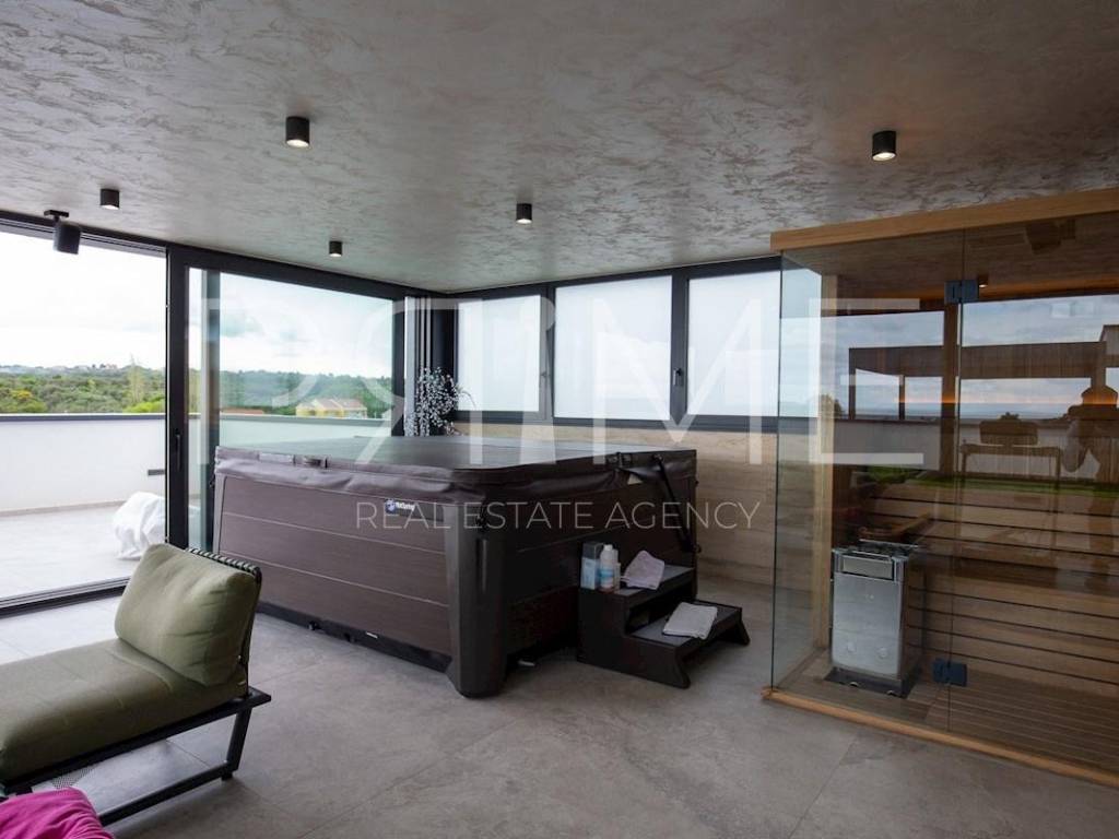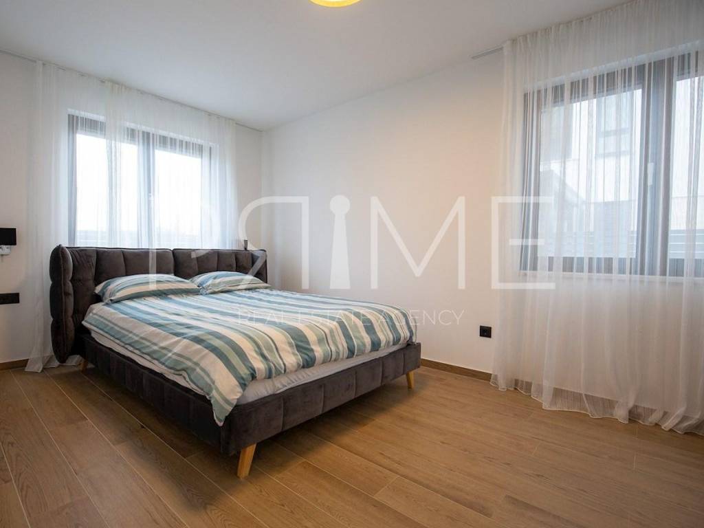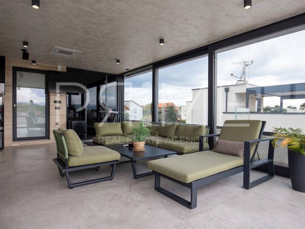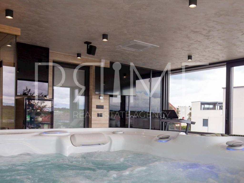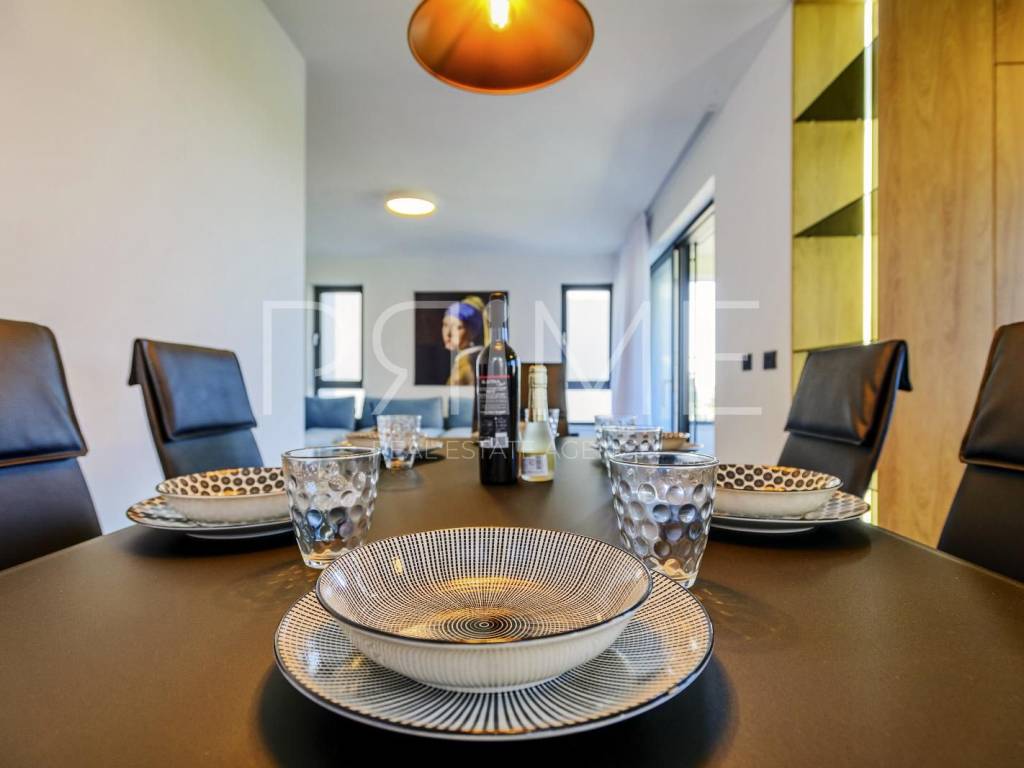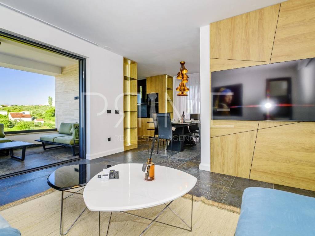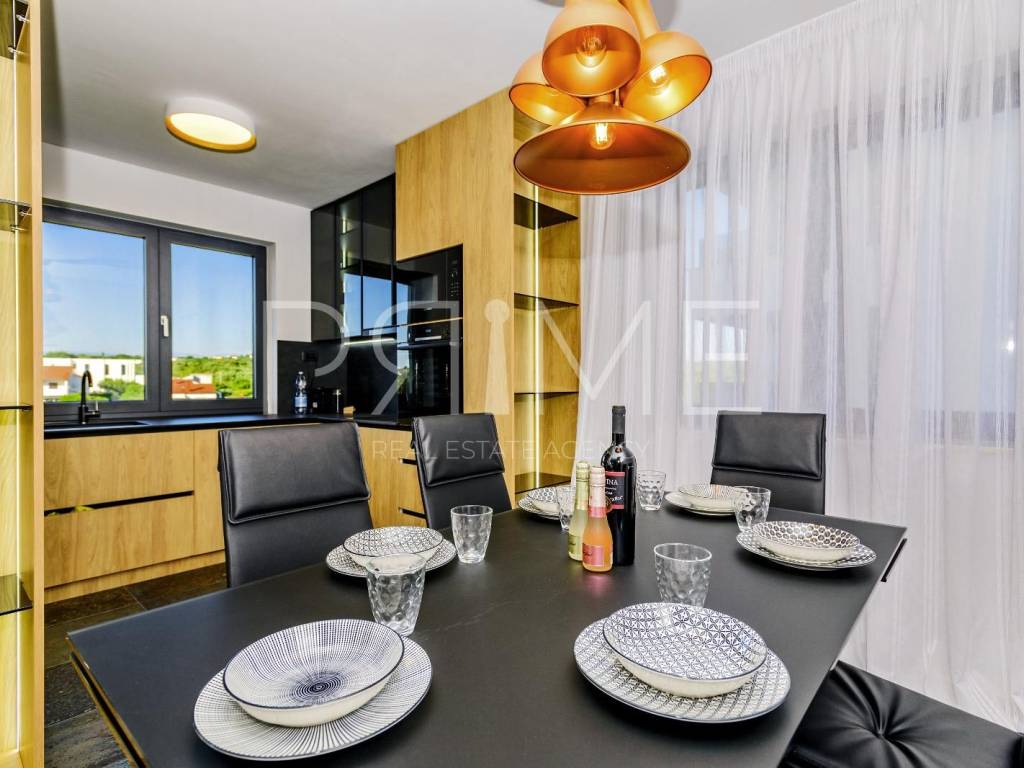 Novoizgrađena zgrada površine 414 m2 sastoji se od 7 stambenih jedinica. Nalazi se na odličnoj lokaciji udaljenoj od mora i prekrasne plaže 150 metara. U prizemlju se nalaze četiri stambene jedinice odnosno jedan dvosoban stan i tri jednosobna stana (garsonijere). Svi stanovi u prizemlju imaju izlaz na dvorište koje je potpuno uređeno i djelomično natkriveno pergolama. Na prvome, drugom i trećem katu se nalaze trosobni stanovi svaki korisne površine 90 m2 ( tlocrtne površine 114 m2). U izgradnji i opremanju su korišteni isključivo najkvalitetniji materijali od renomiranih proizvođača. Zgrada se prodaje se kompletno namještena i opremljena. Svi stanovi su dizajnerski namješteni i opremljeni i nisu korišteni. U potpunosti je klimatizirana (svaka soba ima svoju jedinicu), podno grijanje kroz cijelu zgradu...Na krovnoj terasi se nalazi wellness s saunom jacuzzijem, kupaonicom, prostorom za druženje....