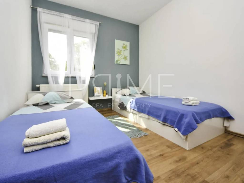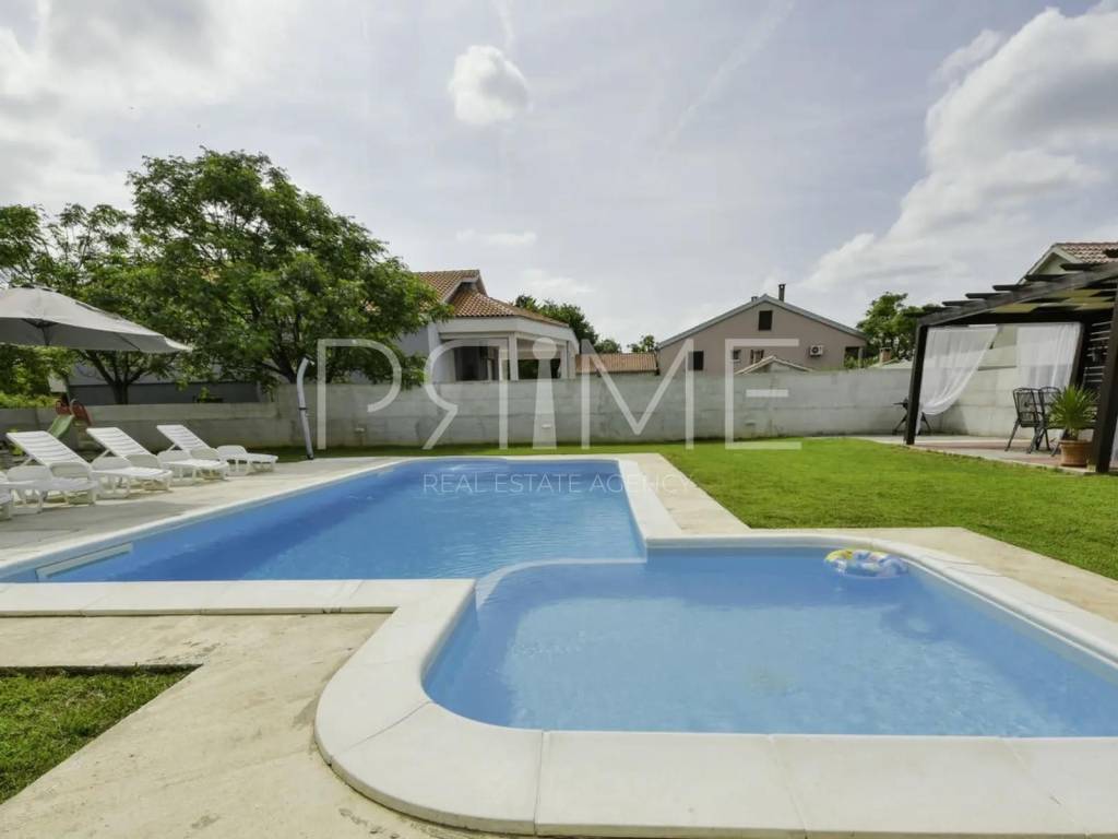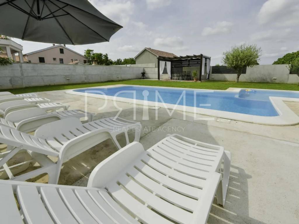 Kuća površine 209 m2 nalazi se na parceli površine 1093 m2. Sastoji se od kuhinje, blagovaone, dnevnog boravka, tri spavaće sobe ( jedna s vlastitom kupaonicom), dvije kupaonice, balkona i natkrivene terase. Kuća ima i veliku podrumsku etažu u sklopu koje se nalaze garaža, konoba, spremište i kotlovnica za bazen. Ima vanjski bazen površine 36 m2. Prodaje se namještena i opremljena kao na slikama. Nalazi se na mirnoj lokaciji okružena prirodom i sličnim objektima odnosno vilama s bazenom. Najbliža plaža je udaljena 9 km dok je Zadar udaljen 20 km a zračna luka Zadar 11 km. Više informacija na upit.