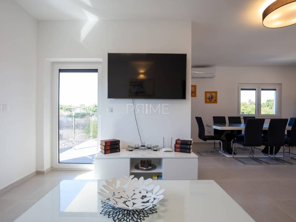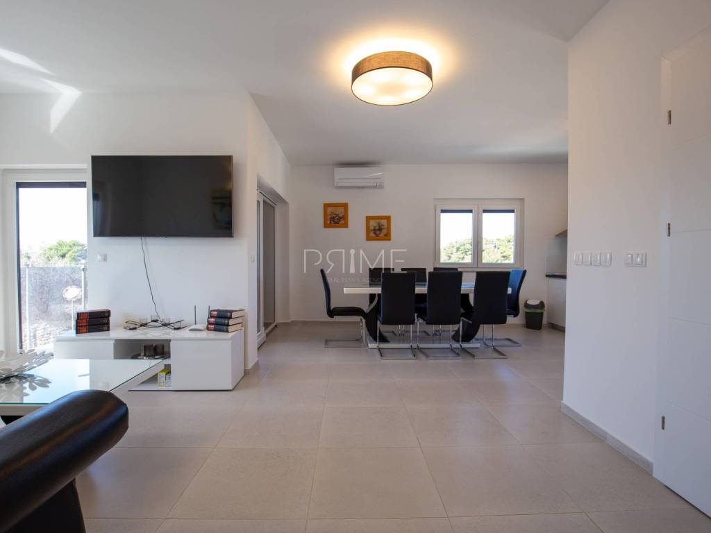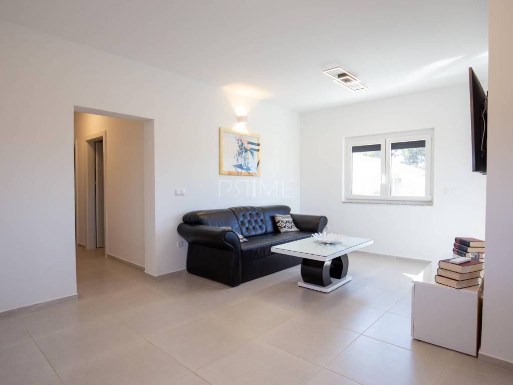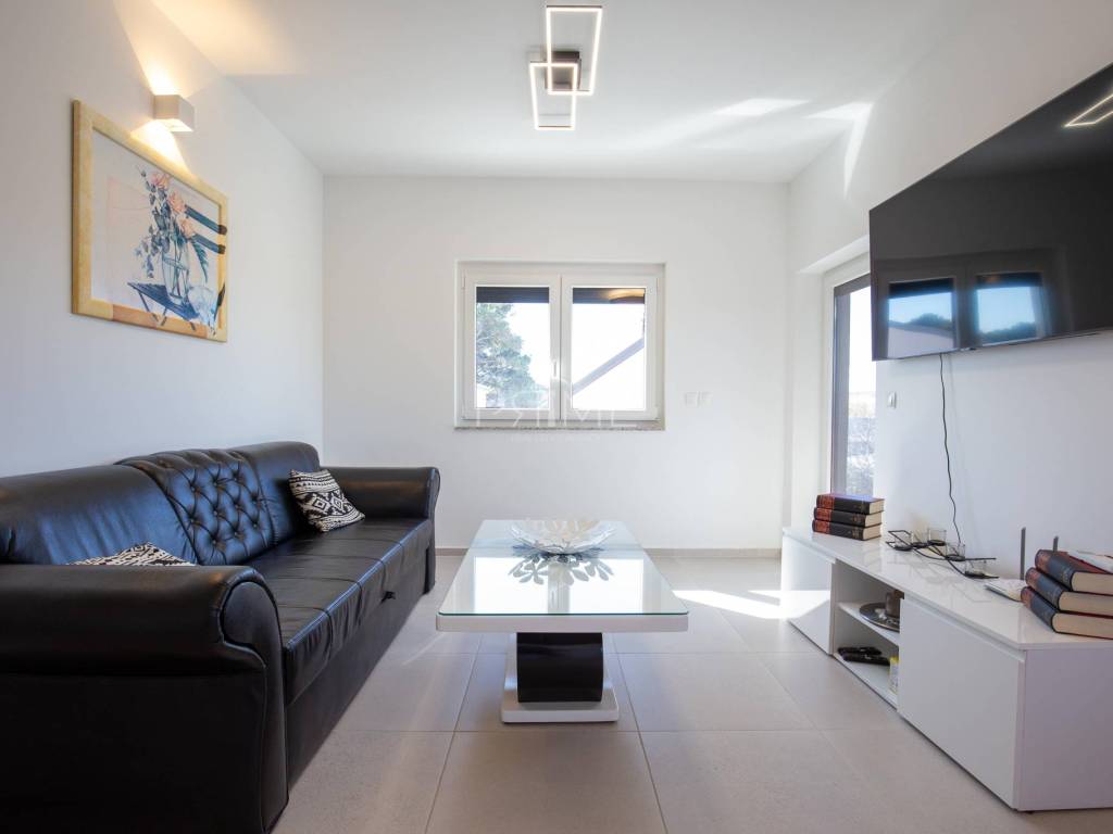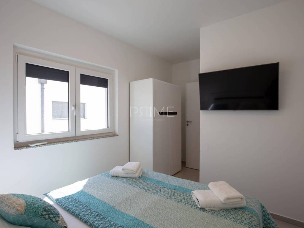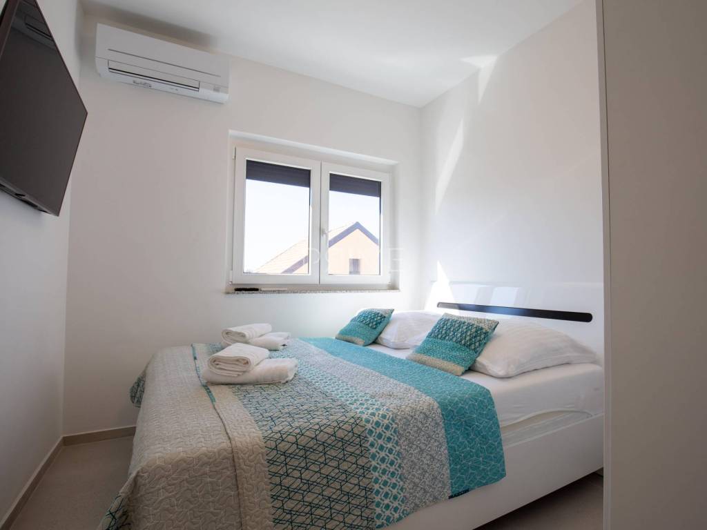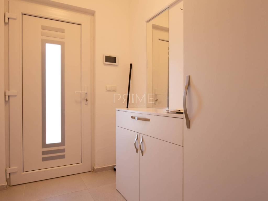 Stan površine 85,7 m2 sastoji se od kuhinje, blagovaone, dnevnog boravka, kupaone, wc-a, tri spavaće sobe, hodnika i natkrivene terase. Pripadci stanu su dva vanjska parkirna mjesta. Stan se prodaje kompletno namješten i opremljen kao na slikama. Nalazi se na mirnoj lokaciji u blizini centra mjesta, udaljenost od mora je nekih 500 metara. Zgrada se sastoji od 4 stambene jedinice. Više informacija na upit!