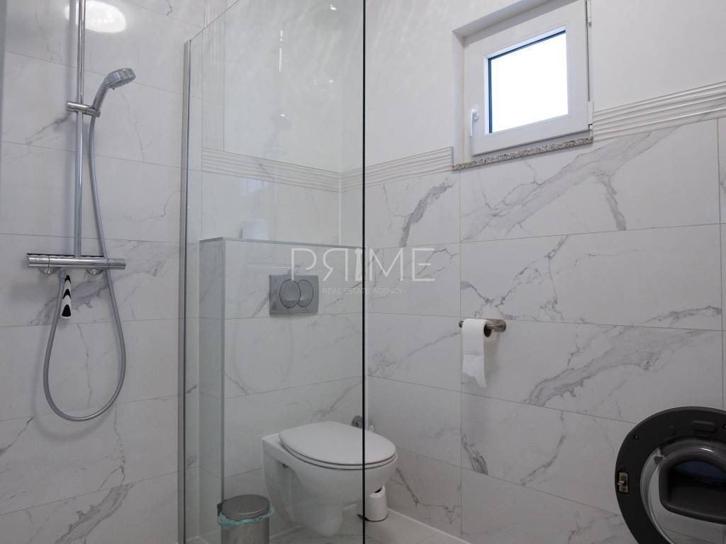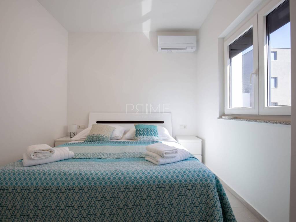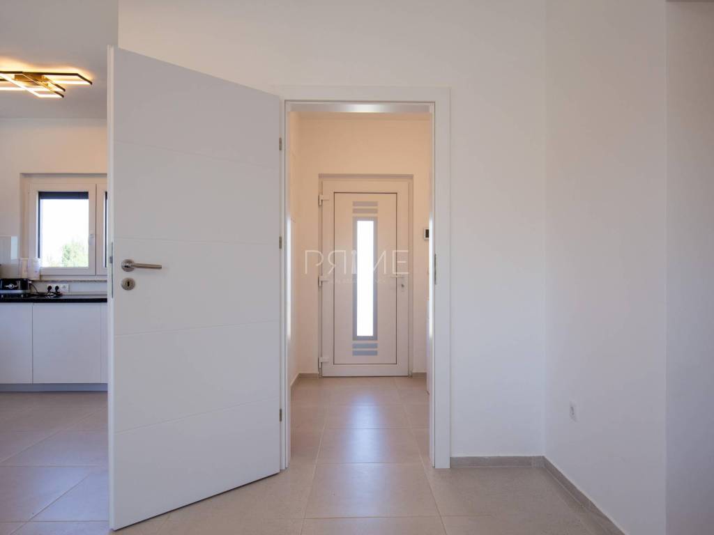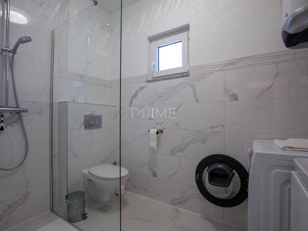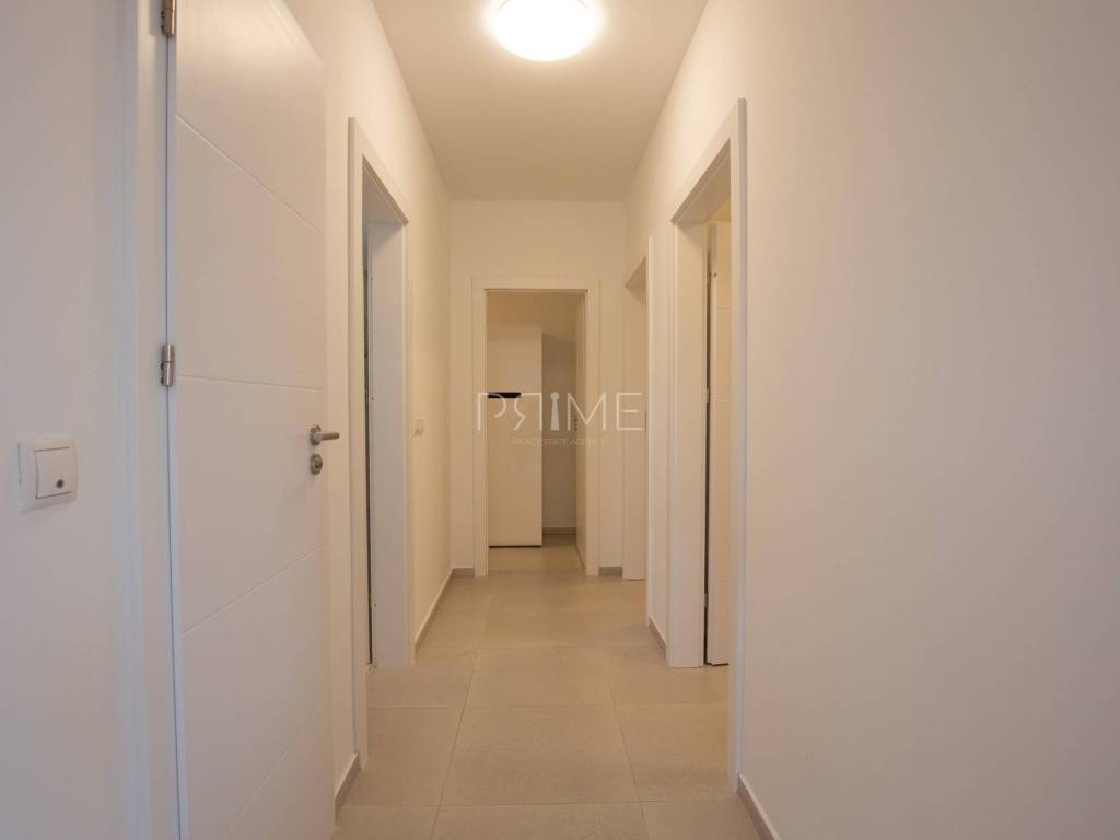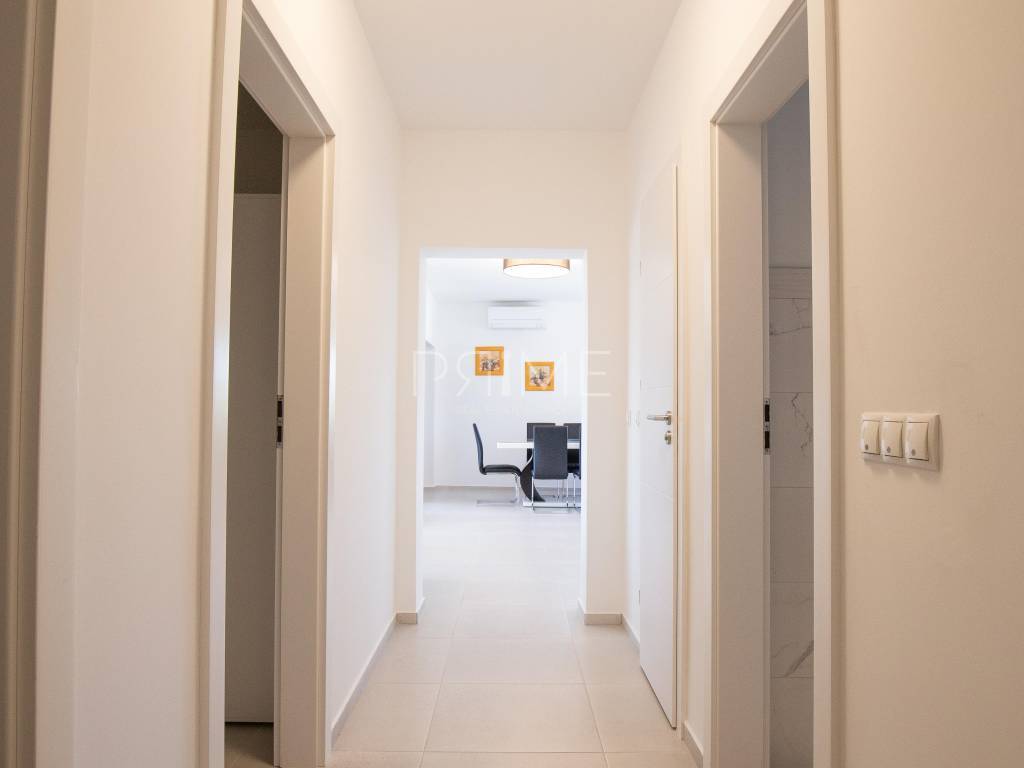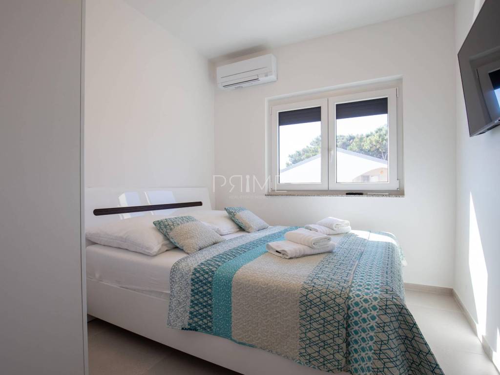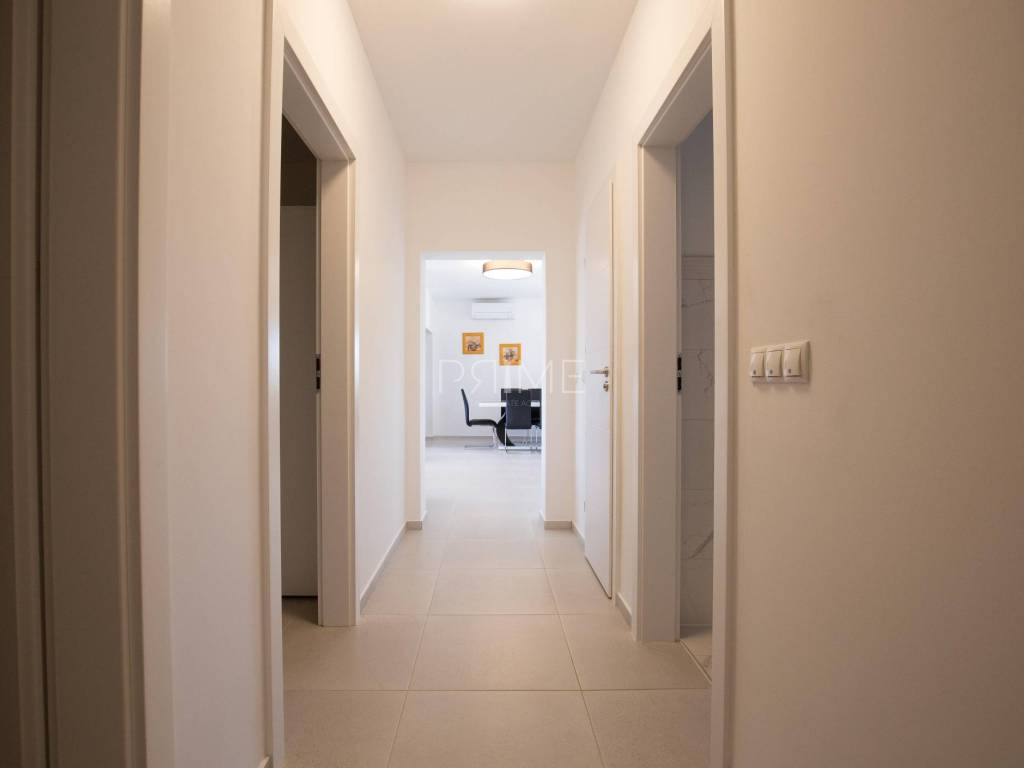 Stan površine 85,7 m2 sastoji se od kuhinje, blagovaone, dnevnog boravka, kupaone, wc-a, tri spavaće sobe, hodnika i natkrivene terase. Pripadci stanu su dva vanjska parkirna mjesta. Stan se prodaje kompletno namješten i opremljen kao na slikama. Nalazi se na mirnoj lokaciji u blizini centra mjesta, udaljenost od mora je nekih 500 metara. Zgrada se sastoji od 4 stambene jedinice. Više informacija na upit!