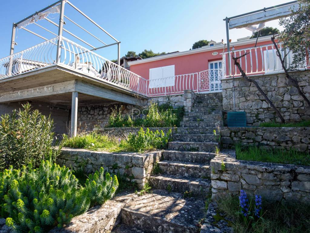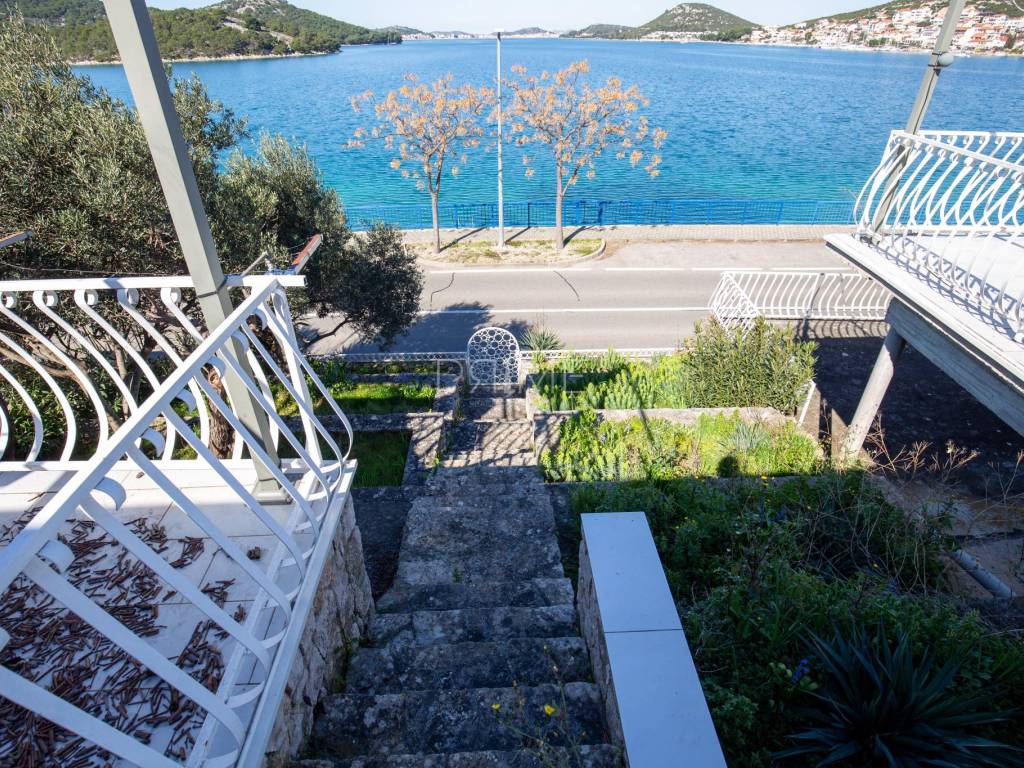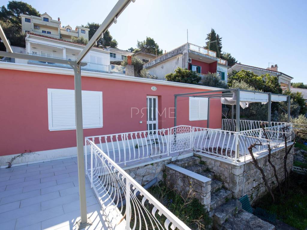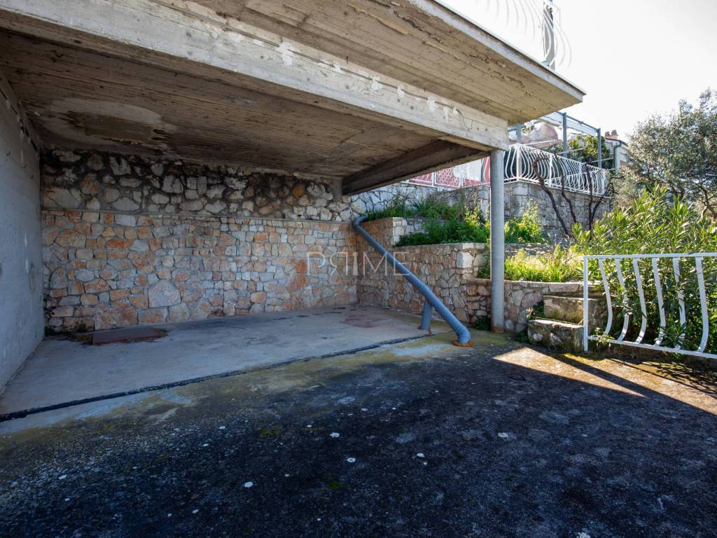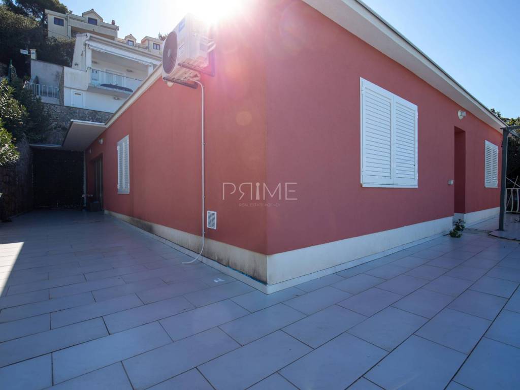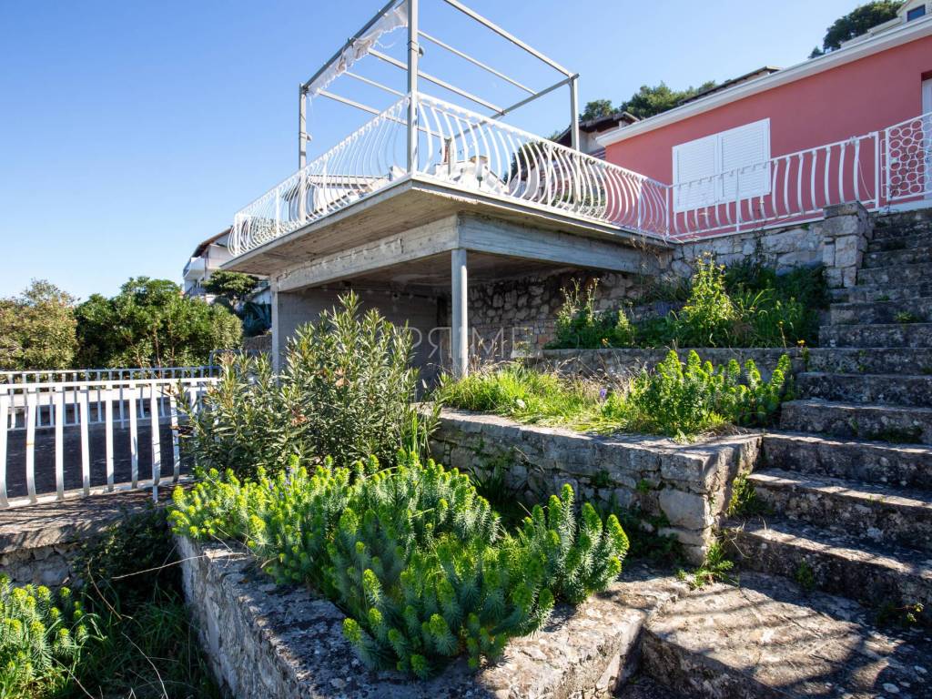 Kuća površine 164 m2 nalazi se na parceli površine 400 m2 a sastoji se od kuhinje, blagovaone, dnevnog boravka, dvije kupaone i četiri spavaće sobe. Ima tri velike terase i garažu površine 49 m2. nalazi se na jedinstvenoj lokaciji prvi red do mora i uređene plaže ( između kuće i mora je cesta). Kuća ima ogroman potencijal jer je moguće izgraditi još dvije etaže. Renovirana je 2018 godine. Iz cijele kuće se pruža panoramski pogled na more. Više informacija na upit.