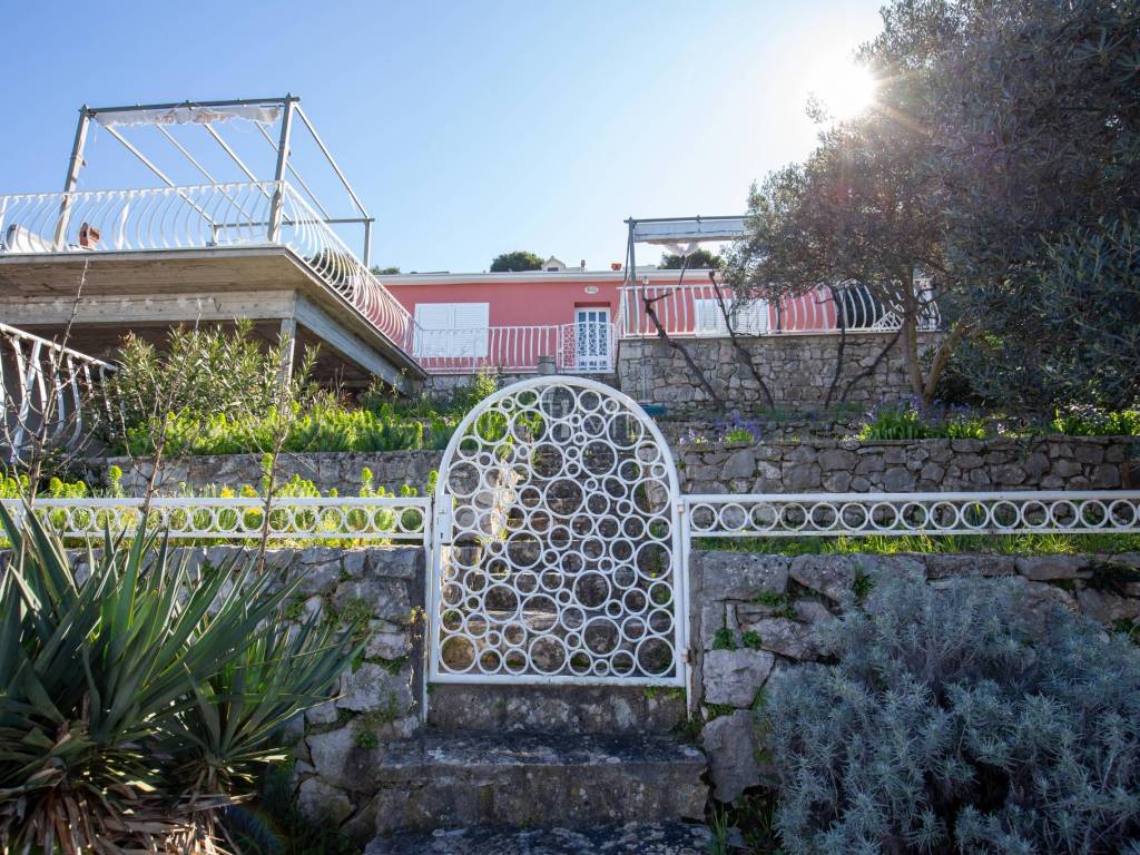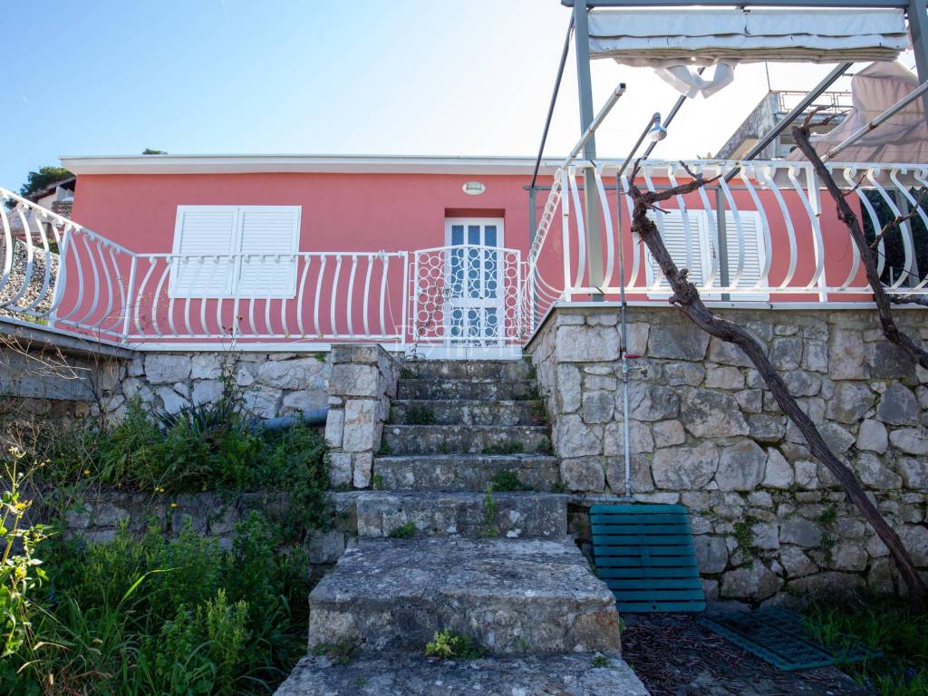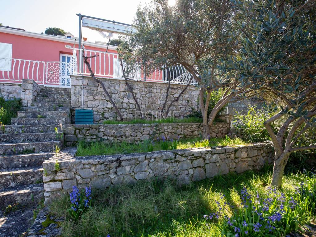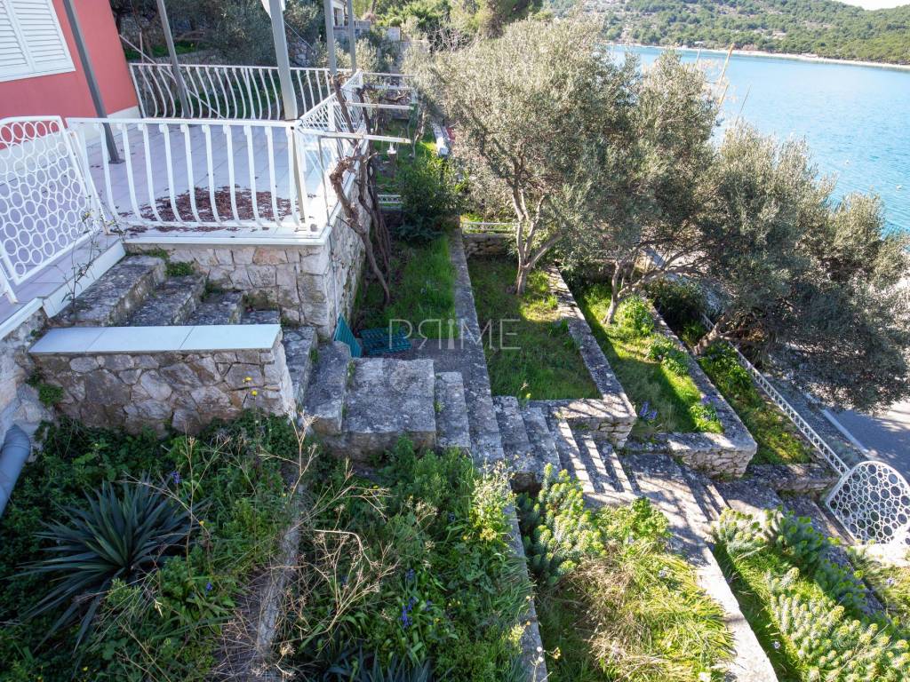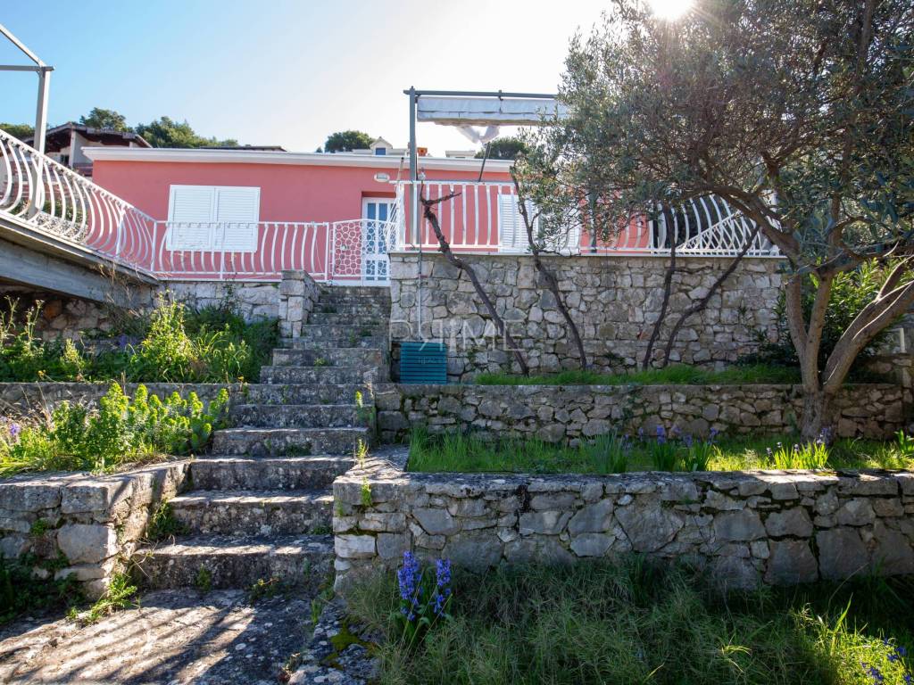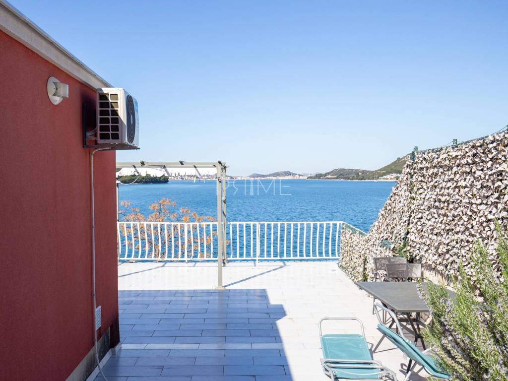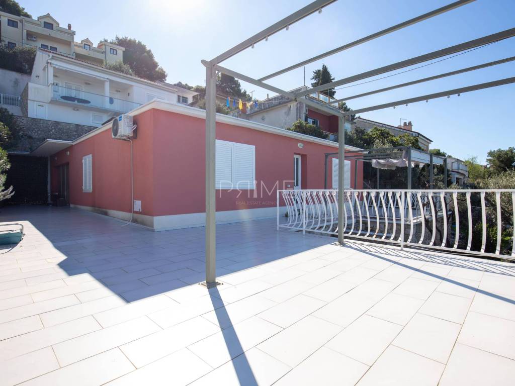 Kuća površine 164 m2 nalazi se na parceli površine 400 m2 a sastoji se od kuhinje, blagovaone, dnevnog boravka, dvije kupaone i četiri spavaće sobe. Ima tri velike terase i garažu površine 49 m2. nalazi se na jedinstvenoj lokaciji prvi red do mora i uređene plaže ( između kuće i mora je cesta). Kuća ima ogroman potencijal jer je moguće izgraditi još dvije etaže. Renovirana je 2018 godine. Iz cijele kuće se pruža panoramski pogled na more. Više informacija na upit.