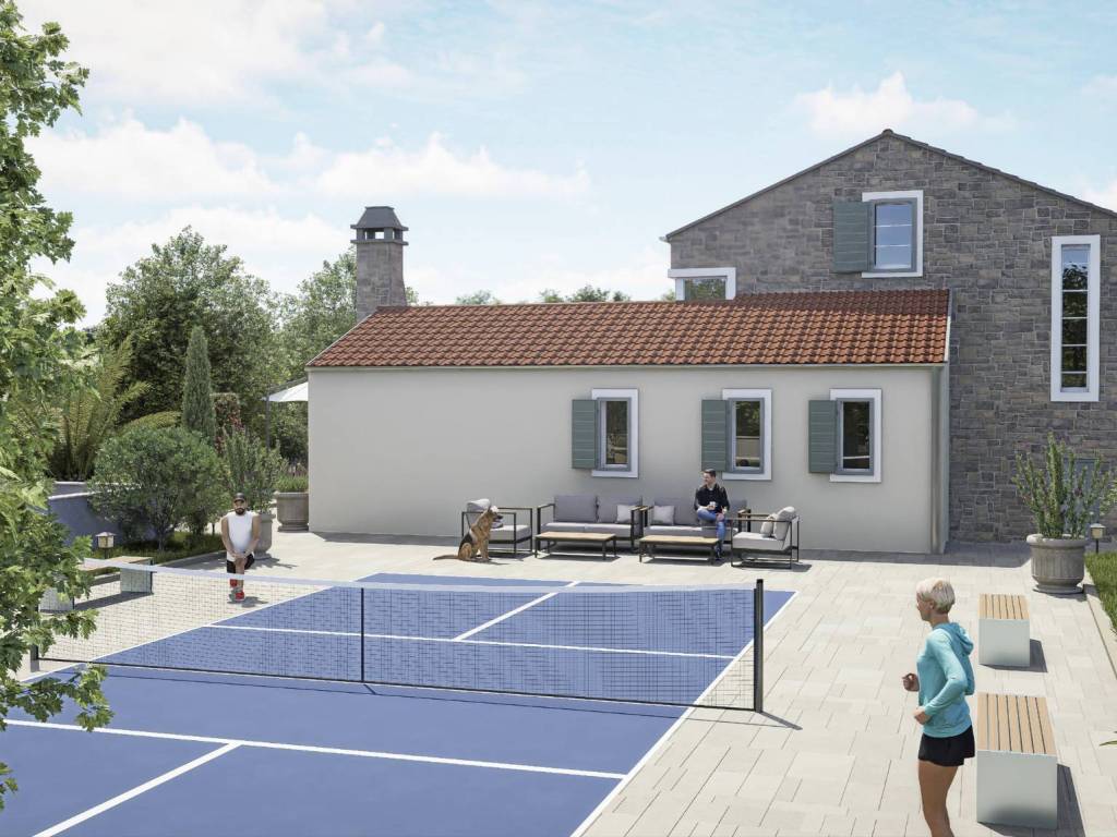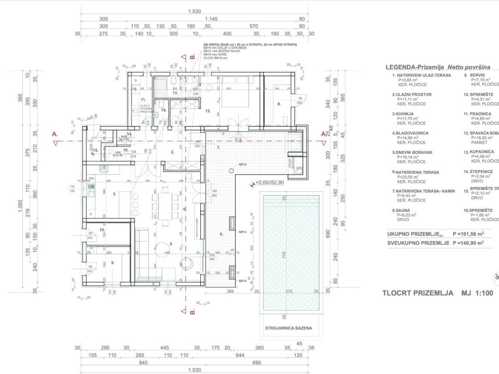 PRIZEMLJE: sastoji se od kuhinje, blagovaone, dnevnog boravka, dvije kupaone, wc-a, spavaće sobe, saune, vanjske kuhinje i velike terase.